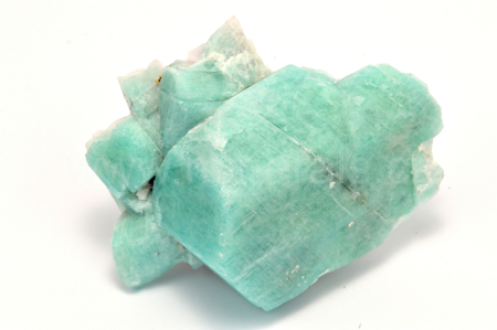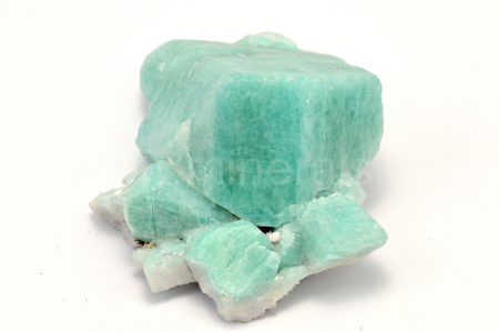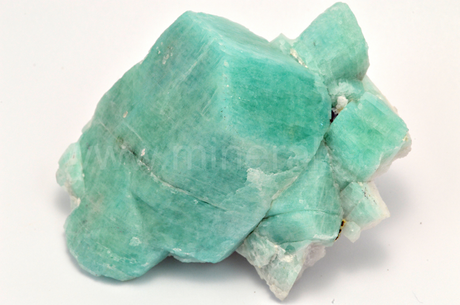 Amazonit (modrozelená odrůda draselného živce mikroklinu) vytváří sytě modrozelené, skelně lesklé, částečně průsvitné, pěkně ohraničené krystaly dosahující velikosti až 43 mm, které se vzájemně prorůstají. Podotýkám, že díky různým typům monitorů a osvětlení se může odstín amazonitu lišit.