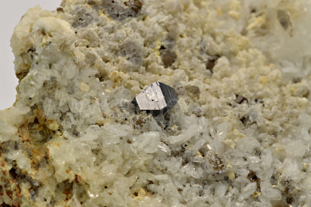 Anatas vytváří temně hnědý, pohledově šedočerný, polokovově až skelně lesklý, částečně průsvitný, podélně rýhovaný, pěkně ukončený krystal dosahující velikosti cca 4 mm, který narůstá na světlou podložku spolu s drobnými, mléčně bílými krystaly albitu.