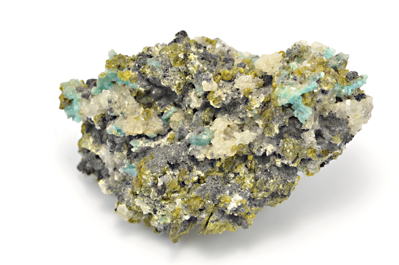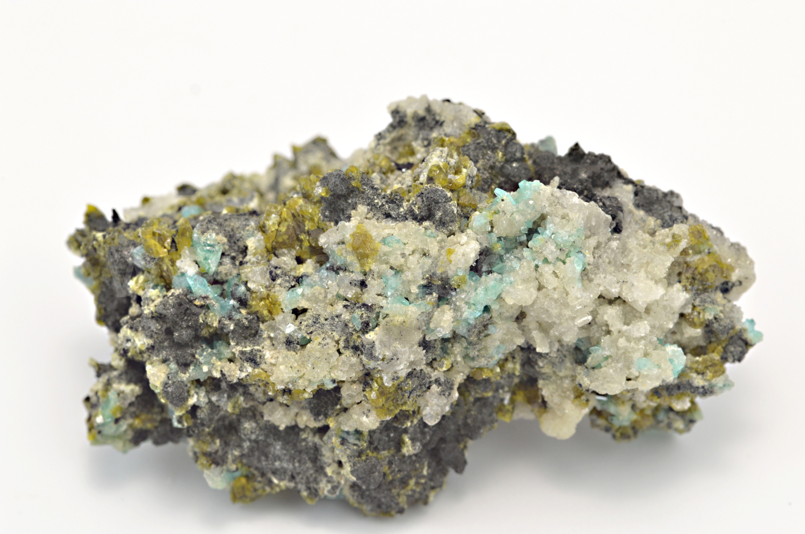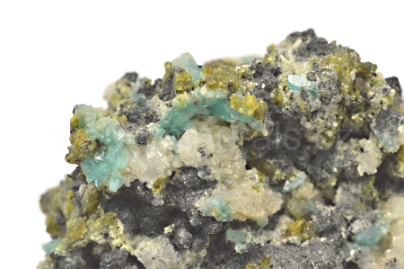 Borcarit vytváří světle zelenomodré, skelně lesklé, průsvitné, občas oboustranně ukončené, protažené krystaly dosahující velikosti až 2 mm které zarůstají mezi bezbarvé, bělavé, hrubozrnné a masivní agregáty nifontovitu a prorůstají celým vzorkem. Oboustranný vzorek. Podotýkám, že díky různým typům monitorů a osvětlení se může odstín na fotografiích mírně lišit. Borcarit na denním světle je mnohem tmavší než na fotografiích.
