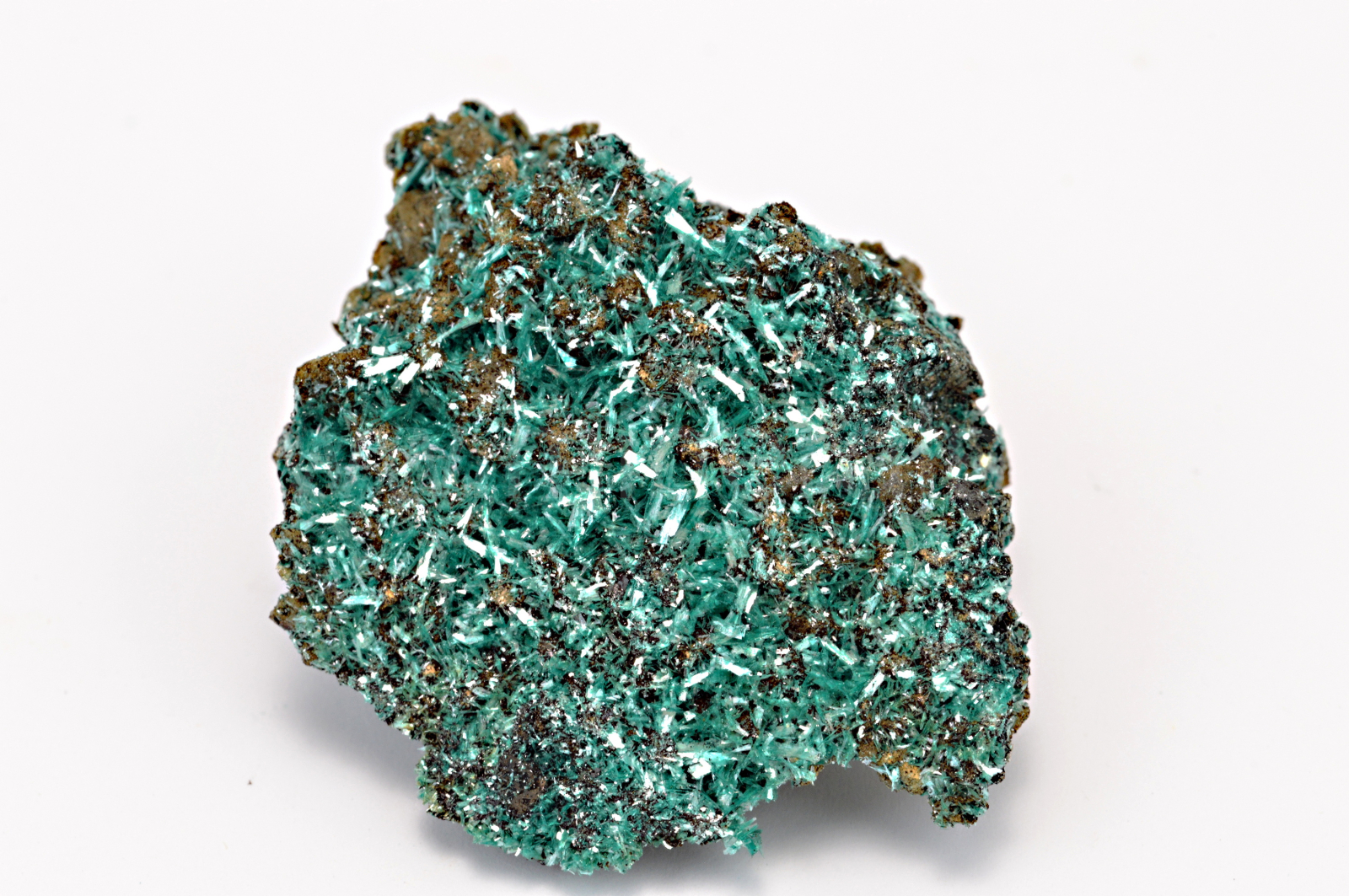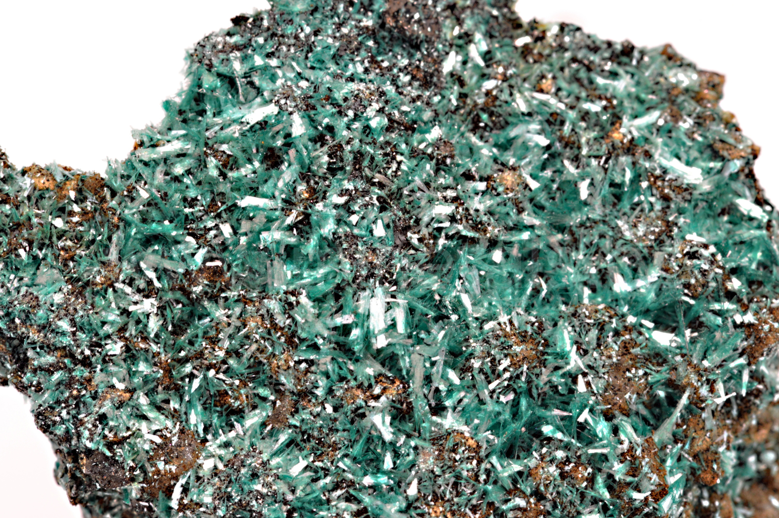 Botallackit vytváří smaragdově temně zelené, hedvábně až perleťově lesklé, průsvitné, protažené, lístkovité a tence tabulkovité dosahující velikosti až 5 mm, které prorůstají celým vzorkem. Velmi kvalitní malý vzorek.