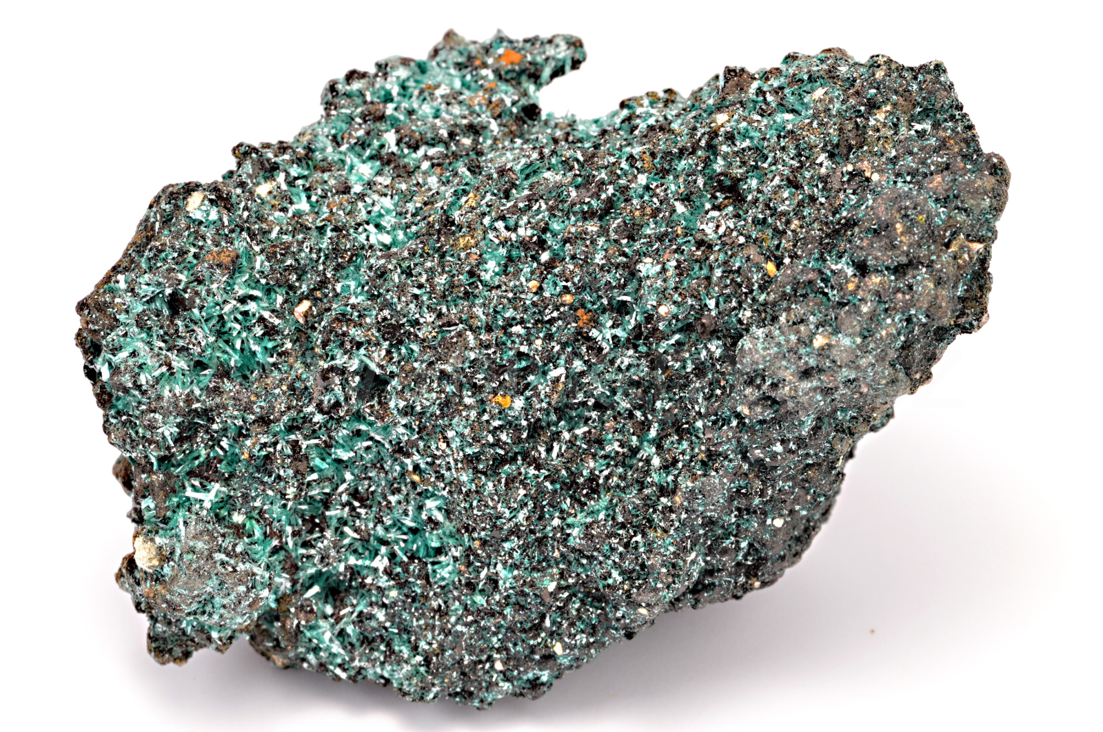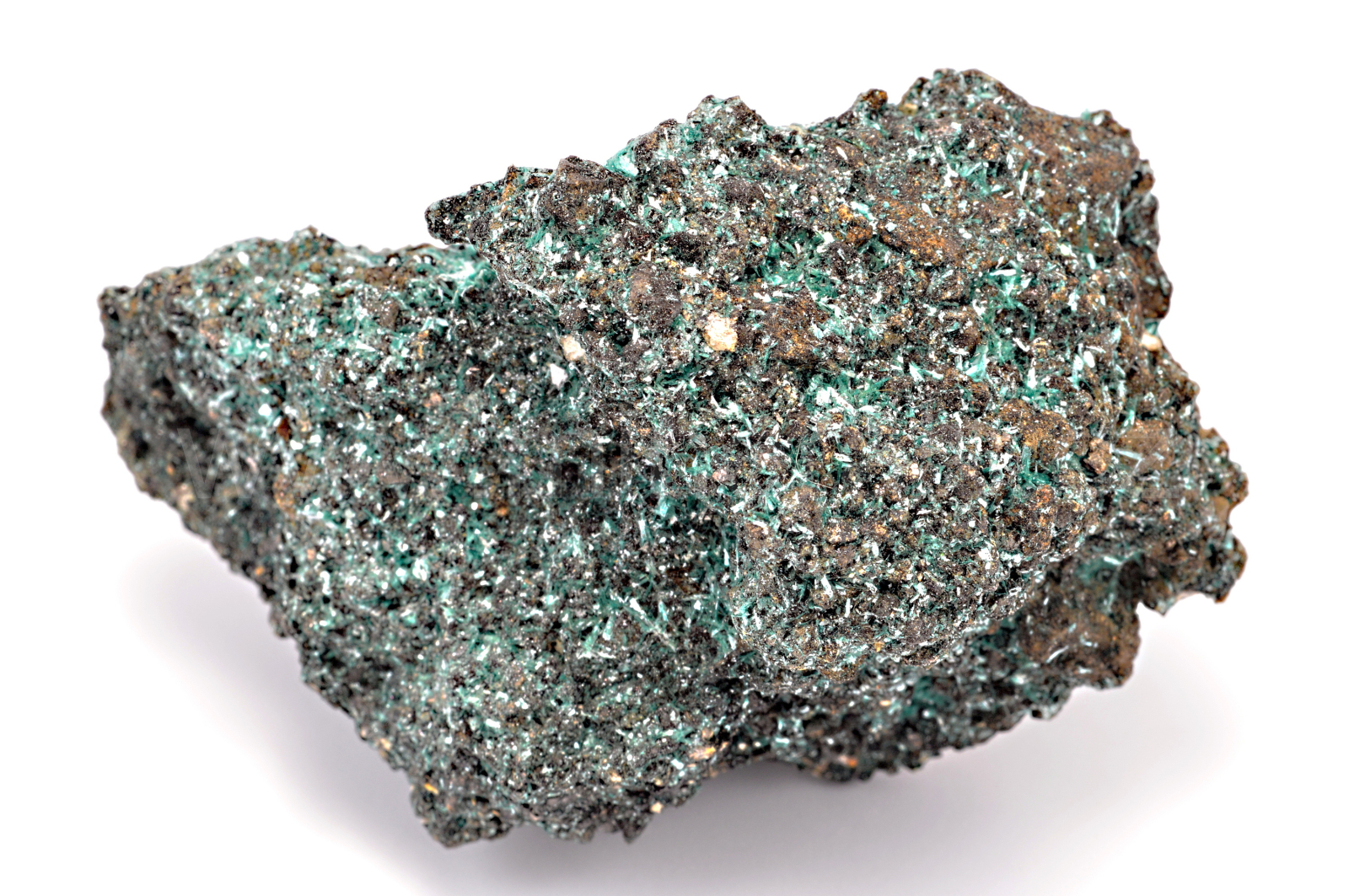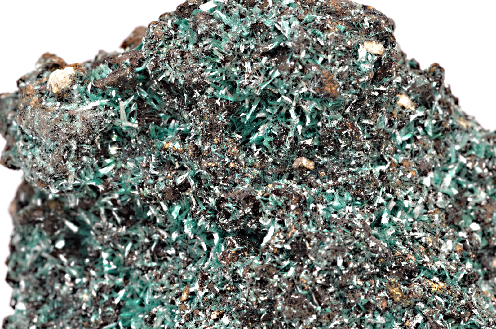 Botallackit vytváří smaragdově temně zelené, hedvábně až perleťově lesklé, průsvitné, protažené, lístkovité a tence tabulkovité dosahující velikosti až 5 mm, které prorůstají celým vzorkem. Velmi kvalitní vzorek.