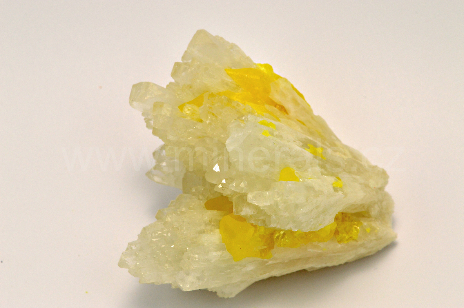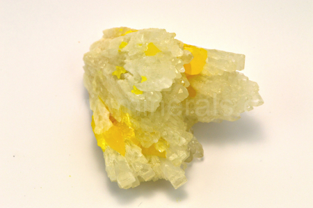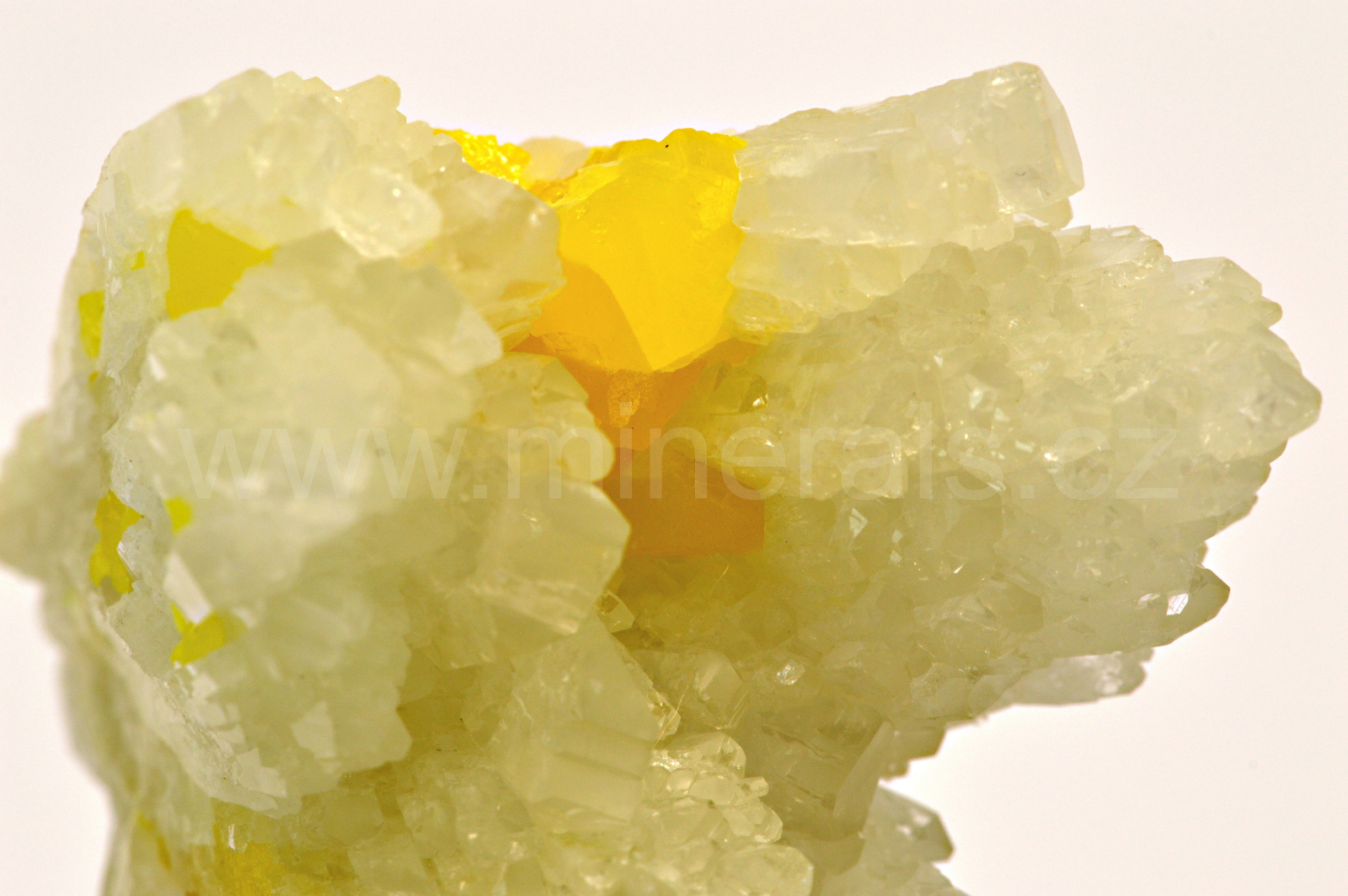 Celestin vytváří bezbarvé, bělavé, skelně lesklé, průsvitné, protažené, pěkně ukončené krystaly dosahující délky až 50 mm, které se navzájem prorůstají a mezi které zarůstají sytě žluté krystaly síry. Pěkná kombinace.