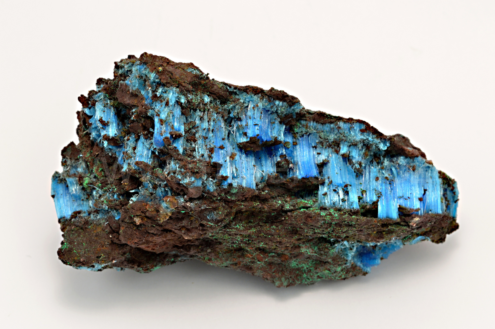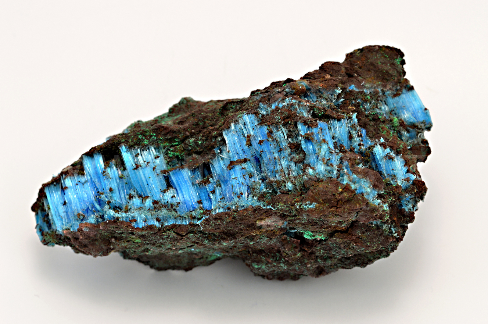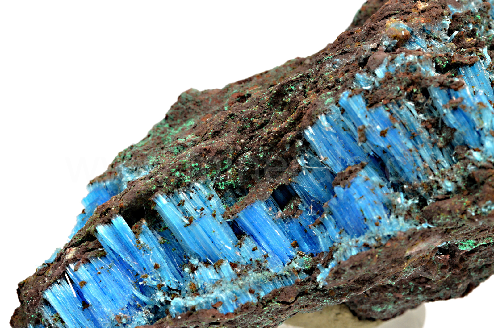 Chalkantit vytváří sytě modré, hedvábně lesklé, průsvitné, vláknité až loknovité agregáty, které dosahují délky až 10 mm a navzájem se prorůstají. POZOR! Minerál je rozpustný ve vodě. Minerál je stabilní, avšak doporučuji instalovat na místo, kde není přímé sluneční světlo.