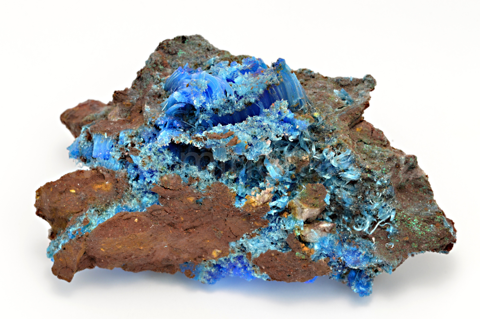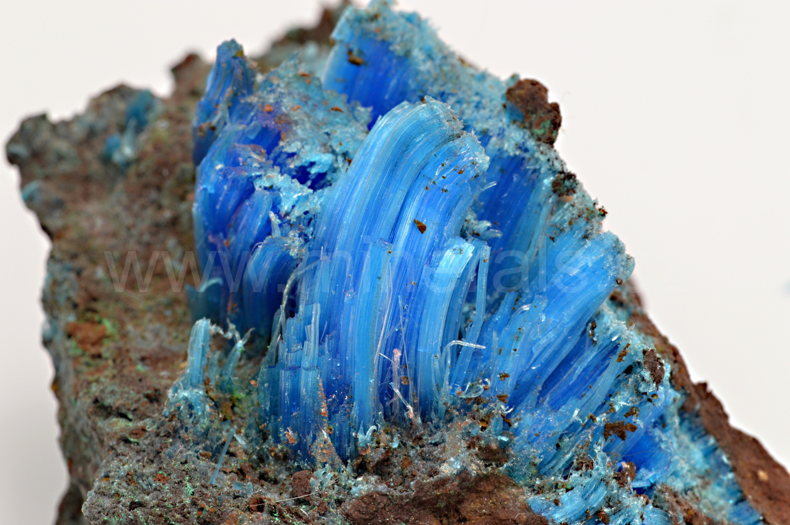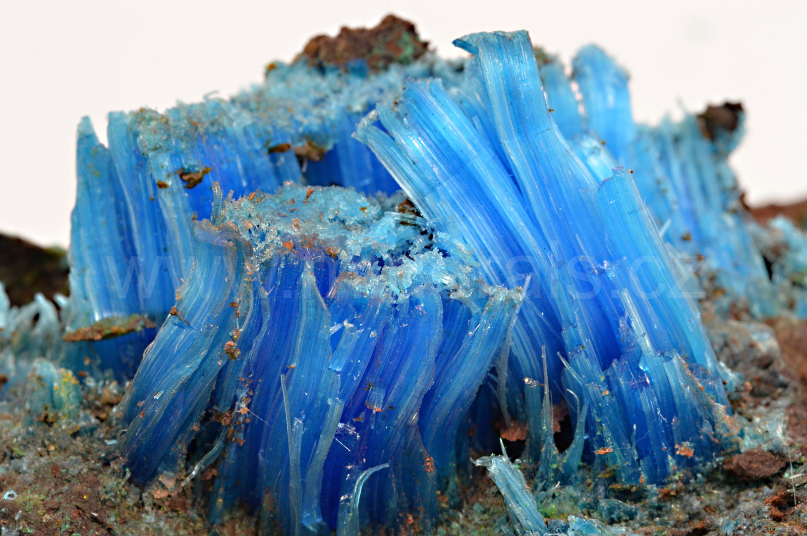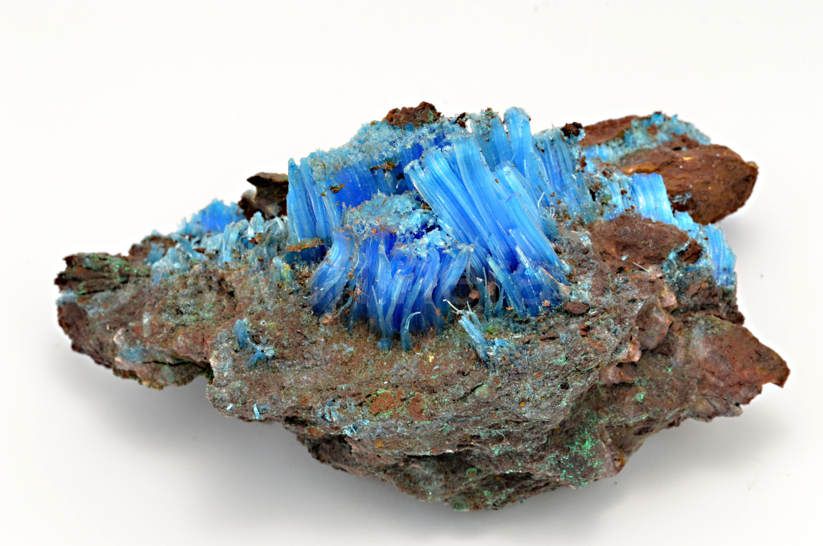Chalkantit vytváří sytě modré, hedvábně lesklé, průsvitné, vláknité až loknovité agregáty, které dosahují délky až 20 mm a navzájem se prorůstají. POZOR! Minerál je rozpustný ve vodě. Minerál je stabilní, avšak doporučuji instalovat na místo, kde není přímé sluneční světlo. Kvalitní vzorek.