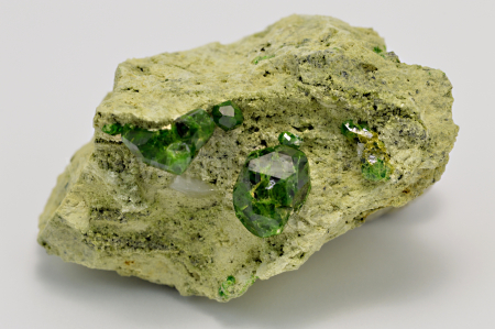 Démantoid (chrómem bohatá odr. granátu - andraditu) vytváří smaragdově zelené, skelně lesklé, průsvitné, pěkně ohraničené krystaly dosahující velikosti až 11 mm, které se navzájem prorůstají a narůstají na olivově zelenohnědou podložku tvořenou převážně diopsidem.