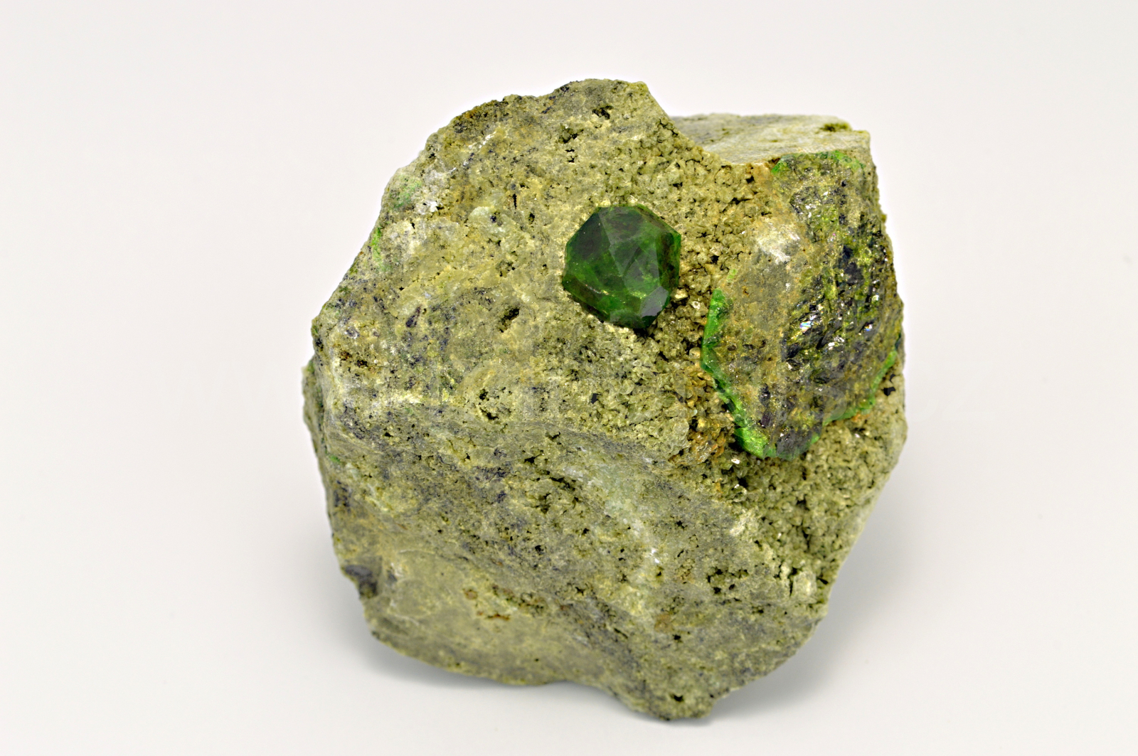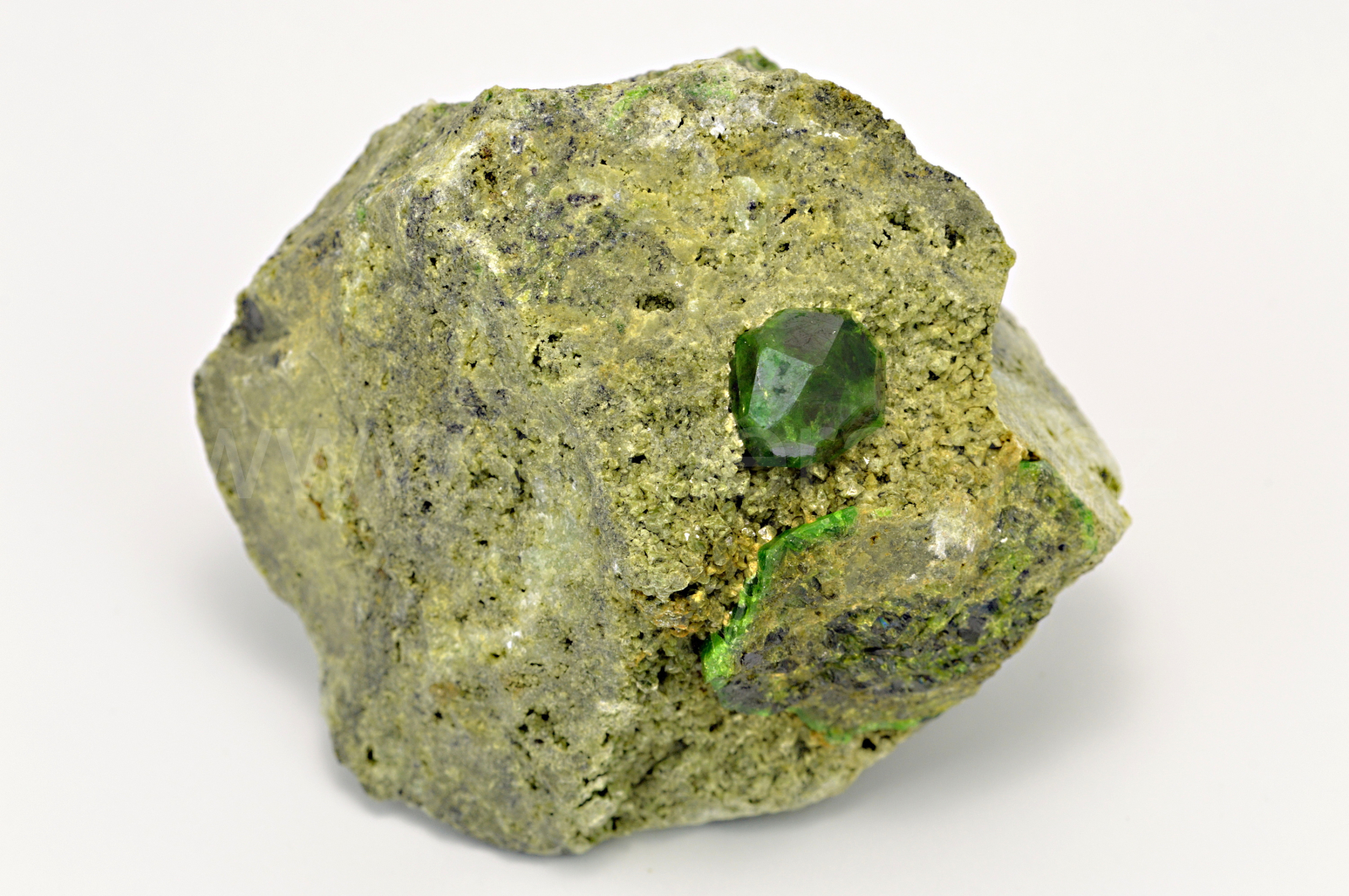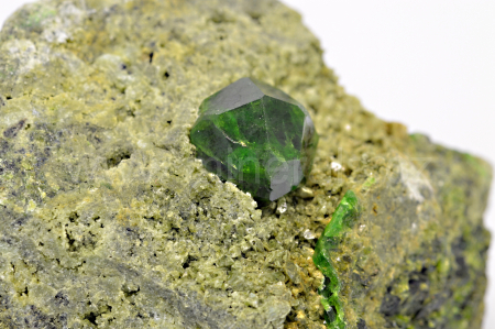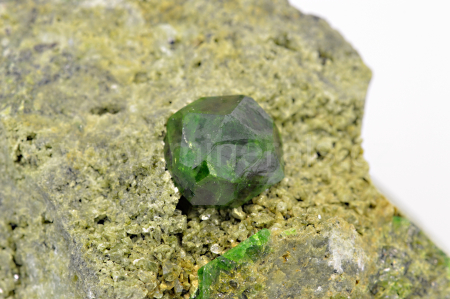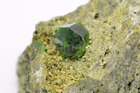 Démantoid (chrómem bohatá odr. granátu - andraditu) vytváří smaragdově zelený, skelně až diamantově lesklý, průsvitný, pěkně ohraničený krystal dosahující velikosti cca 10 mm, který narůstá na olivově zelenohnědou podložku tvořenou převážně diopsidem.