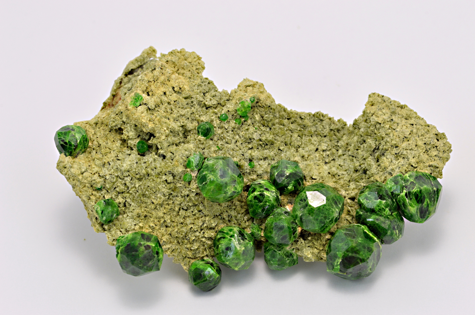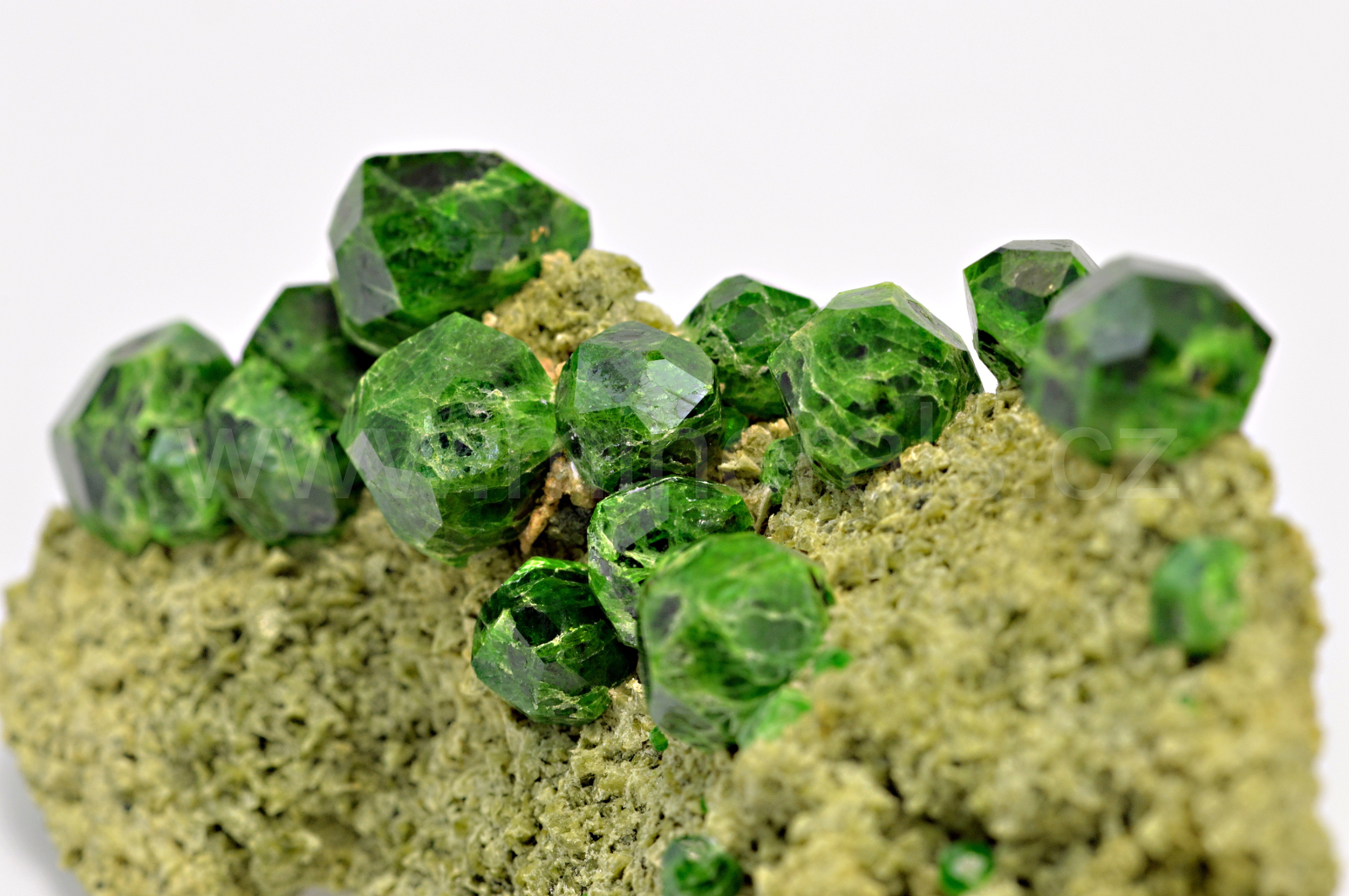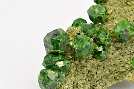Démantoid (chrómem bohatá odr. granátu - andraditu) vytváří smaragdově zelené, skelně lesklé, průsvitné, pěkně ohraničené krystaly dosahující velikosti až 10 mm, které se navzájem prorůstají a narůstají na olivově zelenohnědou podložku tvořenou převážně diopsidem. Pěkný malý vzorek.