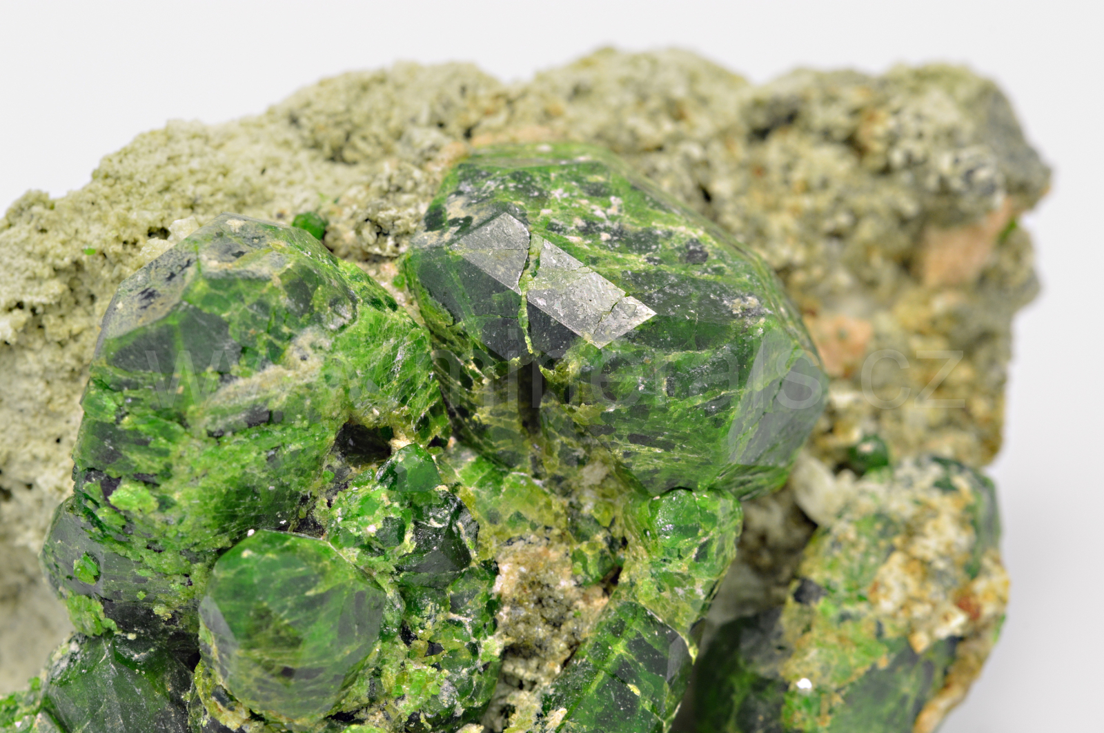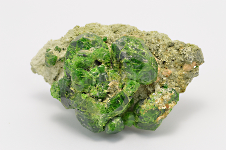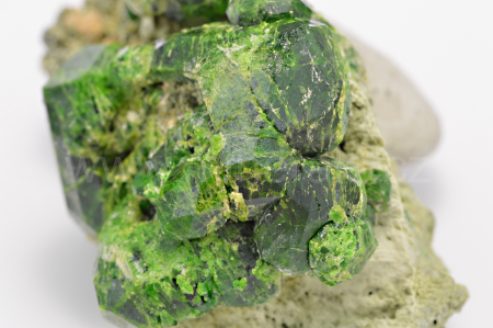 Démantoid (chrómem bohatá odr. granátu - andraditu) vytváří smaragdově zelené, skelně lesklé, průsvitné, pěkně ohraničené krystaly dosahující velikosti až 22 mm, které se navzájem prorůstají a narůstají na olivově zelenohnědou podložku tvořenou převážně diopsidem.