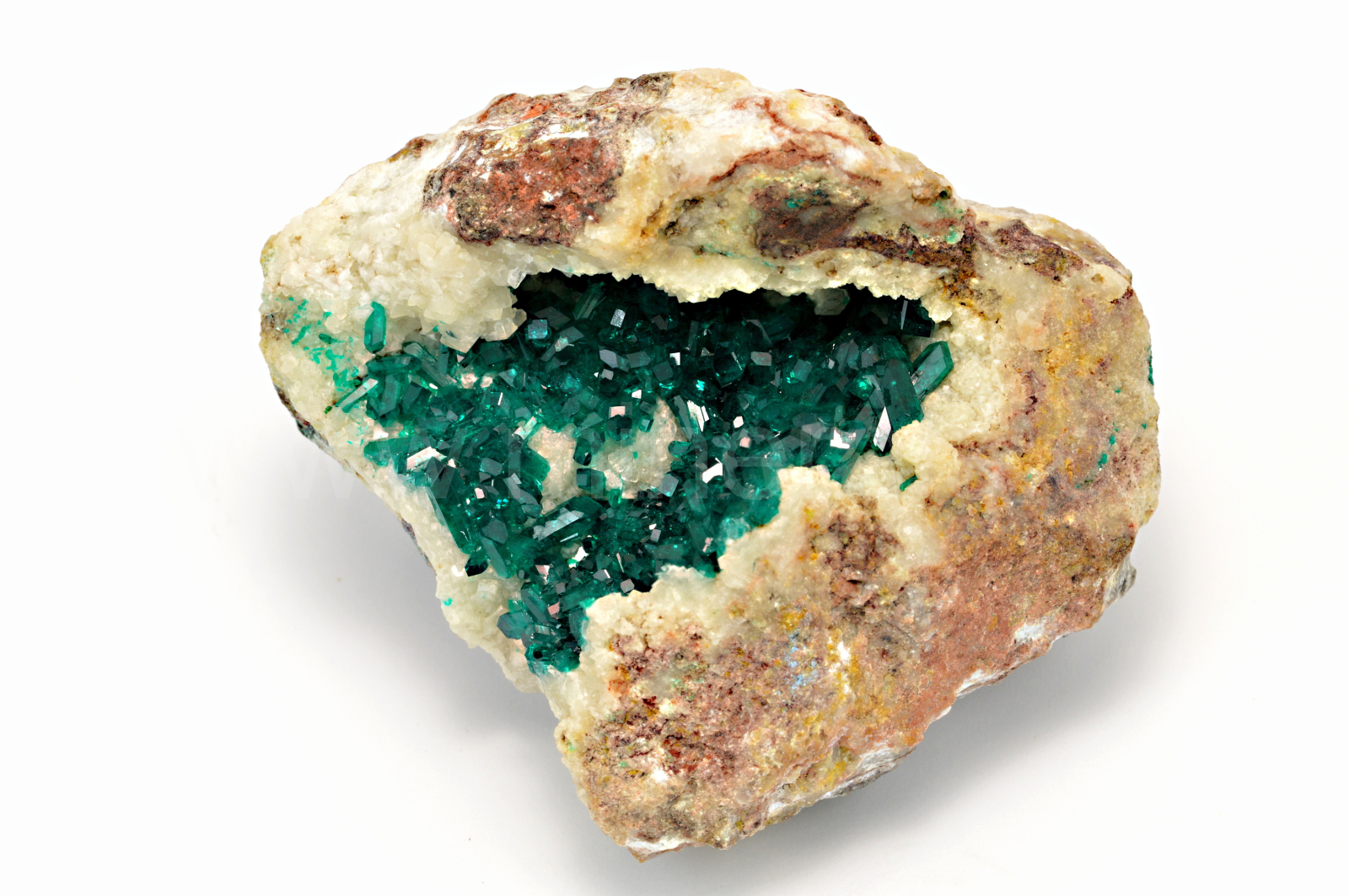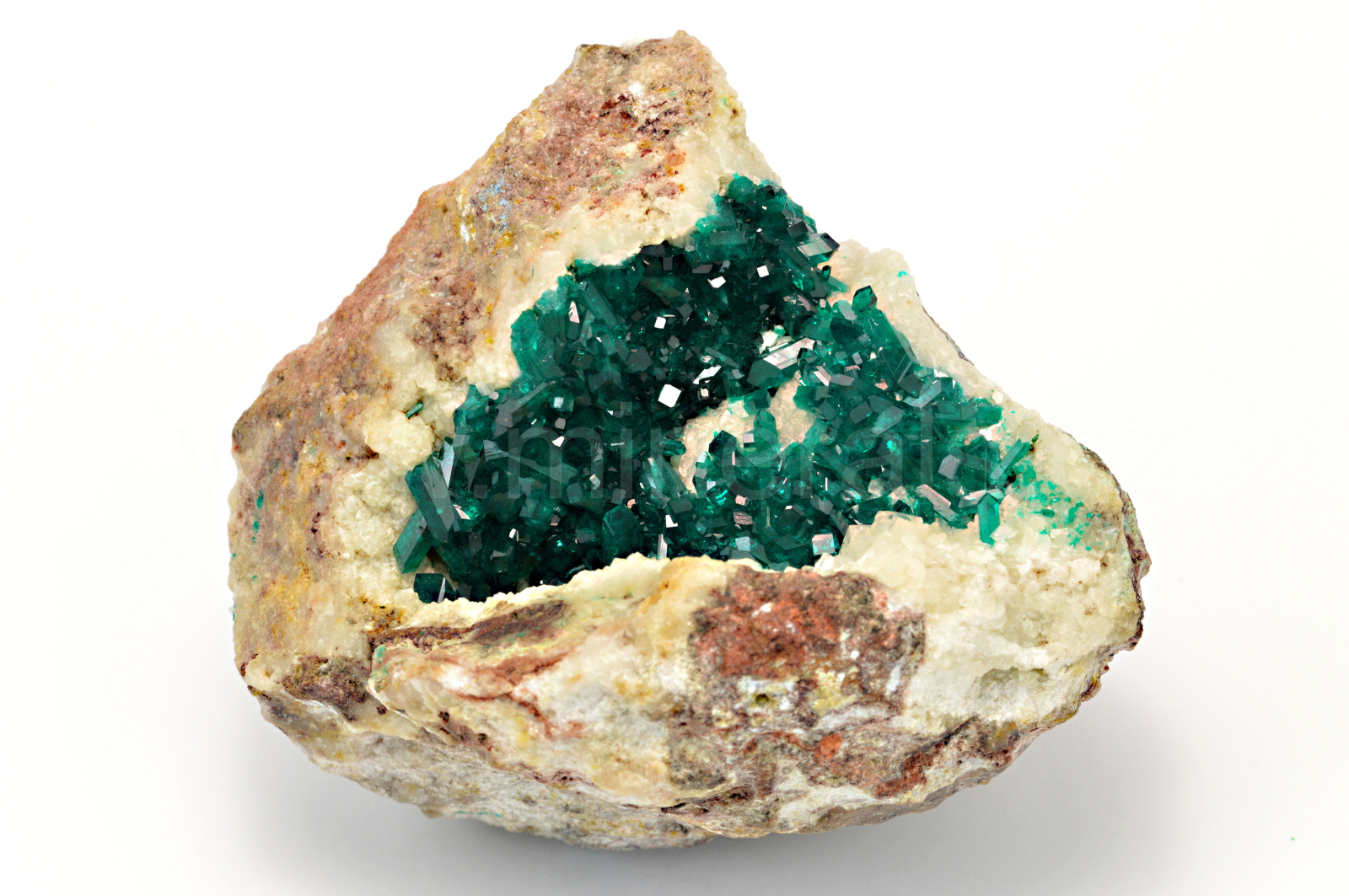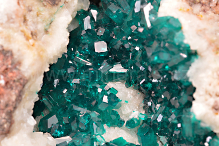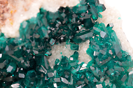 Dioptas vytváří temně smaragdově zelené, skelně až diamantově lesklé, dokonalé ohraničené, oboustranné, průsvitné krystaly dioptasu dosahující velikosti až 8 mm které se navzájem prorůstají a narůstají na drobné bezbarvé krystaly kalcitu. Opravdu velmi kvalitní a estetický vzorek, kde krystaly dioptasu mají extrémní lesk.