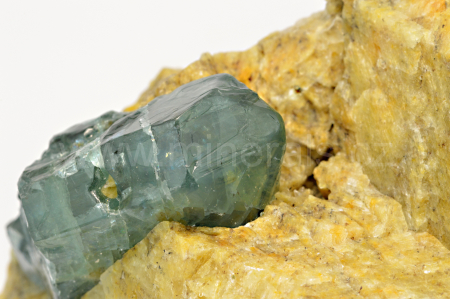Fluorapatit vytváří tmavě zelený, skelně lesklý, průsvitný, protažený krystal dosahující velikosti cca 30 mm který zarůstá do světle žlutooranžového, hrubě štěpného kalcitu. Fluorapatity z této lokality se vyznačují jakoby "oslizlým" a nerovným povrchem krystalů.