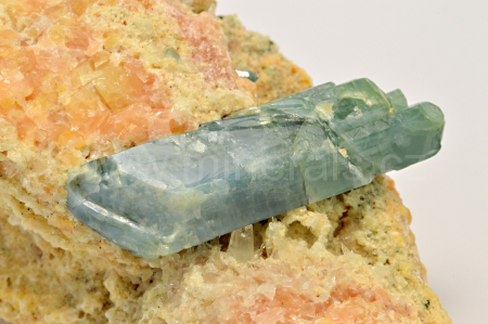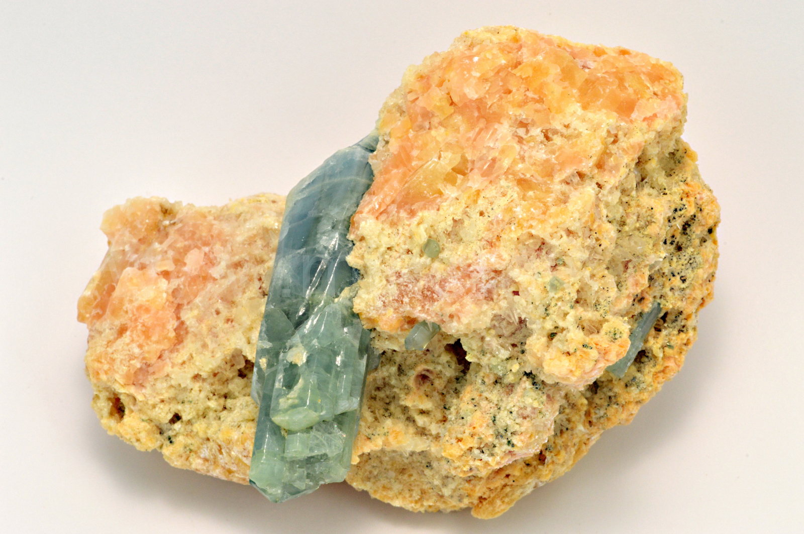 Fluorapatit vytváří tmavě zelený, skelně lesklý, průsvitný, protažený krystal dosahující velikosti cca 43 mm který zarůstá do světle oranžového, hrubě štěpného kalcitu. Fluorapatity z této lokality se vyznačují jakoby "oslizlým" a nerovným povrchem krystalů.