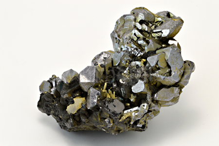 Galenit vytváří ocelově šedé, kovově lesklé, neprůsvitné, pěkně ohraničené skeletické krystaly dosahující velikosti až 25 mm, které se navzájem prorůstají a tvoří skoro celý vzorek. Na boku vzorku doprovází galenit drobné, lesklé krystaly sfaleritu.