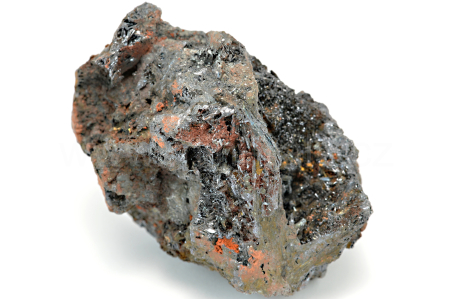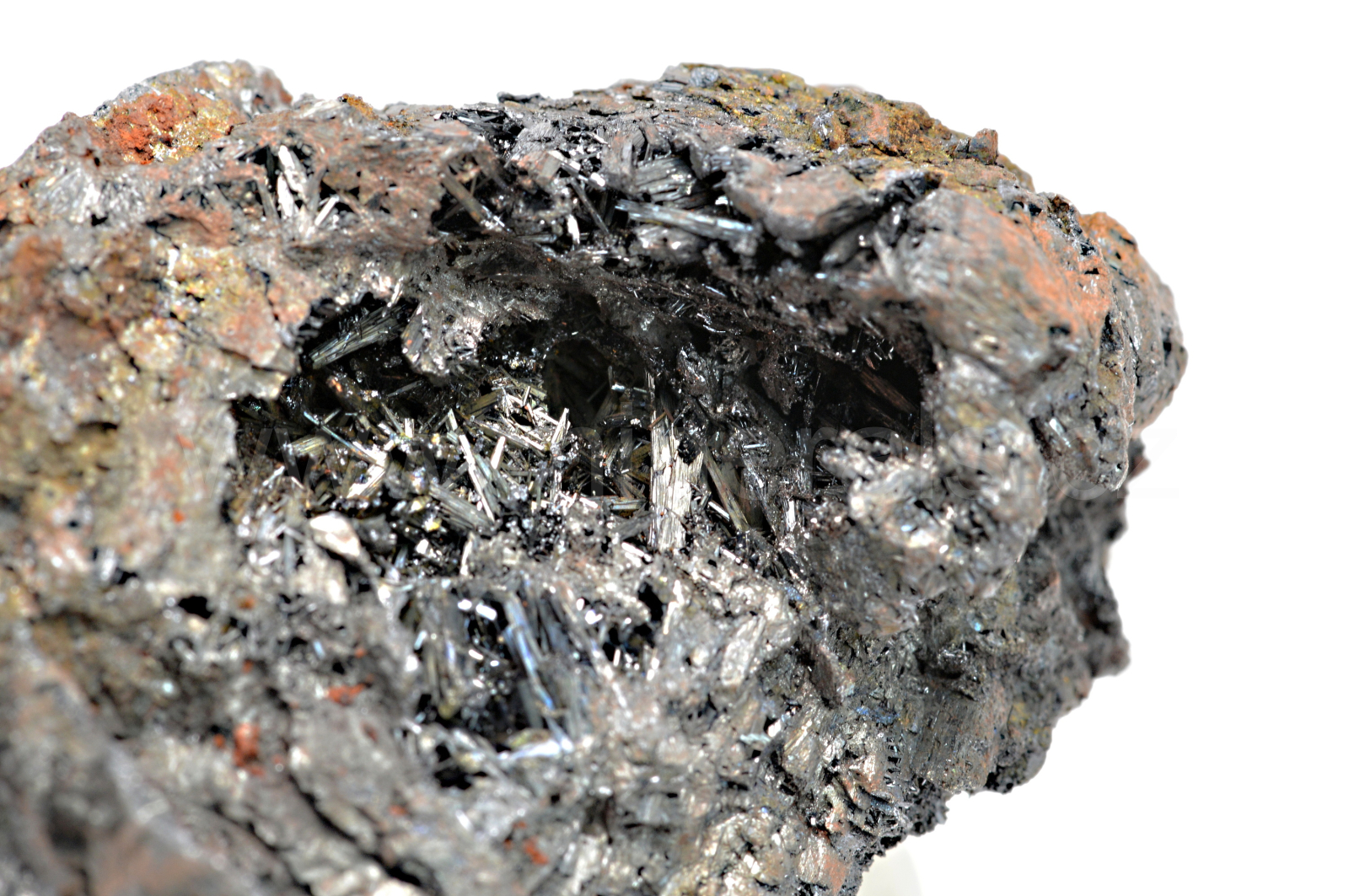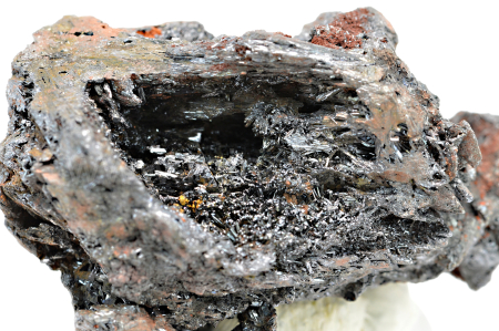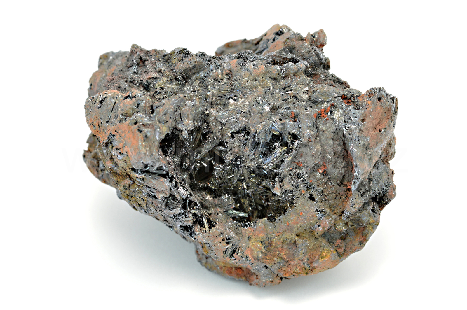 Goethit vytváří tmavě hnědé s fialovým nádechem, kovově lesklé, neprůsvitné, jehlicovité, protažené krystaly dosahující velikosti délky 10 mm, které se navzájem prorůstají, vytvářejí radiálně paprsčité agregáty a vyplňují nevelké dutiny prorůstající celým vzorkem. Velmi pěkný malý vzorek.