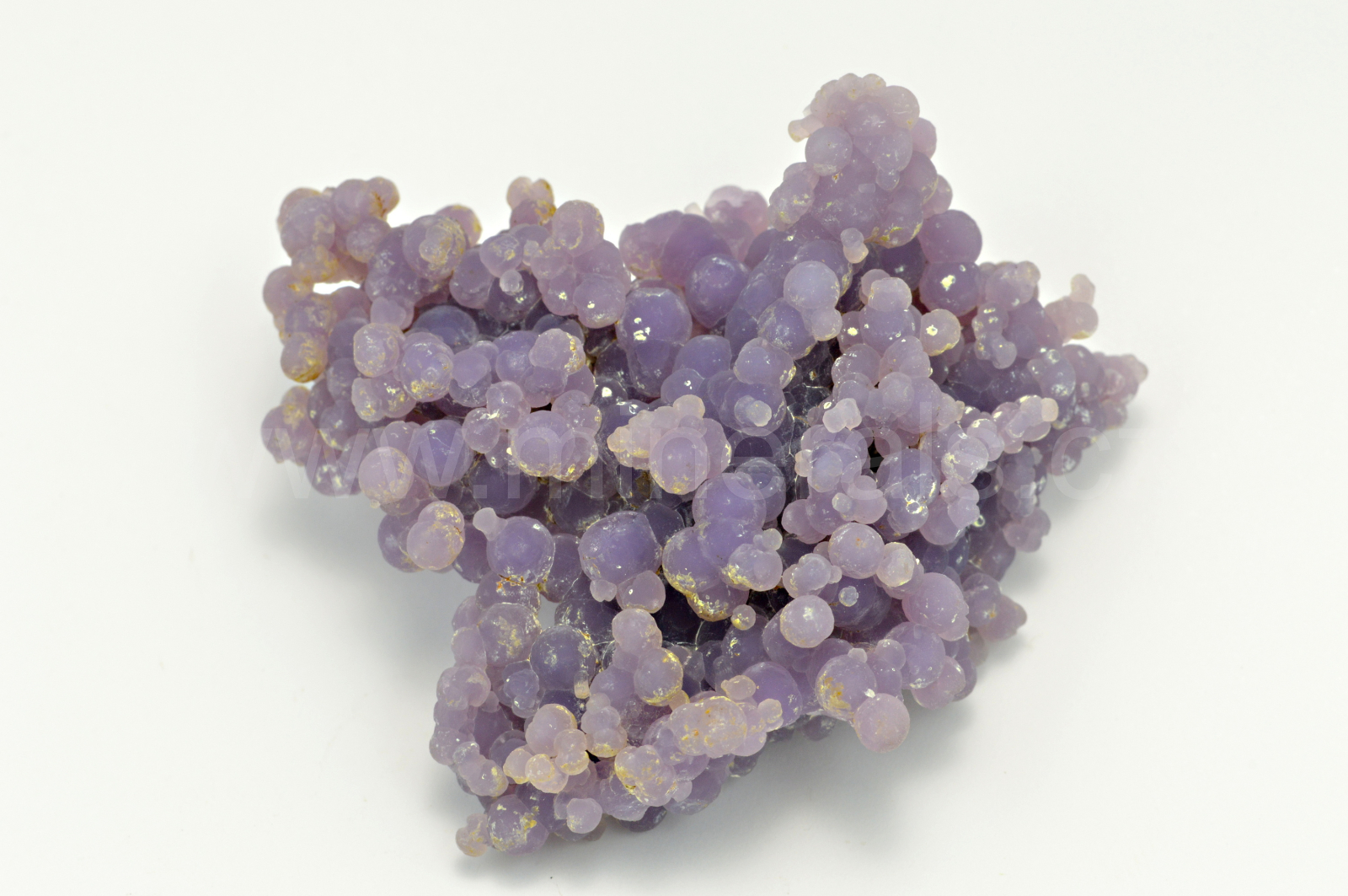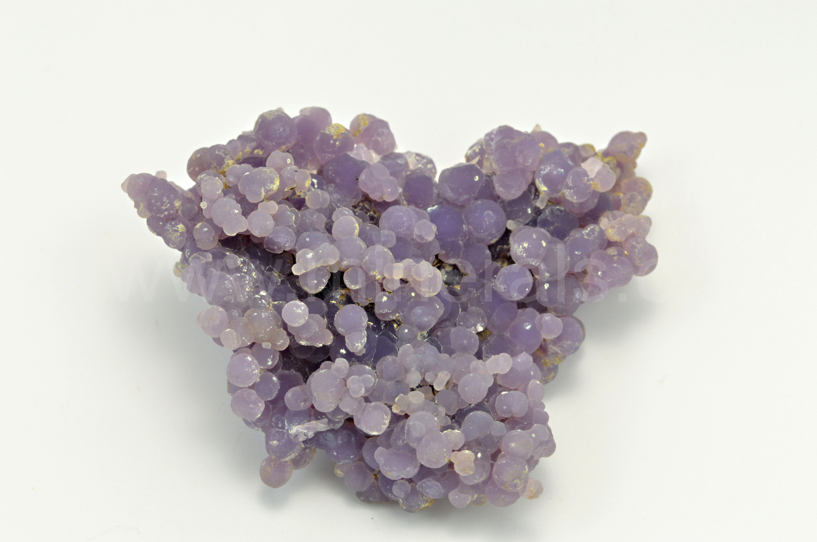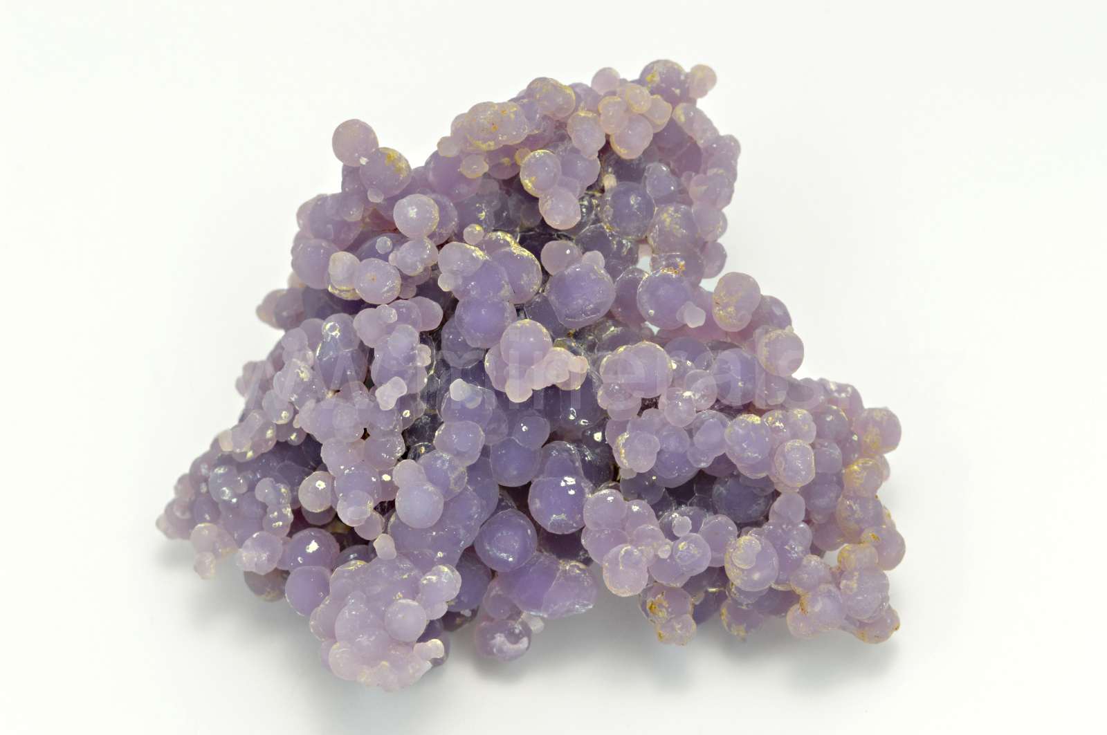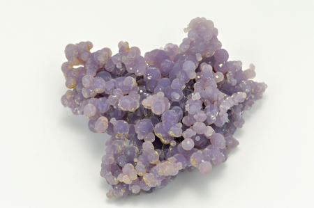 Chalcedon ( "grape agate", "grape amethyste", obchodní názvy ) vytváří světle až temně fialové, skelně až hedvábně lesklé, průsvitné, kulovité a polokulovité agregáty dosahující velikosti až 4 mm, které se navzájem prorůstají a tvoří celý oboustranný vzorek. Podotýkám, že vzhledem k různým typům monitorů a osvětlení se může odstín chalcedonu trochu odlišovat.