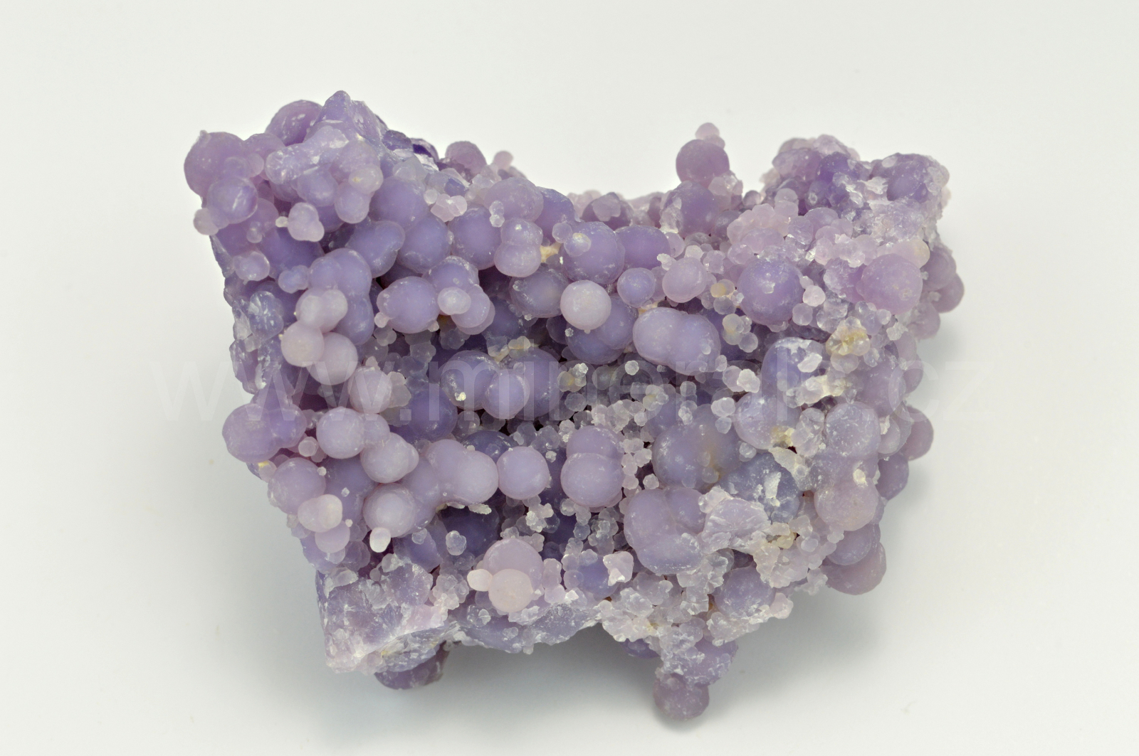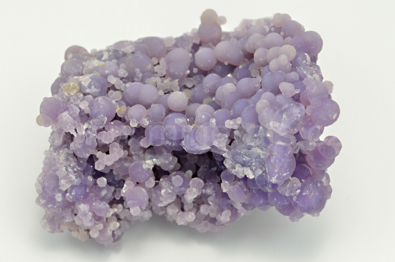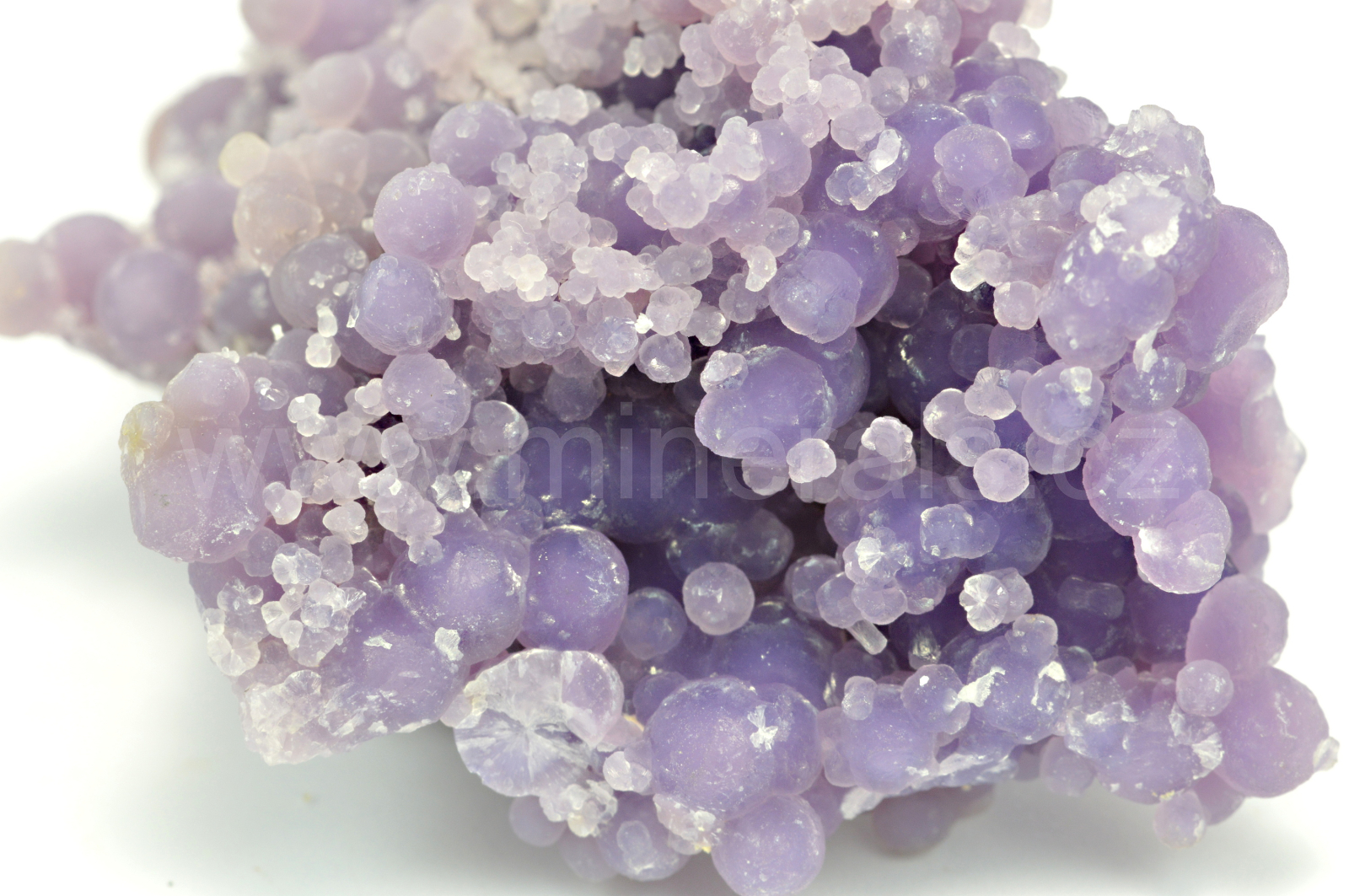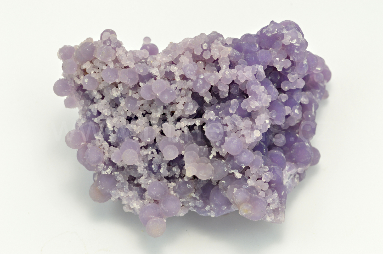 Chalcedon ( "grape agate", "grape amethyste", obchodní názvy ) vytváří světle až temně fialové, skelně až hedvábně lesklé, průsvitné, kulovité a polokulovité agregáty dosahující velikosti až 4 mm, které se navzájem prorůstají a tvoří celý oboustranný vzorek. Podotýkám, že vzhledem k různým typům monitorů a osvětlení se může odstín chalcedonu trochu odlišovat.