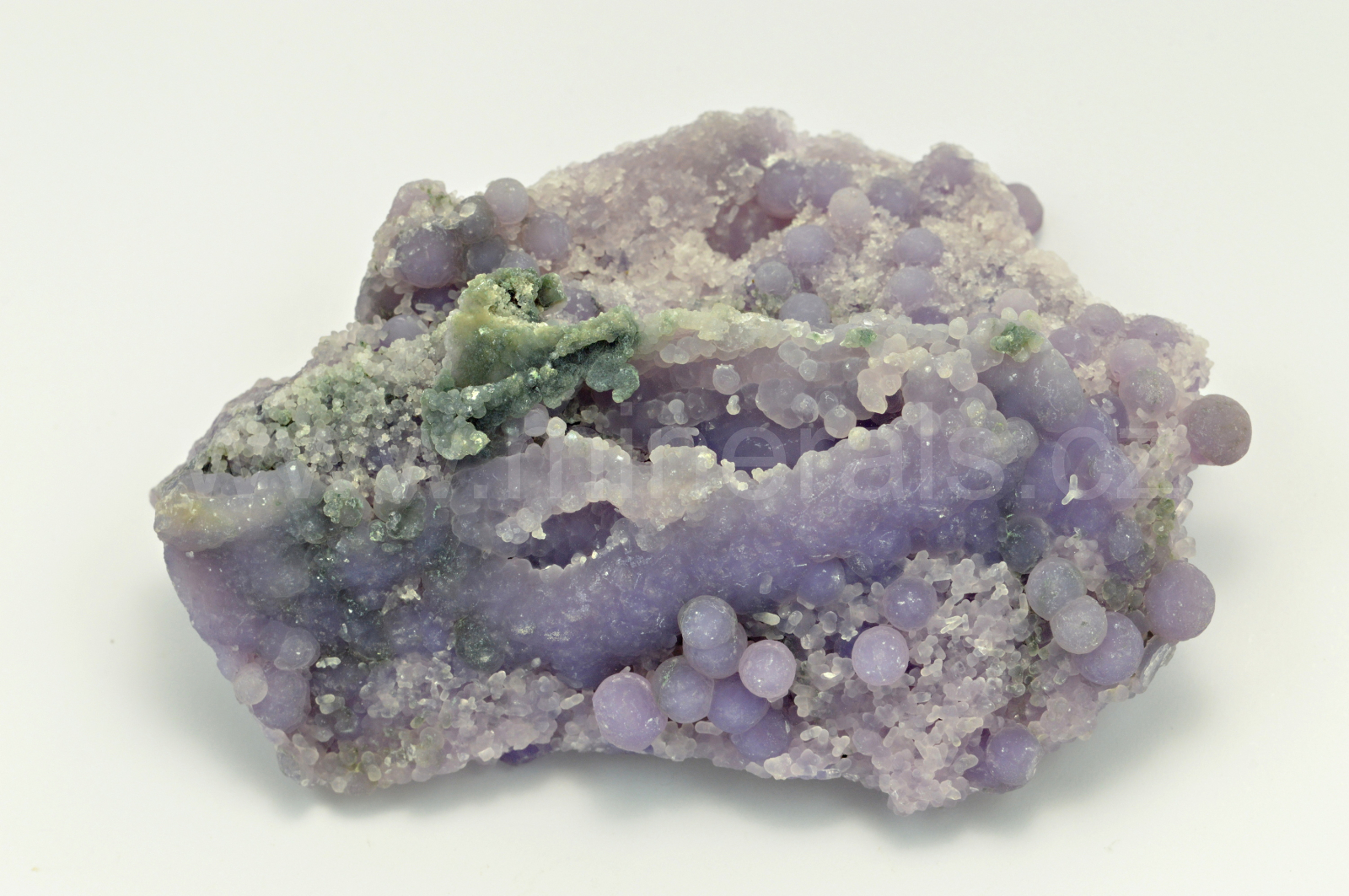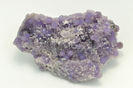 Chalcedon ( "grape agate", "grape amethyste", obchodní názvy ) vytváří světle až temně fialové, skelně až hedvábně lesklé, průsvitné, kulovité a polokulovité agregáty dosahující velikosti až 5 mm, které se navzájem prorůstají a tvoří celý oboustranný vzorek. Podotýkám, že vzhledem k různým typům monitorů a osvětlení se může odstín chalcedonu trochu odlišovat.