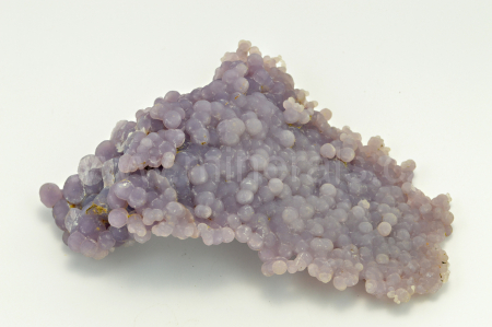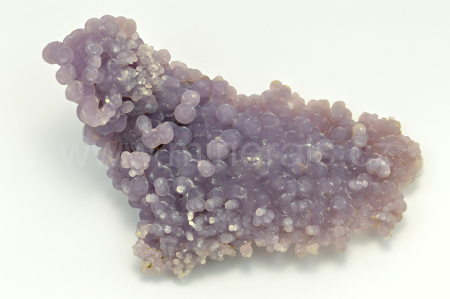 Chalcedon ( "grape agate", "grape amethyste", obchodní názvy ) vytváří světle až temně fialové, skelně až hedvábně lesklé, průsvitné, kulovité a polokulovité agregáty dosahující velikosti až 5 mm, které se navzájem prorůstají a tvoří celý oboustranný vzorek. Podotýkám, že vzhledem k různým typům monitorů a osvětlení se může odstín chalcedonu trochu odlišovat.