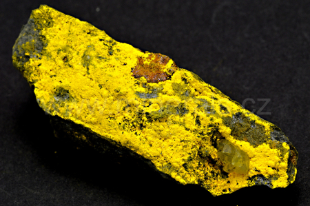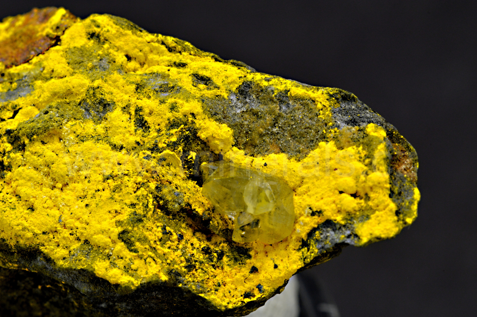 Greenockit vytváří sírově sytě žluté, matně lesklé, částečně průsvitné, zemité agregáty a povlaky tvořené z mikroskopických krystalů, které doprovází bezbarvý s nahnědlým odstínem, skelně lesklý, průhledný krystal cerusitu. Velice pěkná kombinace. Novinka z této lokality!