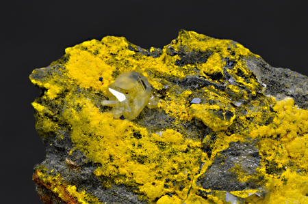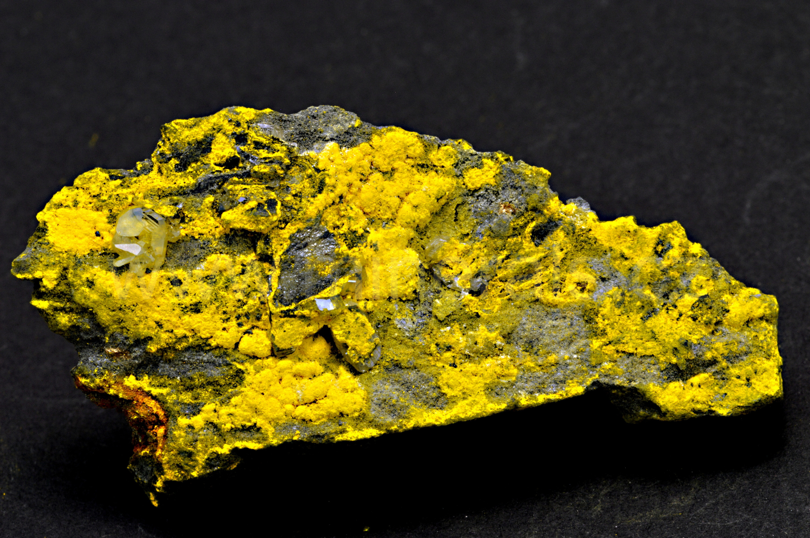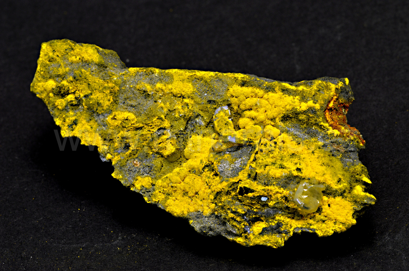 Greenockit vytváří sírově sytě žluté, matně lesklé, částečně průsvitné, zemité agregáty a povlaky tvořené z mikroskopických krystalů, které doprovází bezbarvý s nahnědlým odstínem, skelně lesklý, průhledný krystal cerusitu. Velice pěkná kombinace. Novinka z této lokality!
