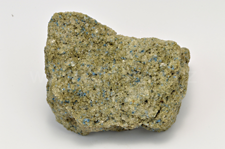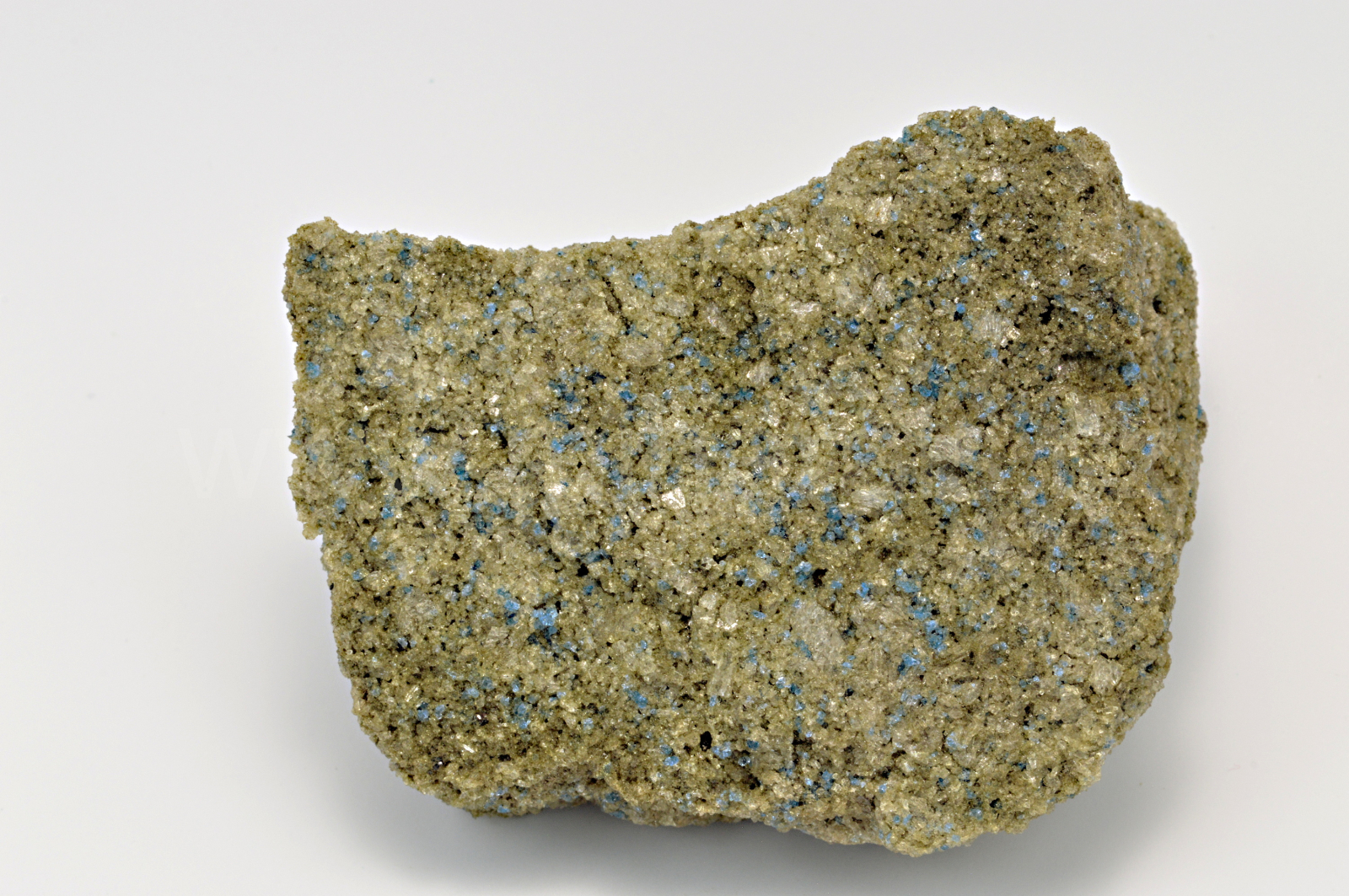 Hauyn vytváří sytě modrá, skelně lesklá, průsvitná až částečně průhledná zrna dosahující velikosti až 3 mm, která prorůstají celým vzorkem bezbarvého, bělavého, průsvitného sanidinu.