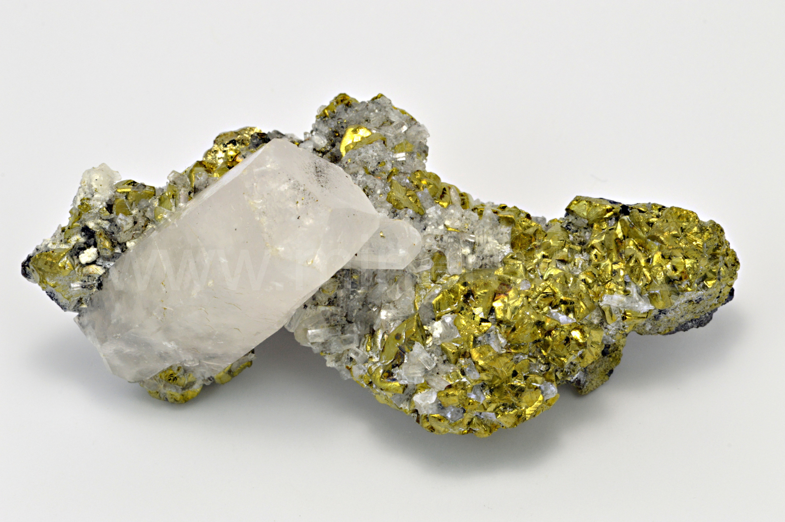 Kalcit vytváří bezbarvé, bělavé, skelně lesklé, průsvitné, protažené krystaly dosahující délky až 36 mm které spolu s drobnými krystaly křišťálu narůstají na mosazně žluté, kovově lesklé krystaly chalkopyritu.