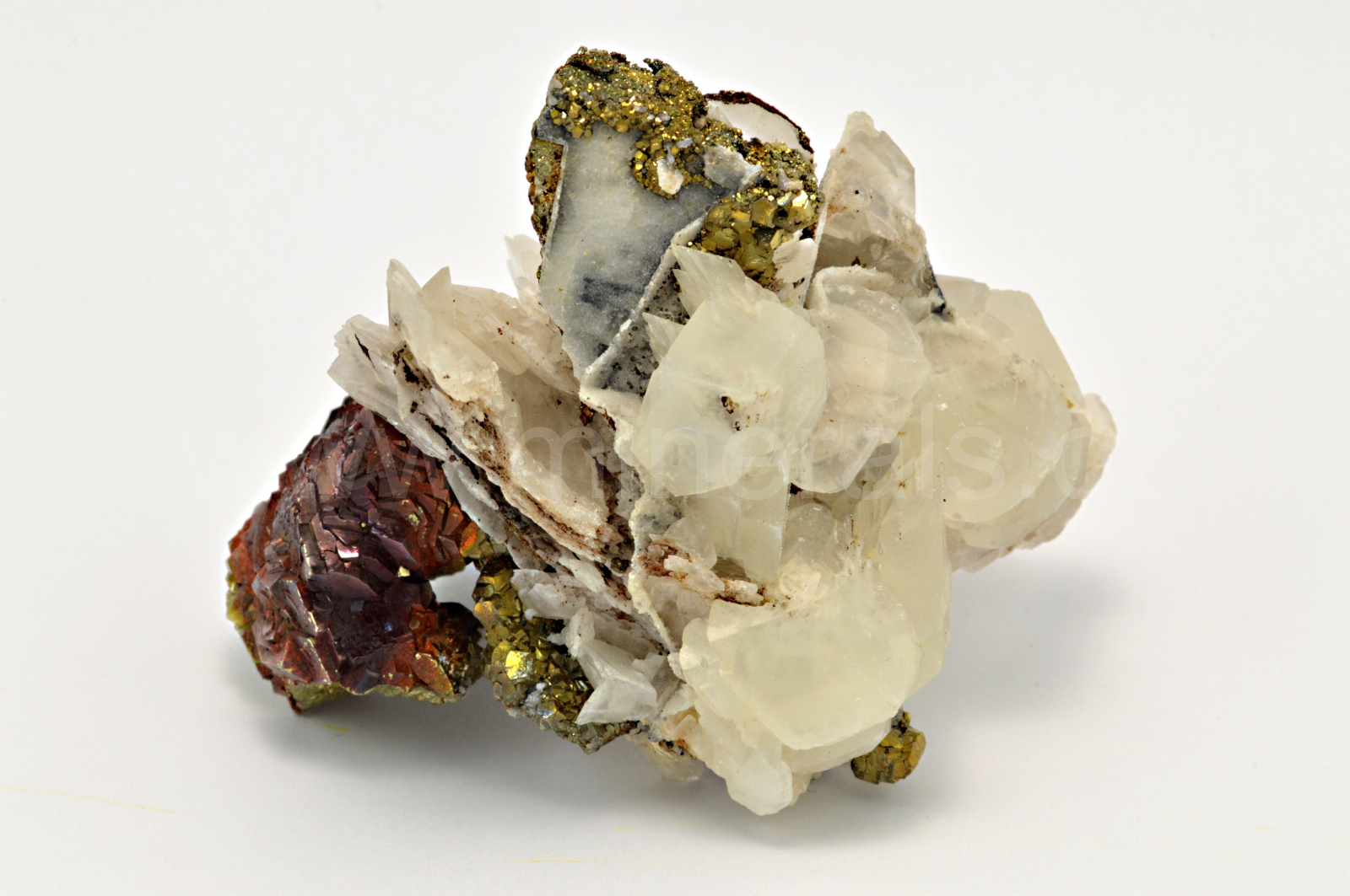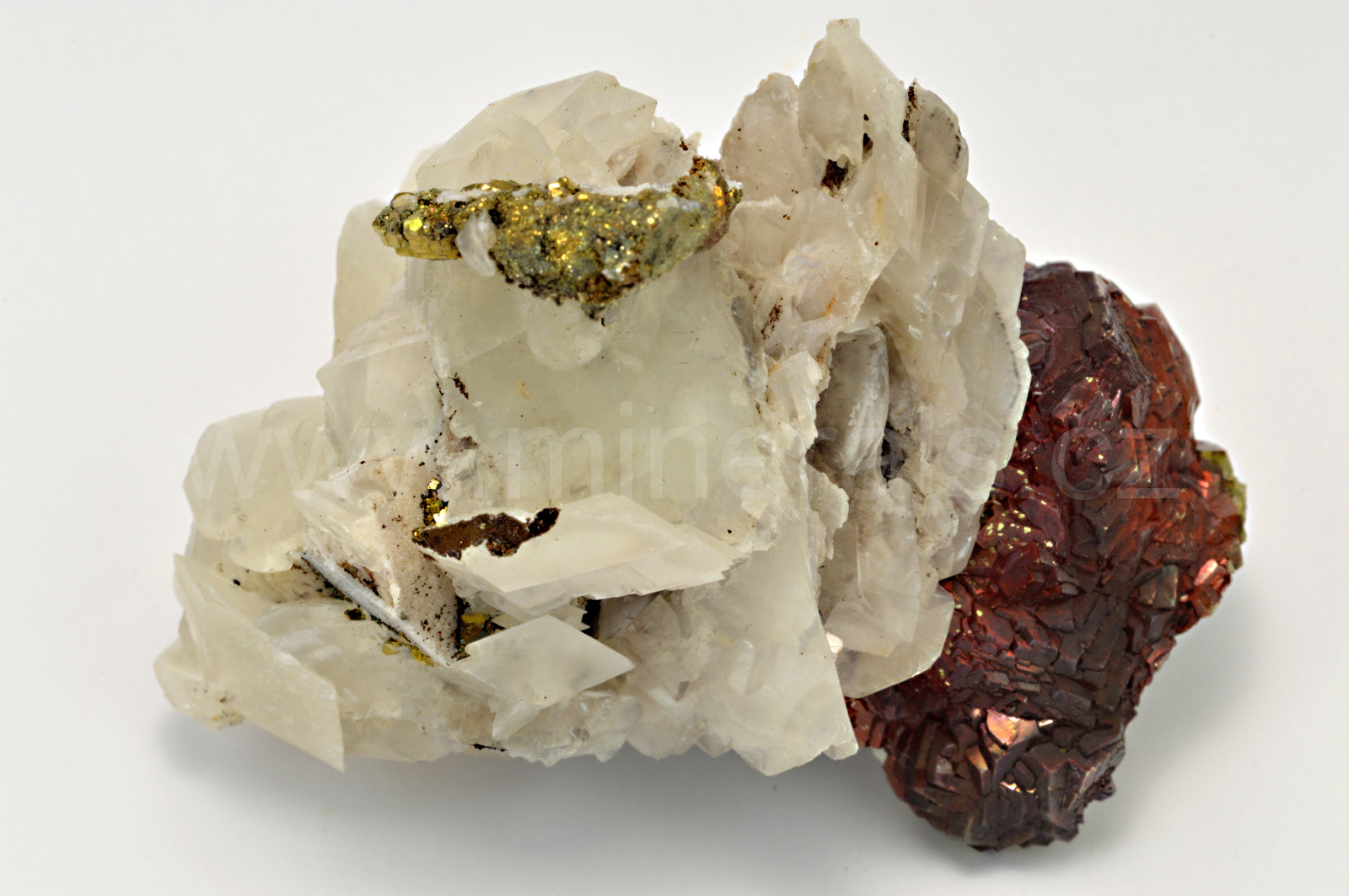 Kalcit vytváří bělavé, mléčně bílé, skelně a matně lesklé, částečně průsvitné, "cvočkovité" (nízký klenec) krystaly dosahující velikosti až 25 mm, které se navzájem prorůstají a narůstají na přepážky a torza pseudomorfóz kalcitu po fluoritu spolu se zlatavým, kovově lesklým pyritem.