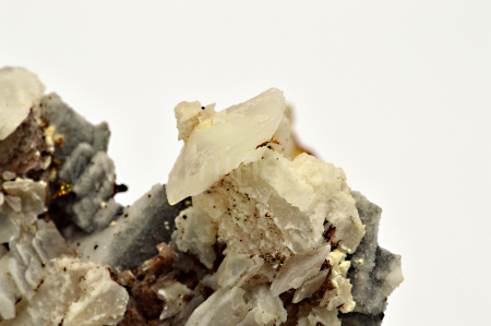 Kalcit vytváří bělavé, mléčně bílé, skelně a matně lesklé, částečně průsvitné, "cvočkovité" (nízký klenec) krystaly dosahující velikosti až 10 mm, které se navzájem prorůstají a narůstají na přepážky a torza pseudomorfóz kalcitu po fluoritu spolu se zlatavým, kovově lesklým pyritem.