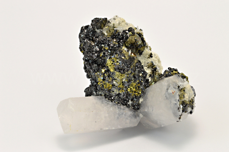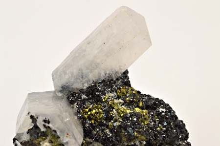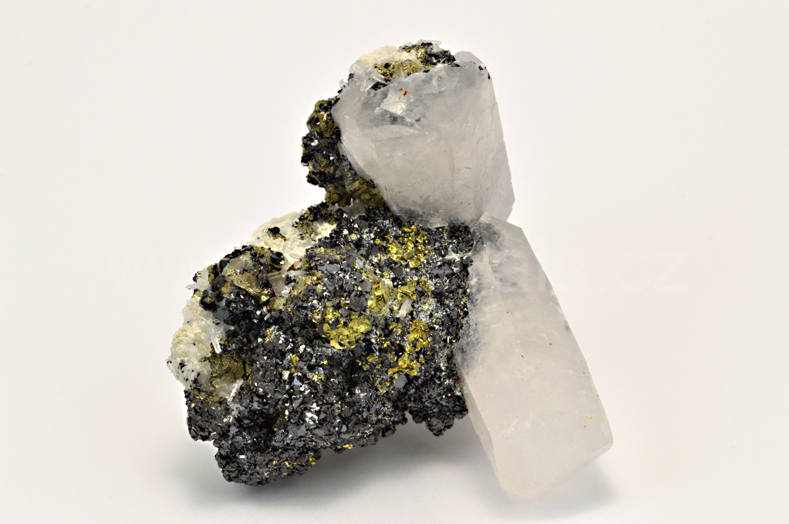 Kalcit vytváří bezbarvé, bělavé, skelně lesklé, průsvitné, protažené oboustranně ukončené krystaly dosahující délky až 30 mm které spolu s drobnými krystaly křišťálu narůstají na mosazně žluté, kovově lesklé krystaly chalkopyritu a skelně lesklé, šedé krystaly sfaleritu.