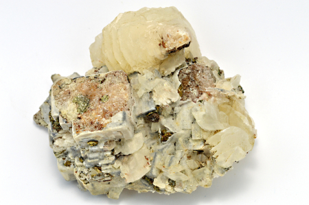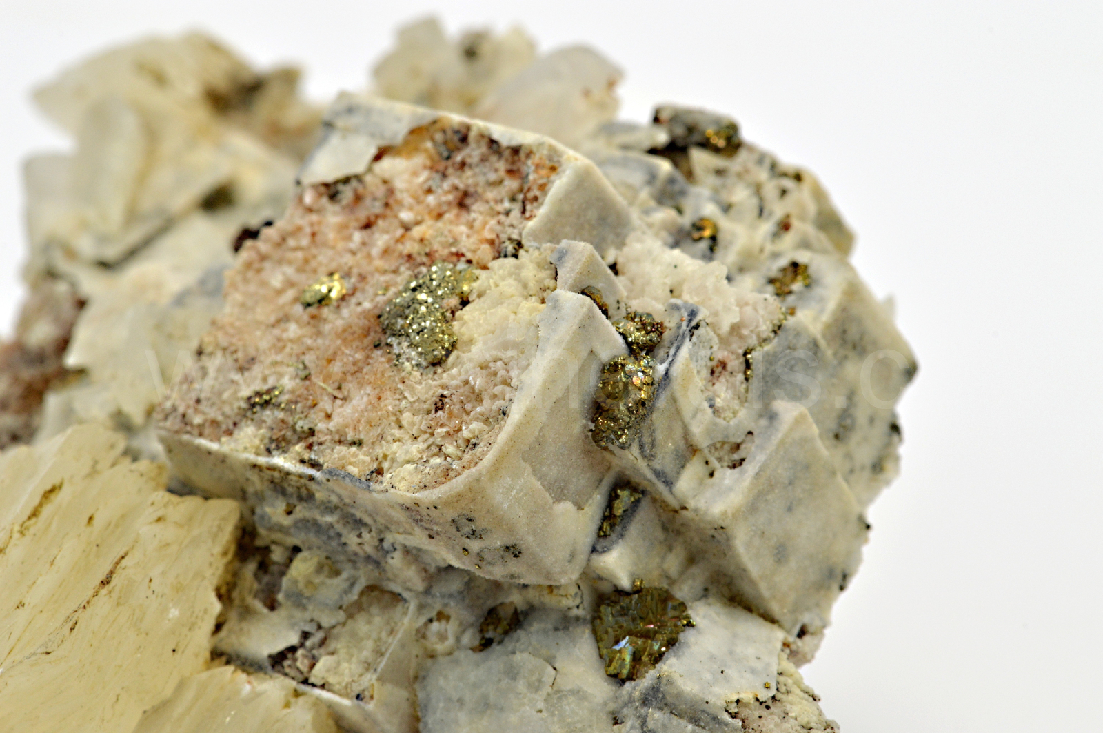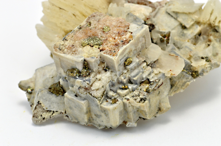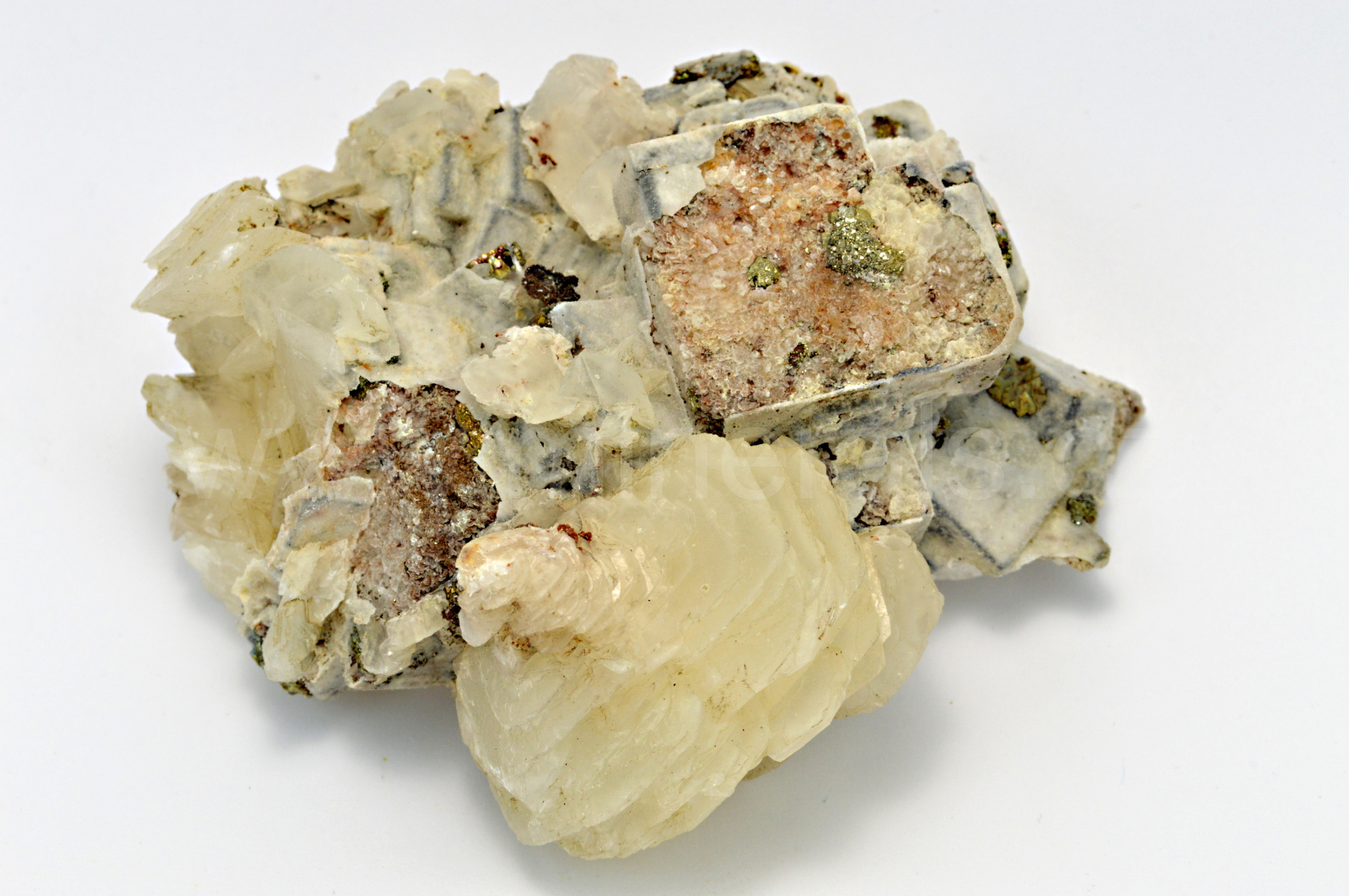 Kalcit kompletně pseudomorfuje kubické krystaly fluoritu. Vytváří mléčně bílé, matně lesklé, částečně průsvitné, kubické agregáty dosahující velikosti až 22 mm, které se navzájem prorůstají a na povrchu mají tenkou krustu z mikrokrystalického křemene. Tyto agregáty doprovází zlatavé, kovově lesklé krystaly pyritu a bezbarvé, bělavé krystaly kalcitu druhé generace. Velice pěkná a kvalitní pseudomorfóza, v dnešní době též složitě dostupný materiál díky své lokalitě.