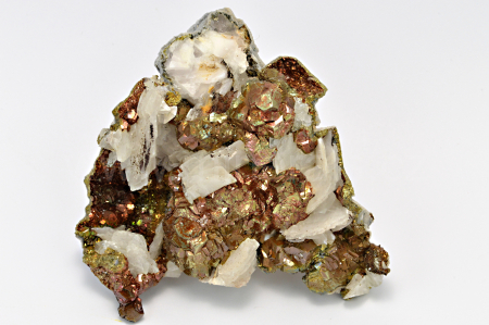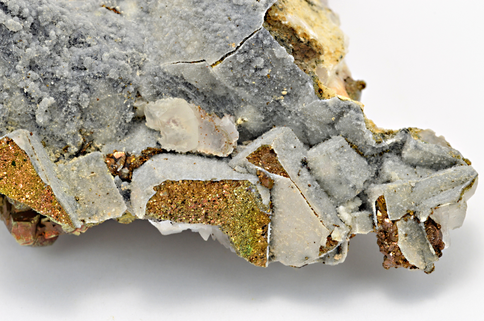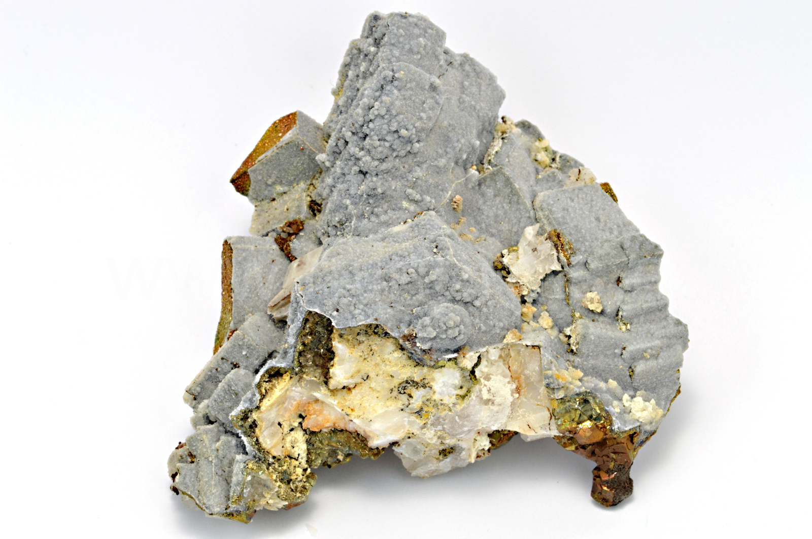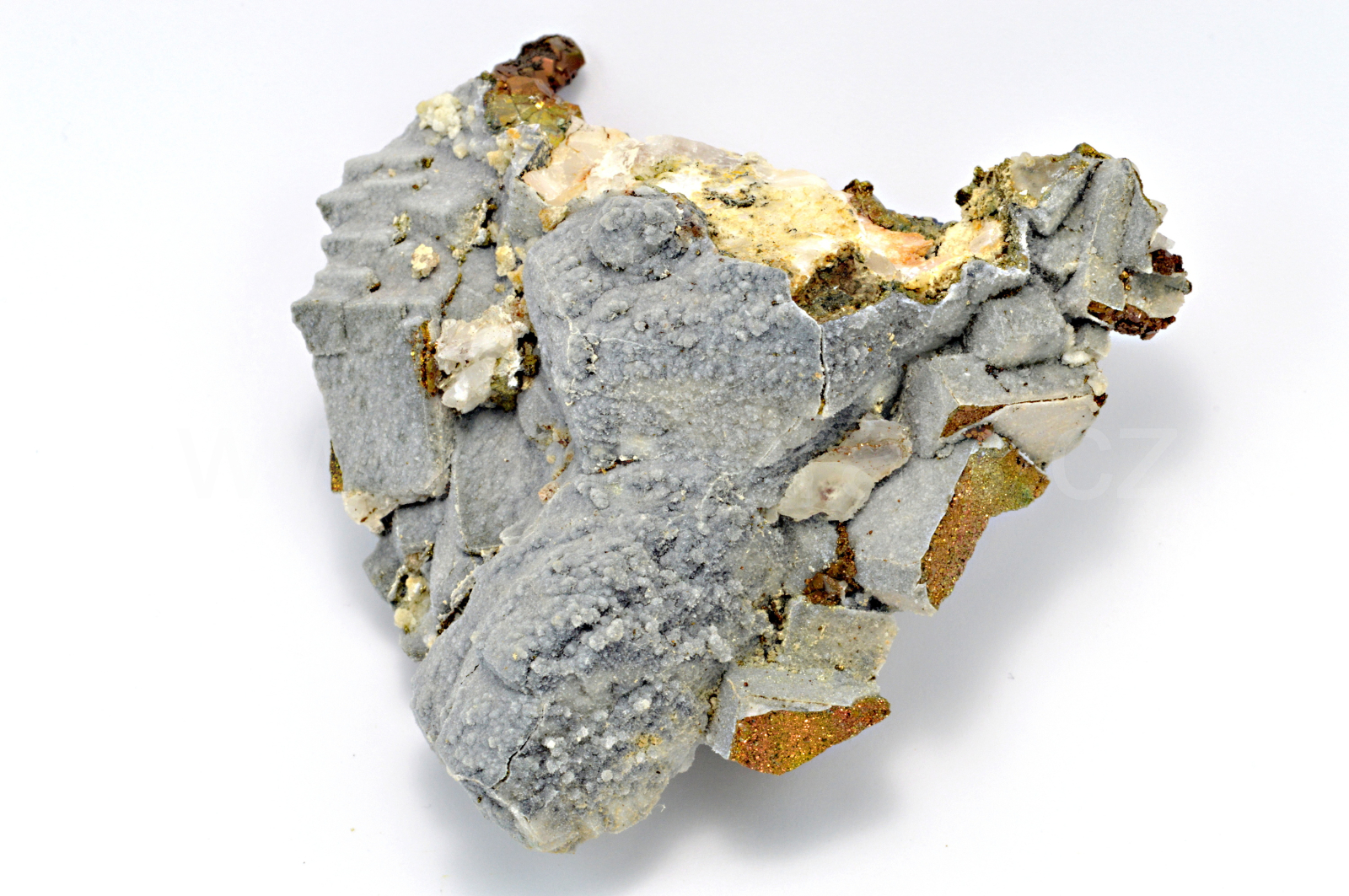 Kalcit kompletně pseudomorfuje kubické krystaly fluoritu. Vytváří mléčně bílé, matně lesklé, částečně průsvitné, kubické agregáty dosahující velikosti až 15 mm, které se navzájem prorůstají a na povrchu mají tenkou krustu z mikrokrystalického křemene. Tyto agregáty doprovází zlatavé, kovově lesklé krystaly pyritu a bezbarvé, bělavé krystaly kalcitu druhé generace. Na druhé straně vzorku jsou zlatavé s náběhovými barvami, kovově lesklé krystaly pyritu na které narůstají ténké krystaly kalcitu. Oboustranný vzorek. Velice pěkná a kvalitní pseudomorfóza, v dnešní době též složitě dostupný materiál díky své lokalitě.