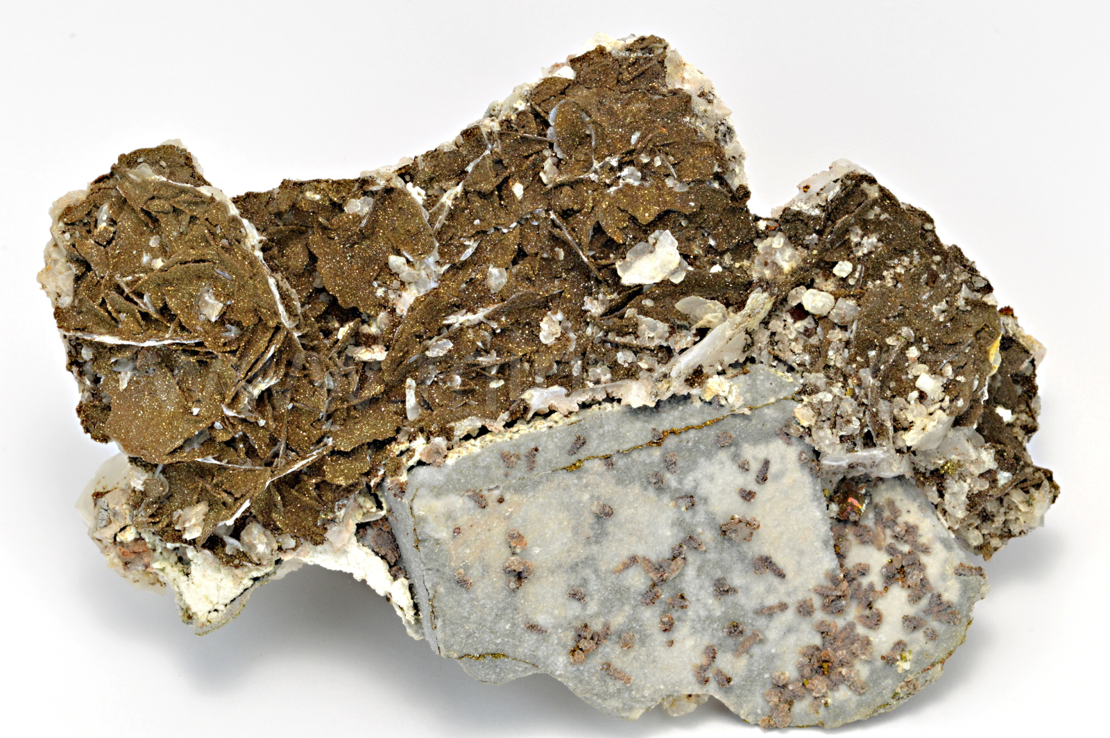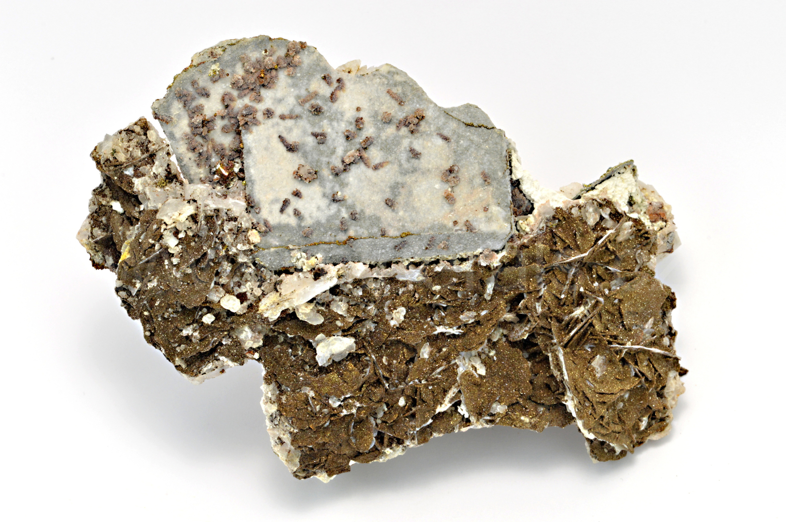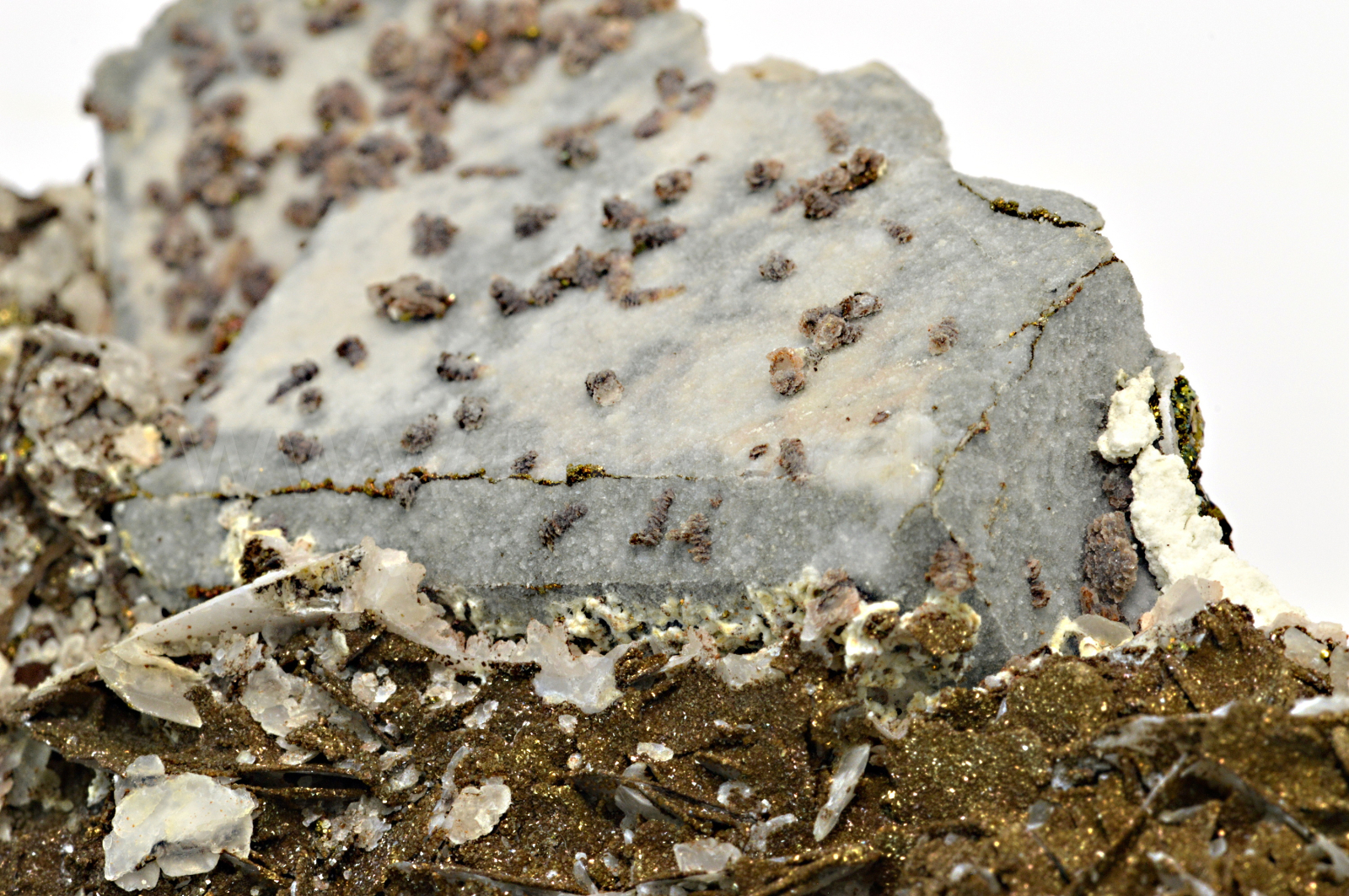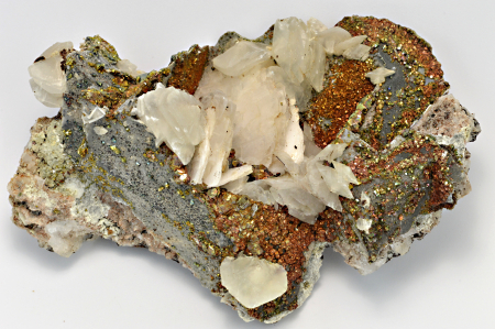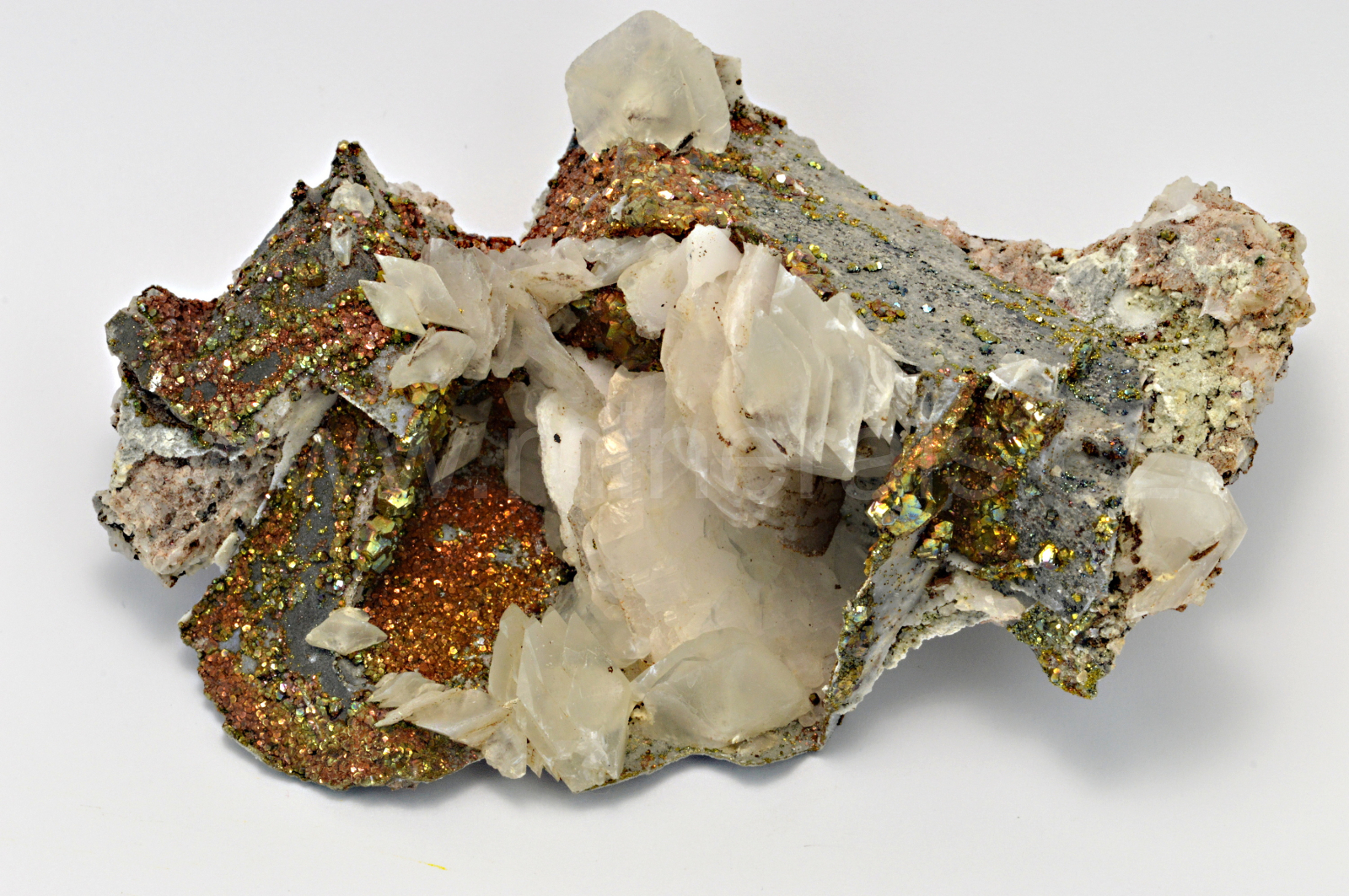 Kalcit kompletně pseudomorfuje kubické krystaly fluoritu. Vytváří mléčně bílé, matně lesklé, částečně průsvitné, kubické agregáty dosahující velikosti až 38 mm, které se navzájem prorůstají a na povrchu mají tenkou krustu z mikrokrystalického křemene. Tyto agregáty doprovází zlatavé, kovově lesklé krystaly pyritu a bezbarvé, bělavé krystaly kalcitu druhé generace. Na druhé starně jsou tenké stěny pseudomorfózy obrostlé zlatavými krystaly pyritu na které nasedají lístkovité krystaly kalcitu. Oboustranný vzorek. V dnešní době složitě dostupný materiál díky své lokalitě.