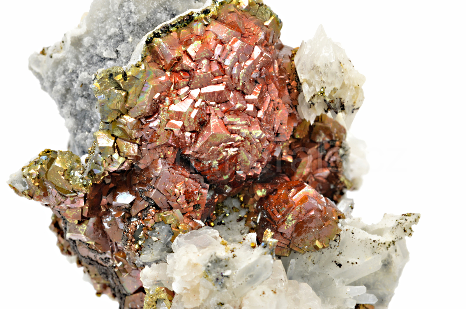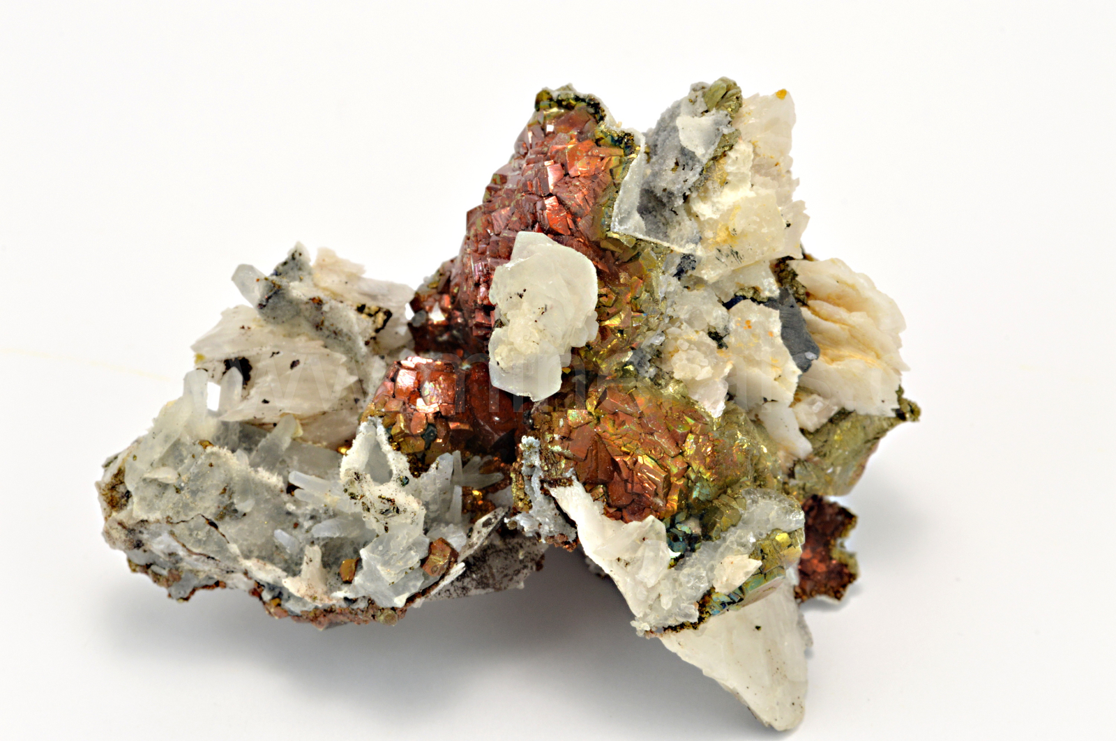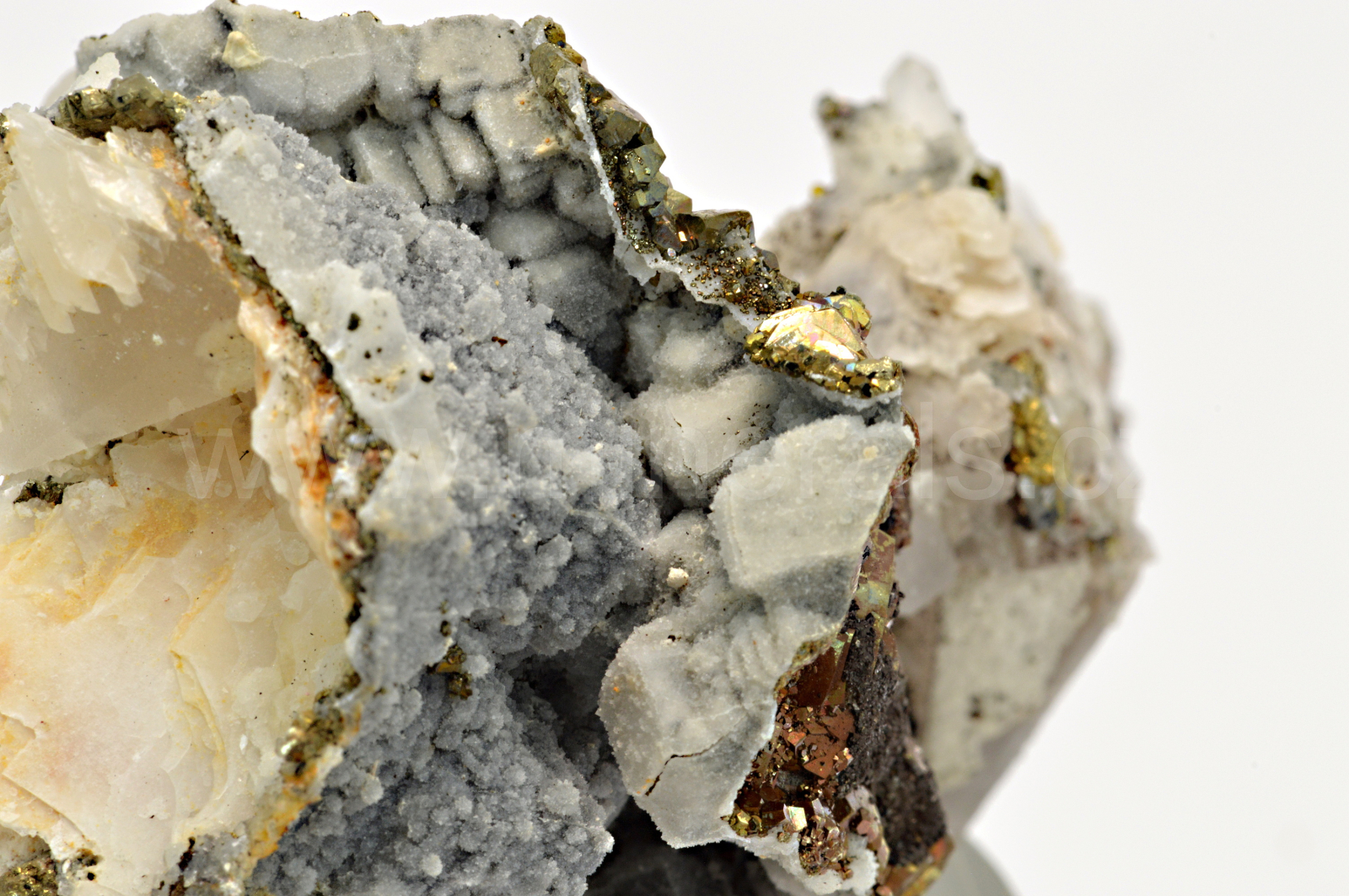 Kalcit kompletně pseudomorfuje kubické krystaly fluoritu. Vytváří mléčně bílé, matně lesklé, částečně průsvitné, kubické agregáty dosahující velikosti až 9 mm, které se navzájem prorůstají a na povrchu mají tenkou krustu z mikrokrystalického křemene. Tyto agregáty doprovází zlatavé, kovově lesklé krystaly pyritu a bezbarvé, bělavé krystaly kalcitu druhé generace. V dnešní době složitě dostupný materiál díky své lokalitě.