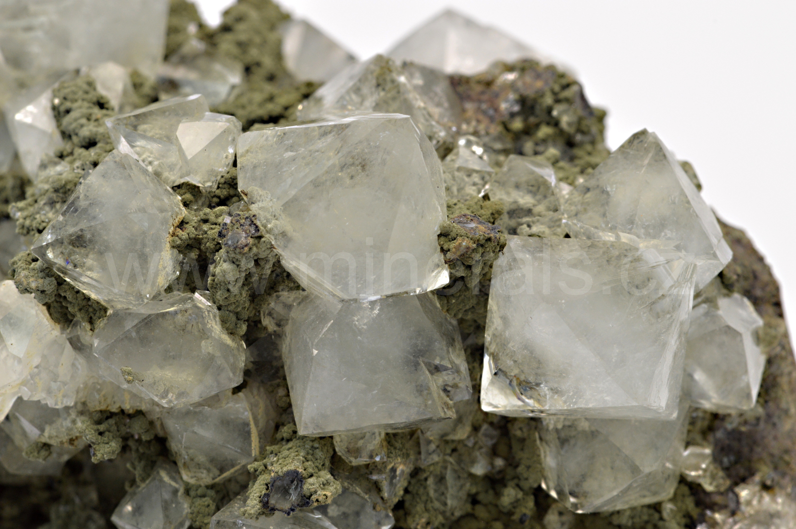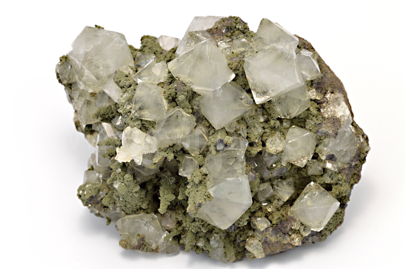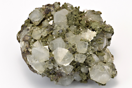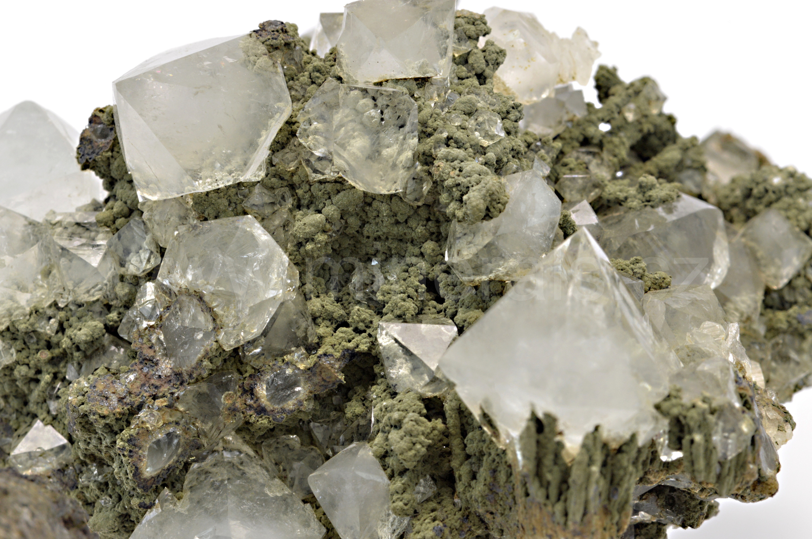 Křišťál (díky bezprismatickému vývoji nazývaný též beta-křemen) vytváří bezbarvé, skelně lesklé, průsvitné až průhledné, oboustranně ukončené krystaly dosahující velikosti až 14 mm, které se navzájem prorůstají a narůstají na temně zelenou diopsid-hedenbergitovou podložku. Malý, velmi kvalitní vzorek.