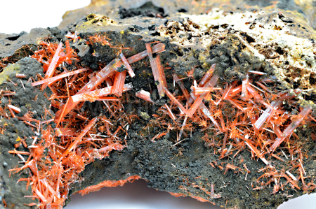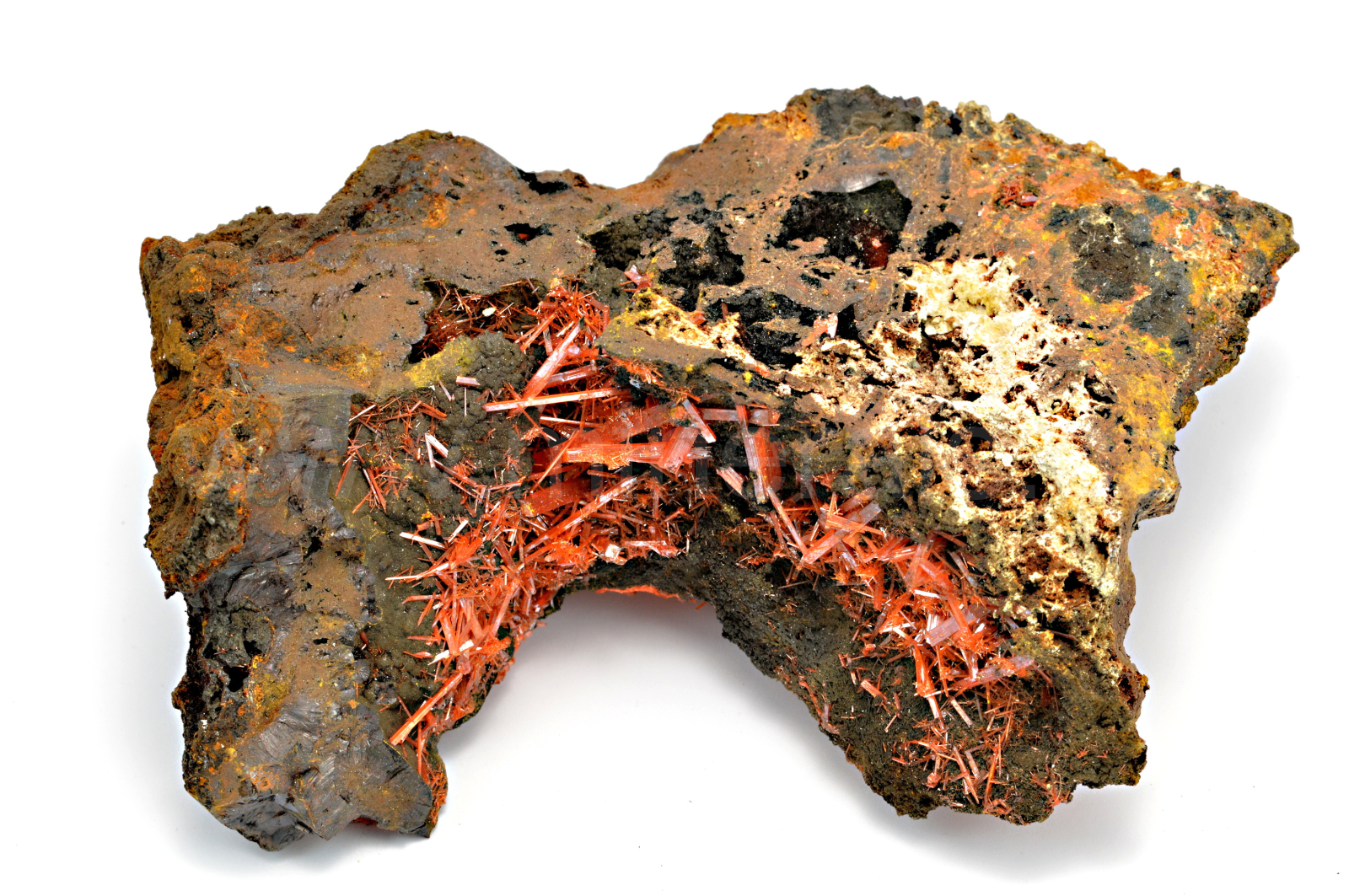 Krokoit vytváří sytě červené, oranžovočervené, průsvitné, skelně lesklé, protažené krystaly dosahující délky až 15 mm, které se navzájem prorůstají a narůstají na limonitickou podložku.
