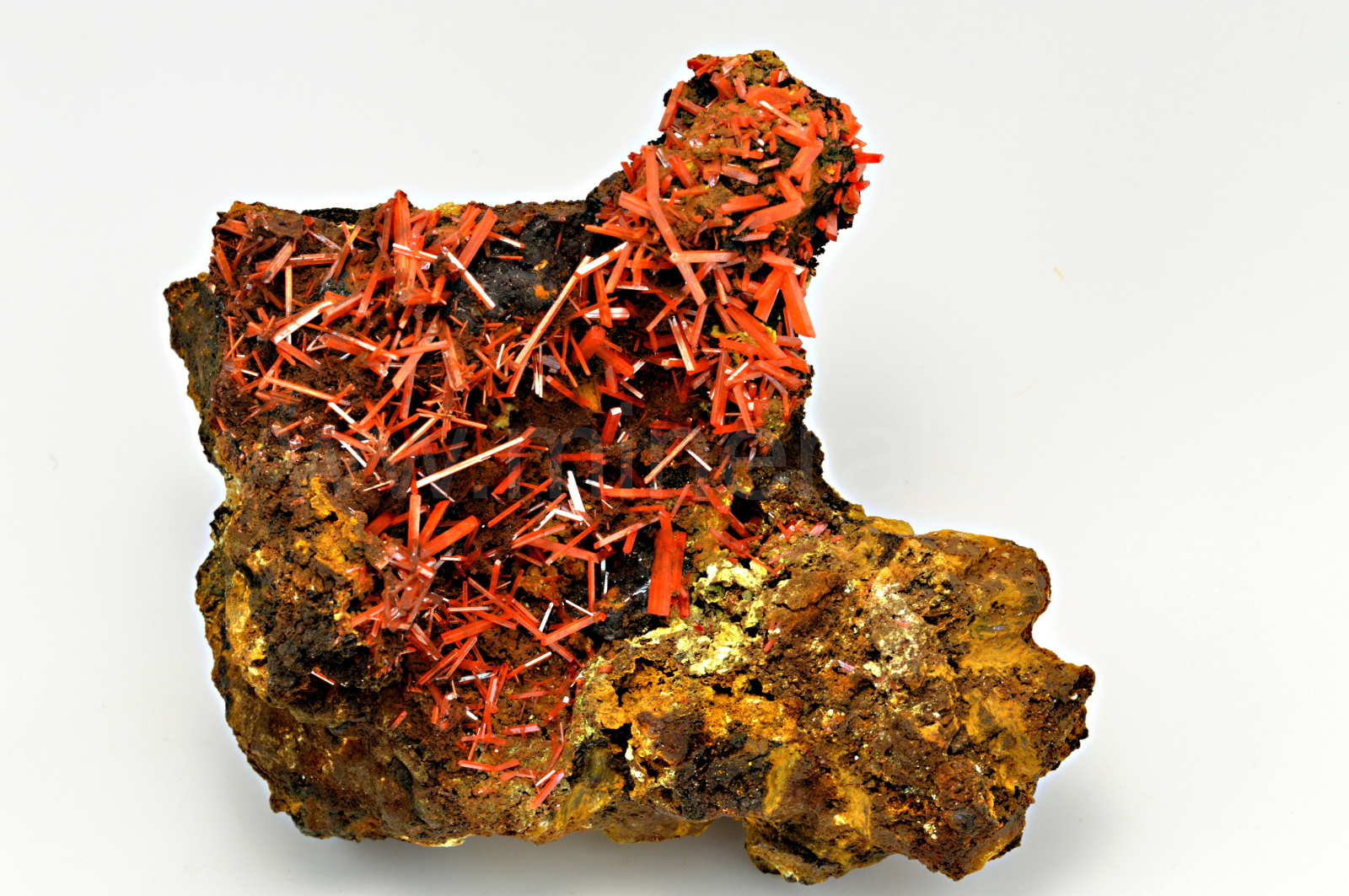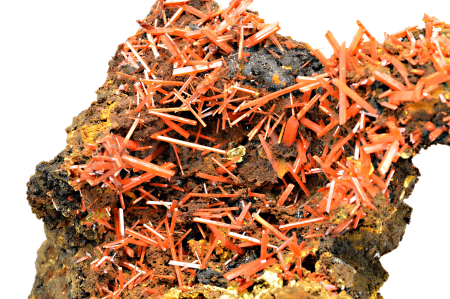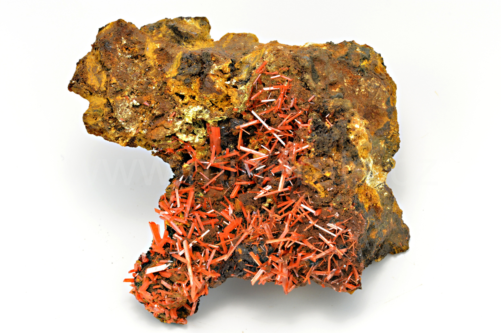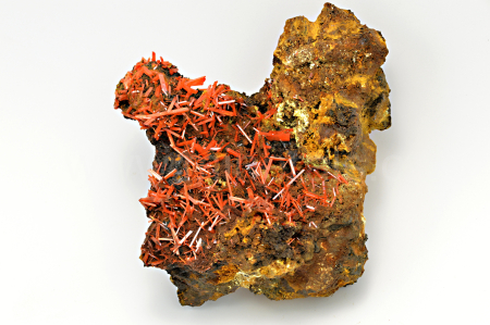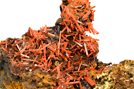 Krokoit vytváří sytě červené, oranžovočervené, průsvitné, skelně lesklé, protažené krystaly dosahující délky až 13 mm, které se navzájem prorůstají a narůstají na limonitickou podložku. Velice pěkný vzorek.