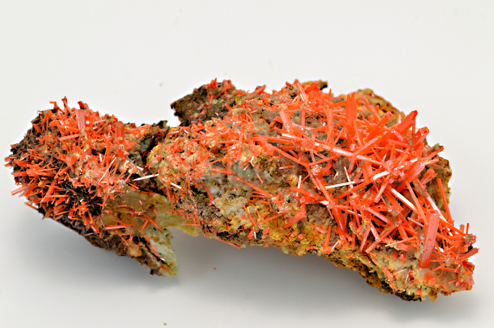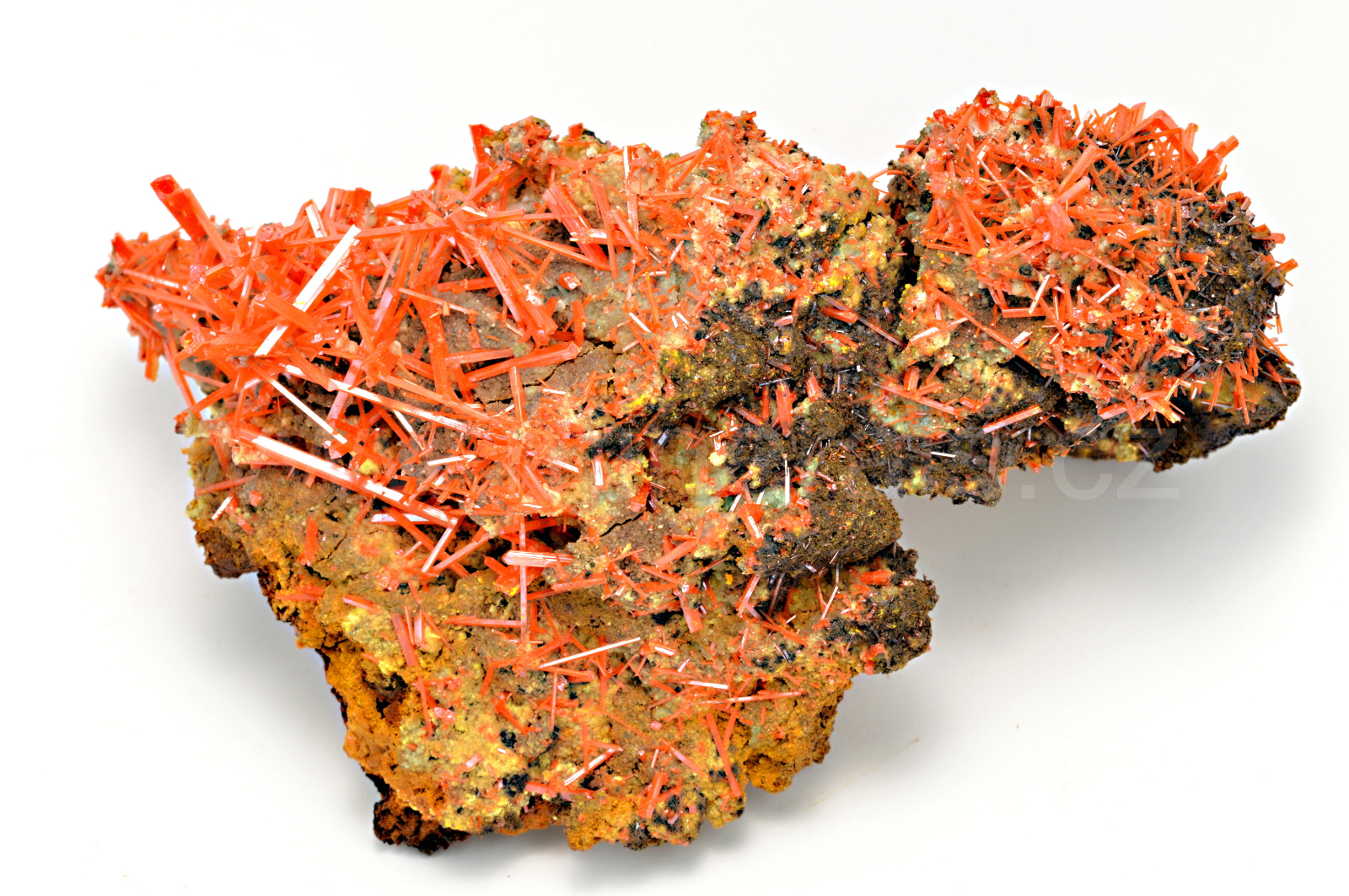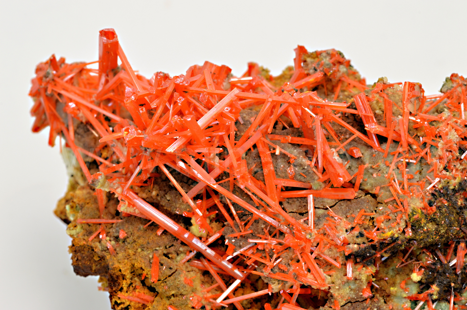 Krokoit vytváří sytě červené, oranžovočervené, průsvitné, skelně lesklé, protažené krystaly dosahující délky až 18 mm, které se navzájem prorůstají a narůstají na limonitickou podložku.