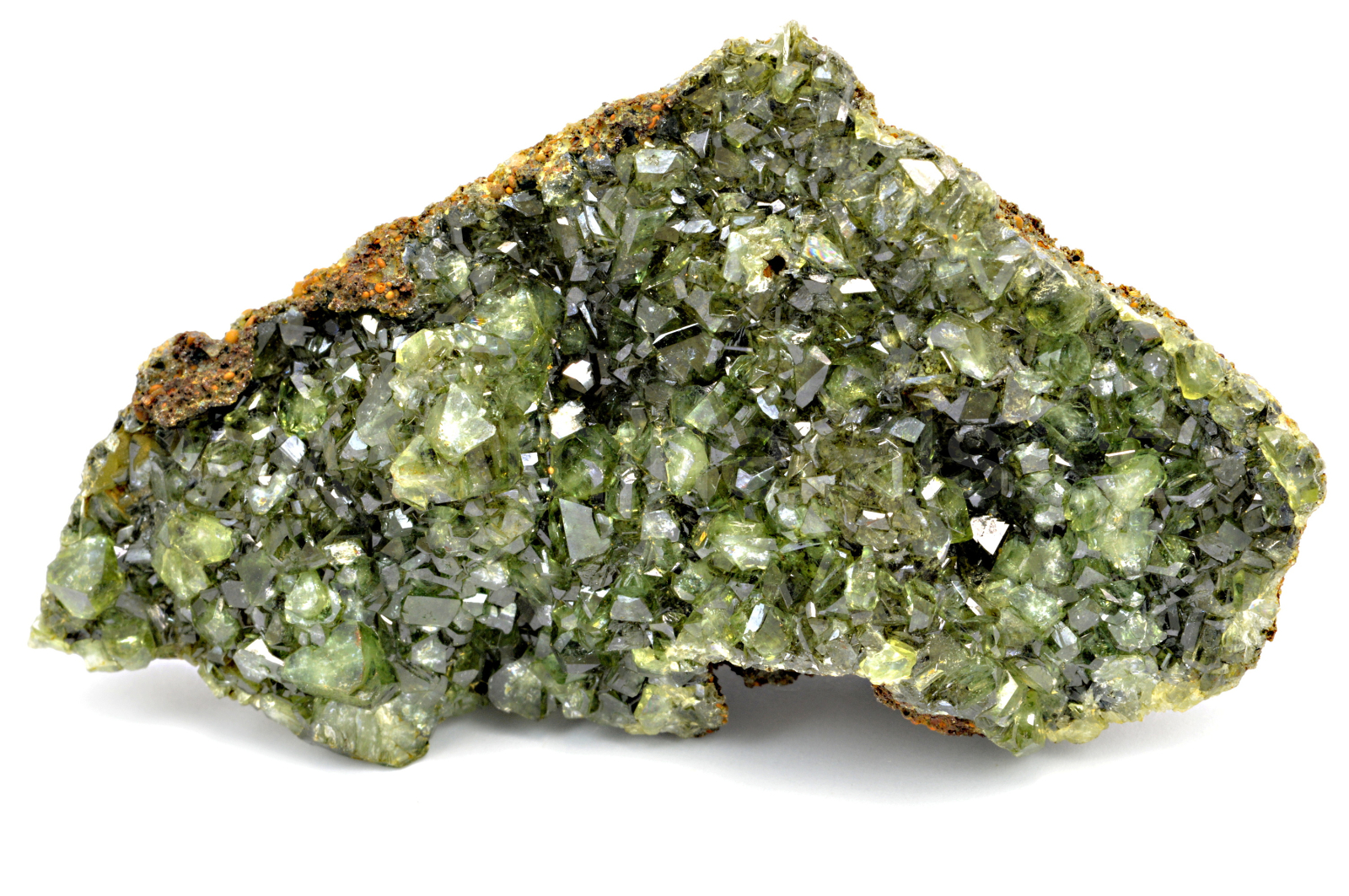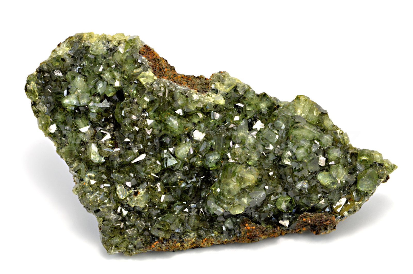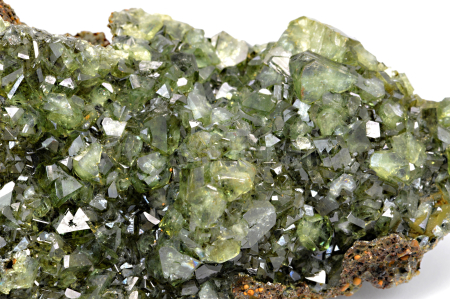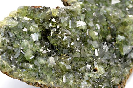 Ludlamit vytváří světle až tmavě zelené, průsvitné, skelně lesklé, pyramidální krystaly dosahující velikosti až 4 mm, které se navzájem prorůstají a pokrývají celou horní plochu. Vzorek má vynikající lesk krystalů.