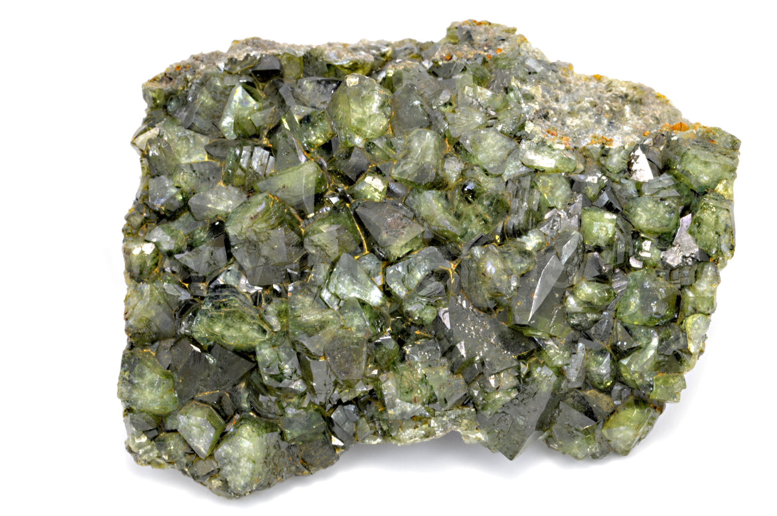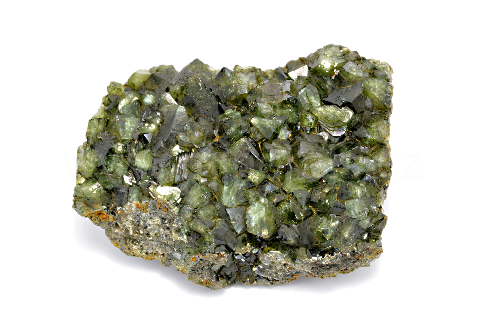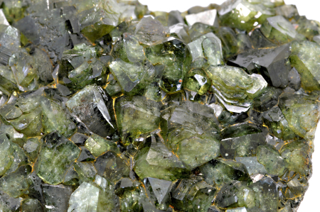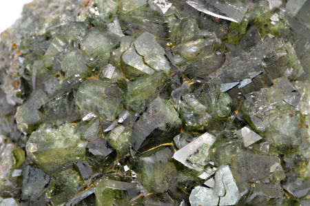 Ludlamit vytváří světle až tmavě zelené, průsvitné, skelně lesklé, pyramidální krystaly dosahující velikosti až 10 mm, které se navzájem prorůstají a tvoří skoro celý vzorek.