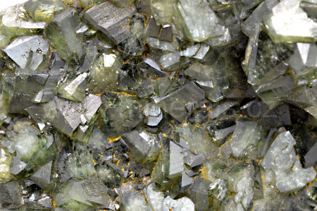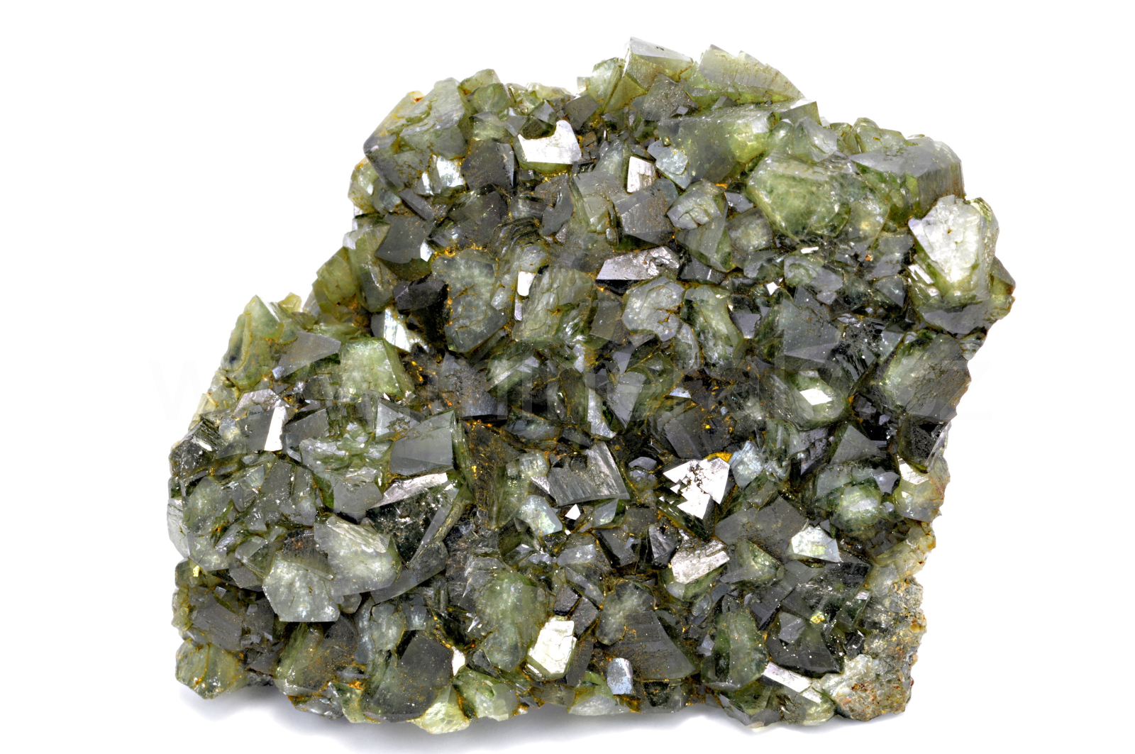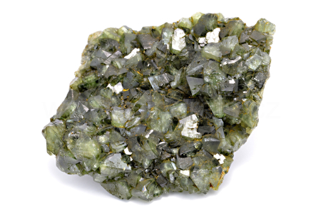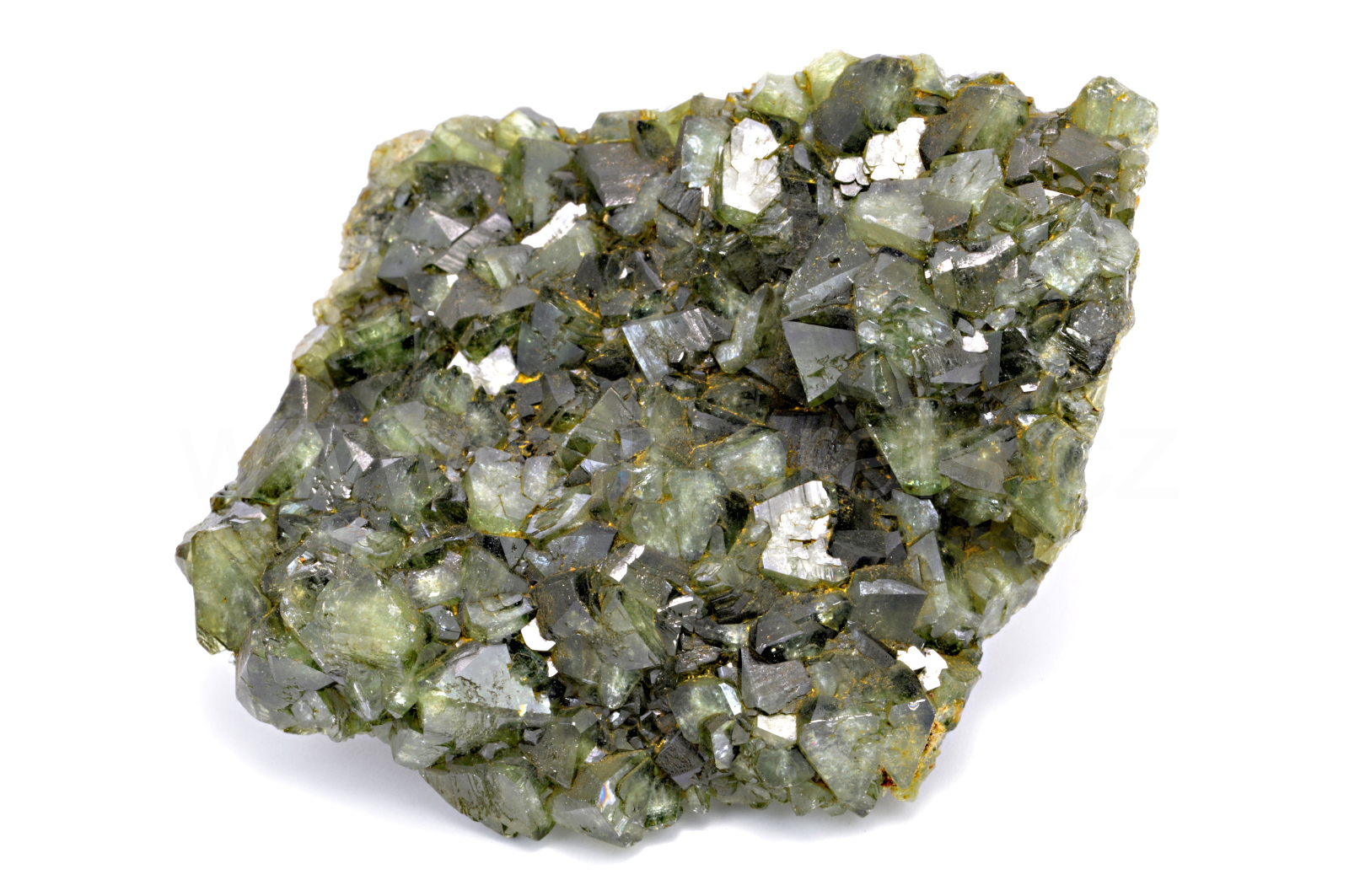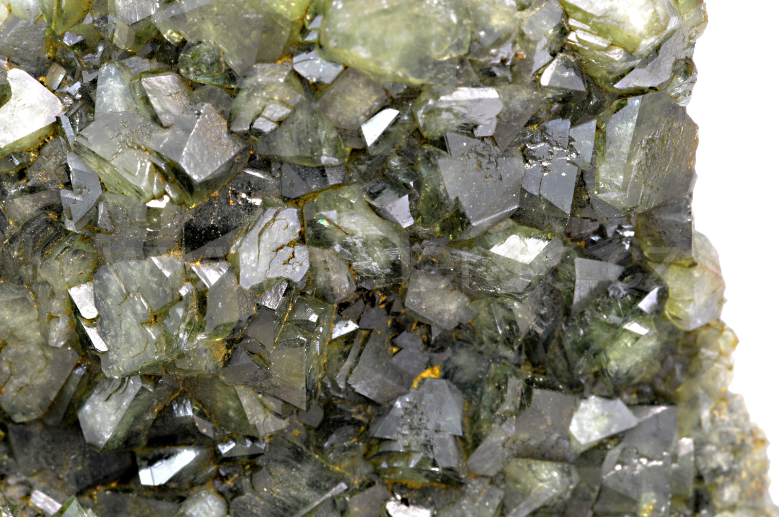 Ludlamit vytváří světle až tmavě zelené, průsvitné, skelně lesklé, pyramidální krystaly dosahující velikosti až 8 mm, které se navzájem prorůstají a tvoří skoro celý vzorek.