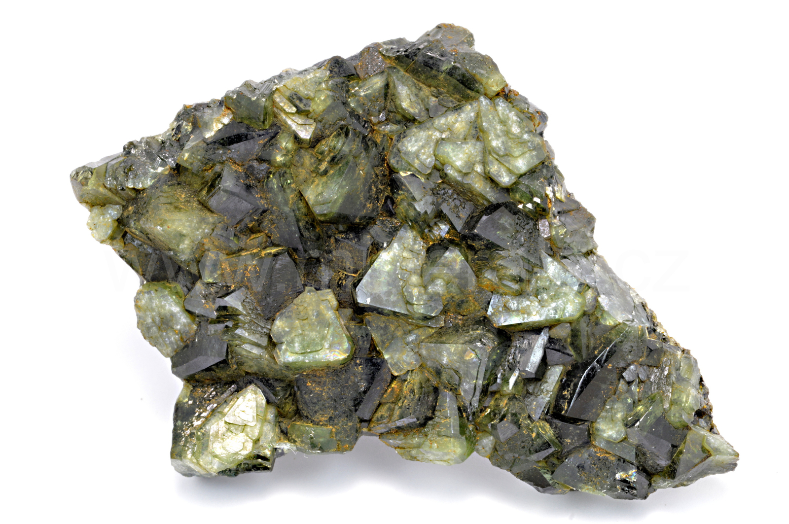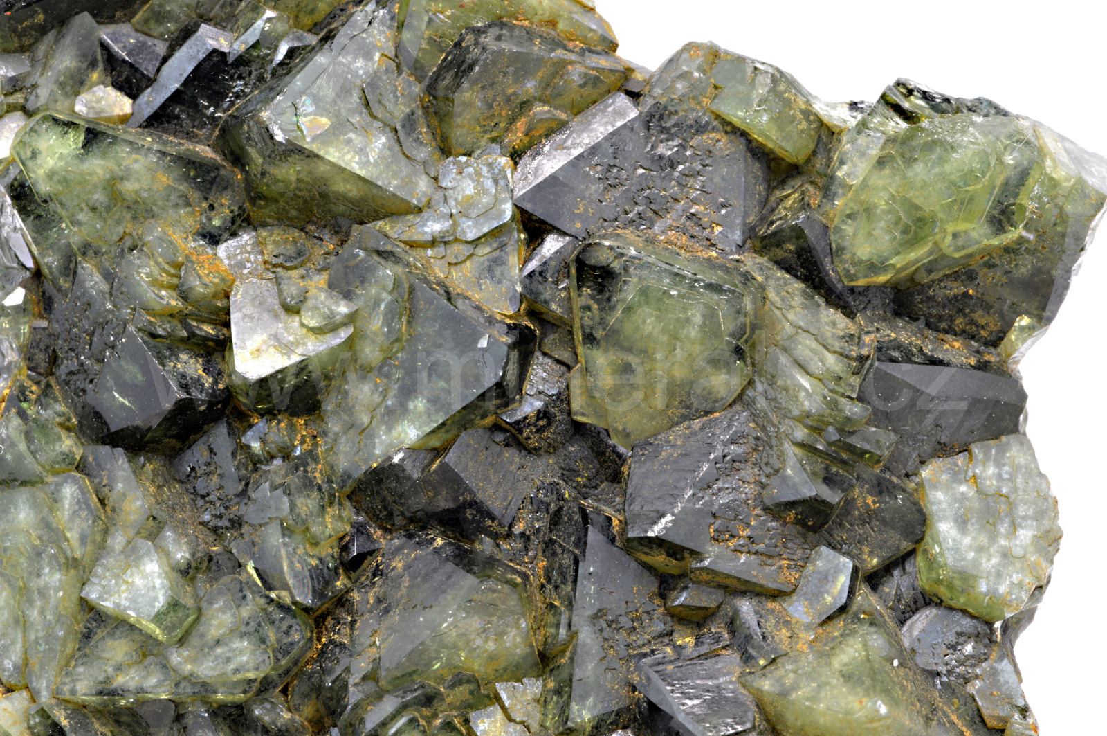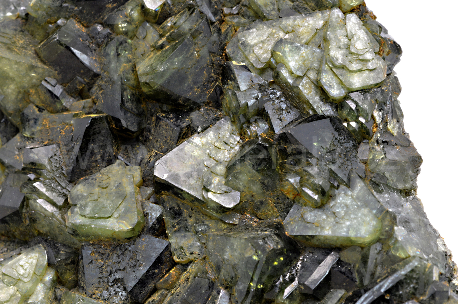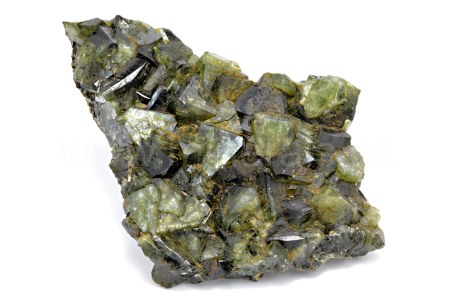 Ludlamit vytváří světle až tmavě zelené, průsvitné, skelně lesklé, pyramidální krystaly dosahující velikosti až 13 mm, které se navzájem prorůstají a tvoří skoro celý vzorek.
