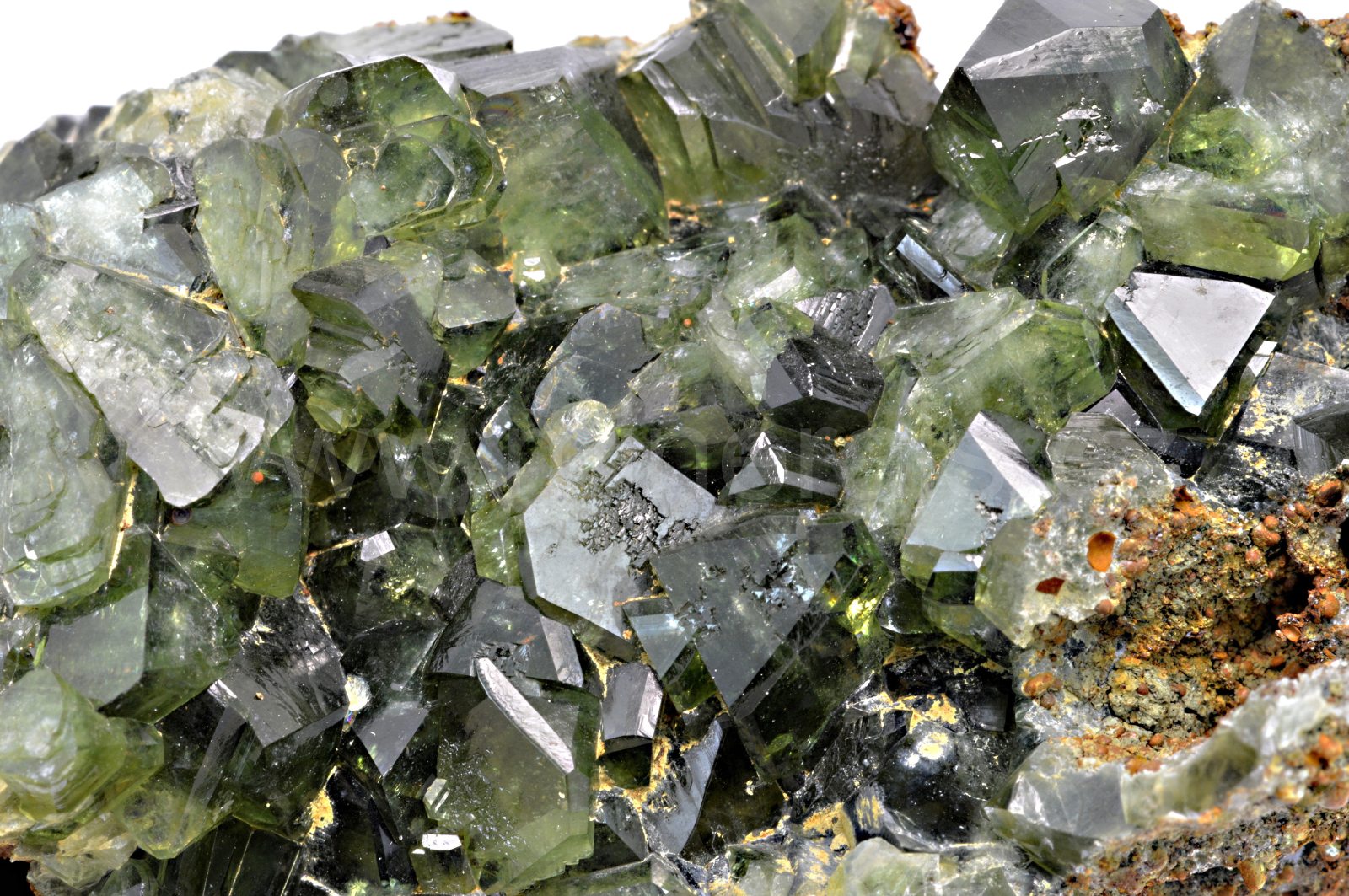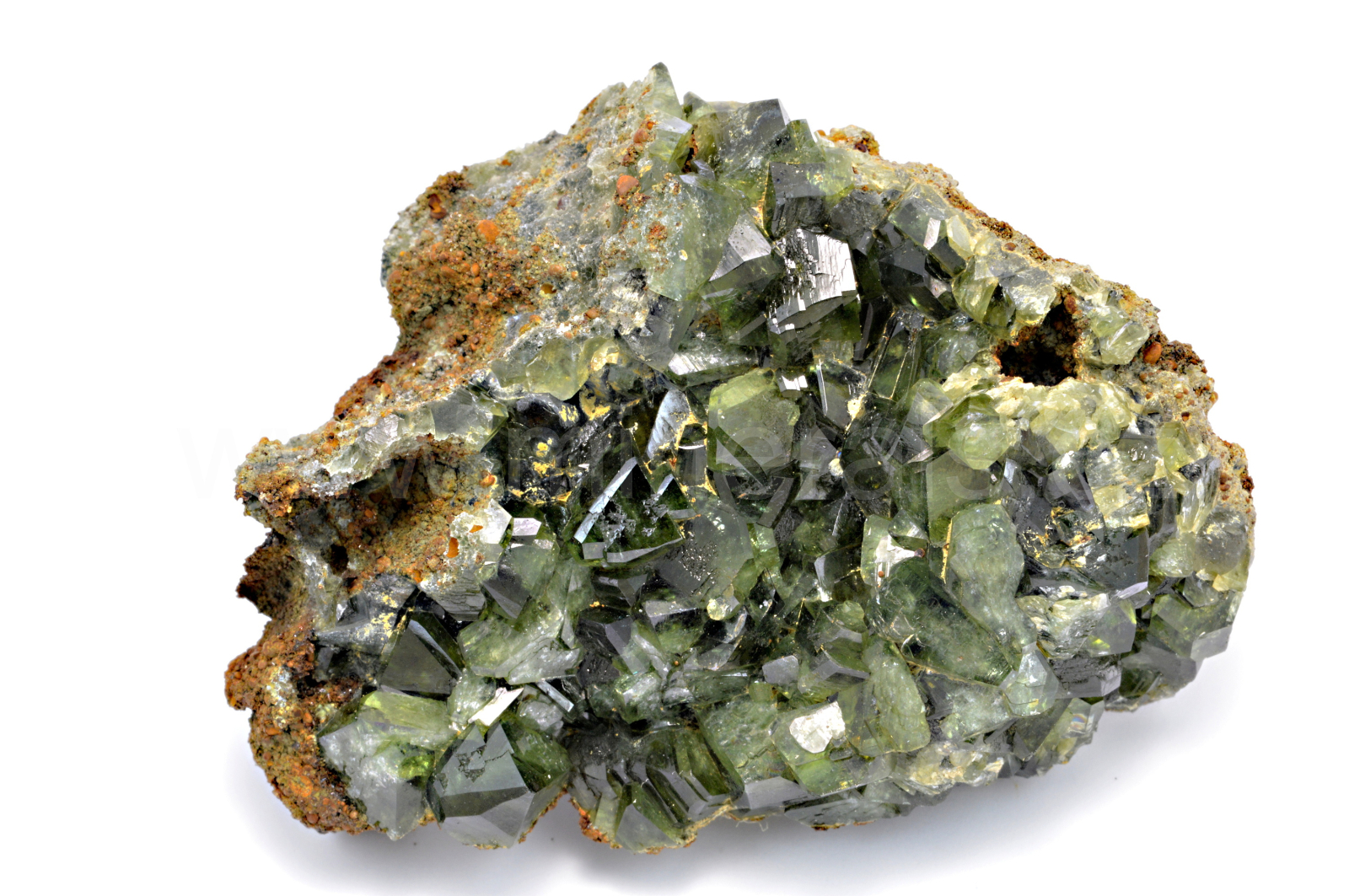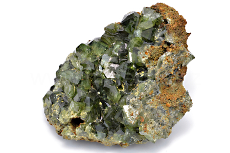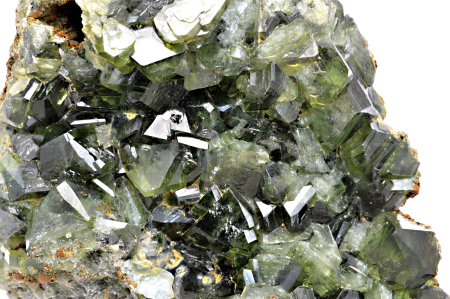Ludlamit vytváří světle až tmavě zelené, průsvitné, skelně lesklé, pyramidální krystaly dosahující velikosti až 10 mm, které se navzájem prorůstají. Vzorek má vynikající lesk krystalů.