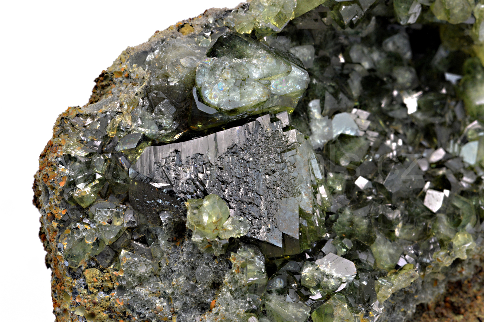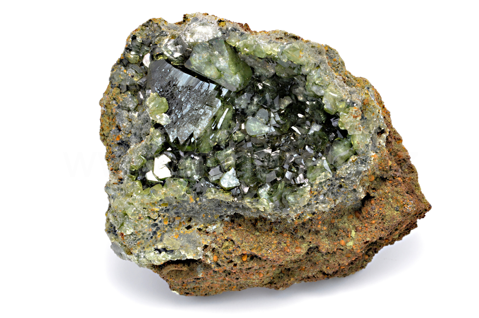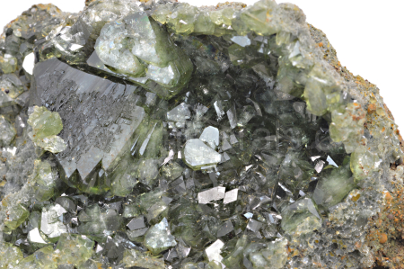 Ludlamit vytváří světle až tmavě zelené, průsvitné, skelně lesklé, pyramidální krystaly dosahující velikosti až 17 mm, které se navzájem prorůstají. Vzorek má vynikající lesk krystalů.
