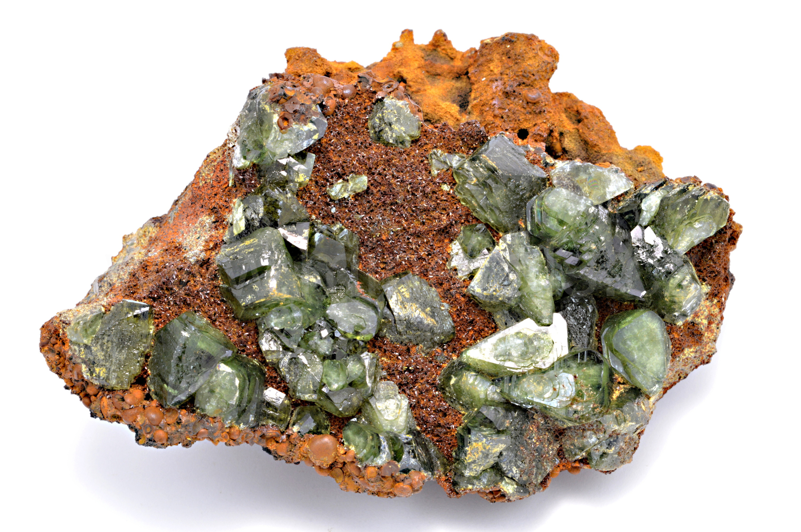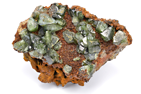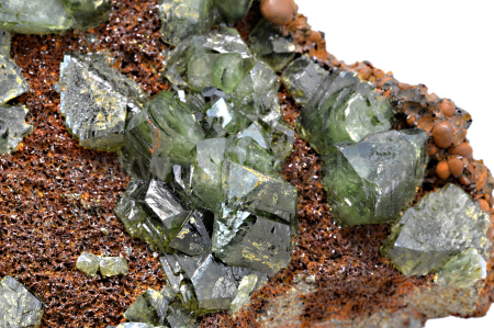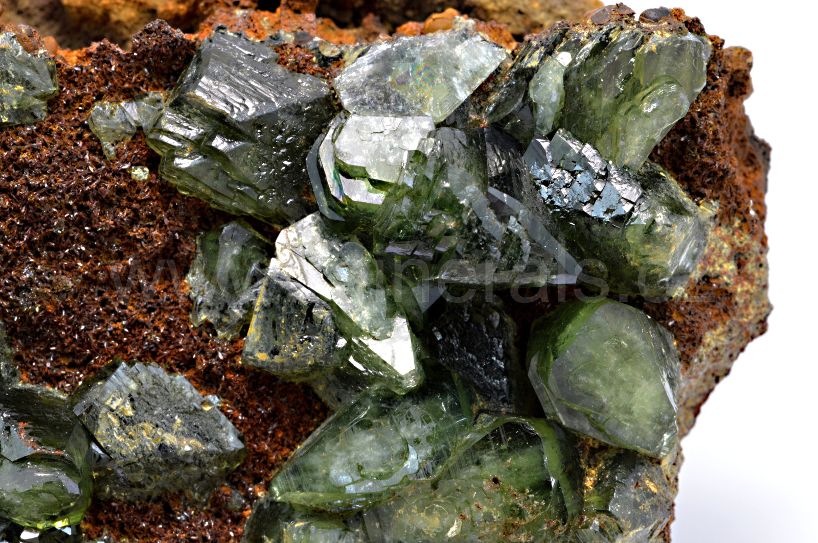 Ludlamit vytváří světle až tmavě zelené, průsvitné, skelně lesklé, pyramidální krystaly dosahující velikosti až 12 mm, které se navzájem částečně prorůstají. Vzorek má vynikající lesk krystalů.