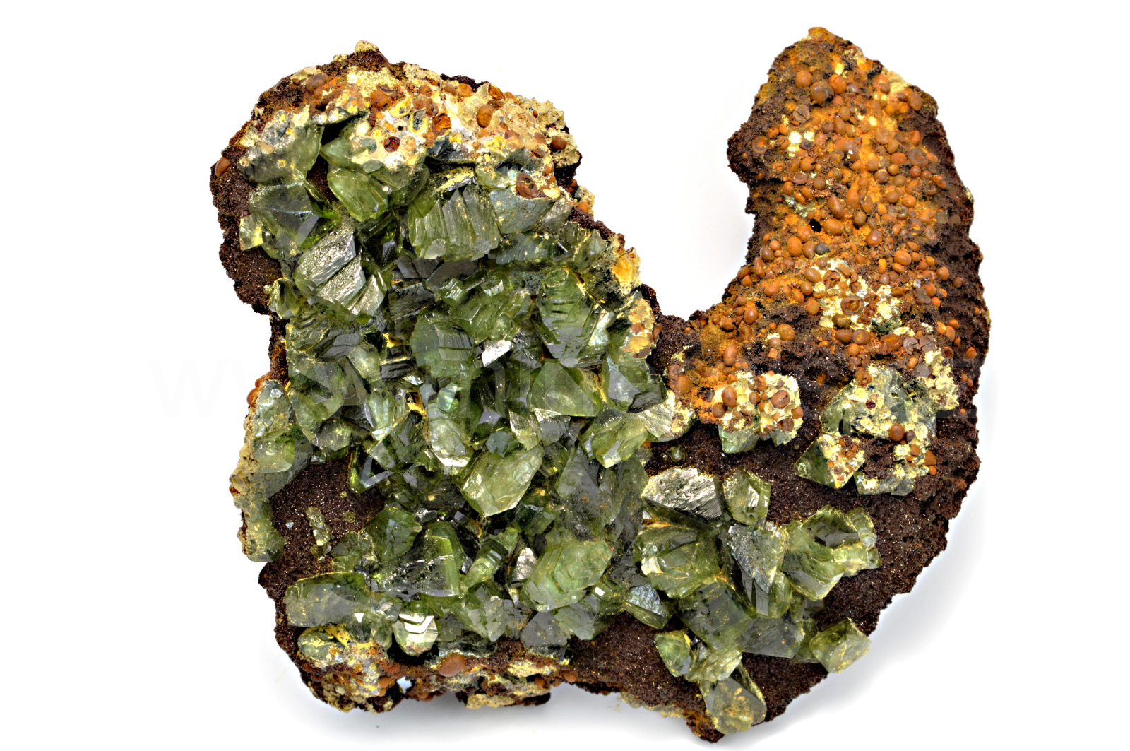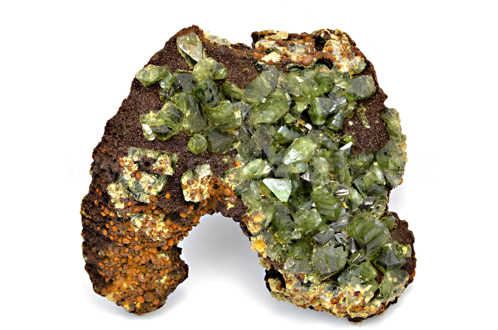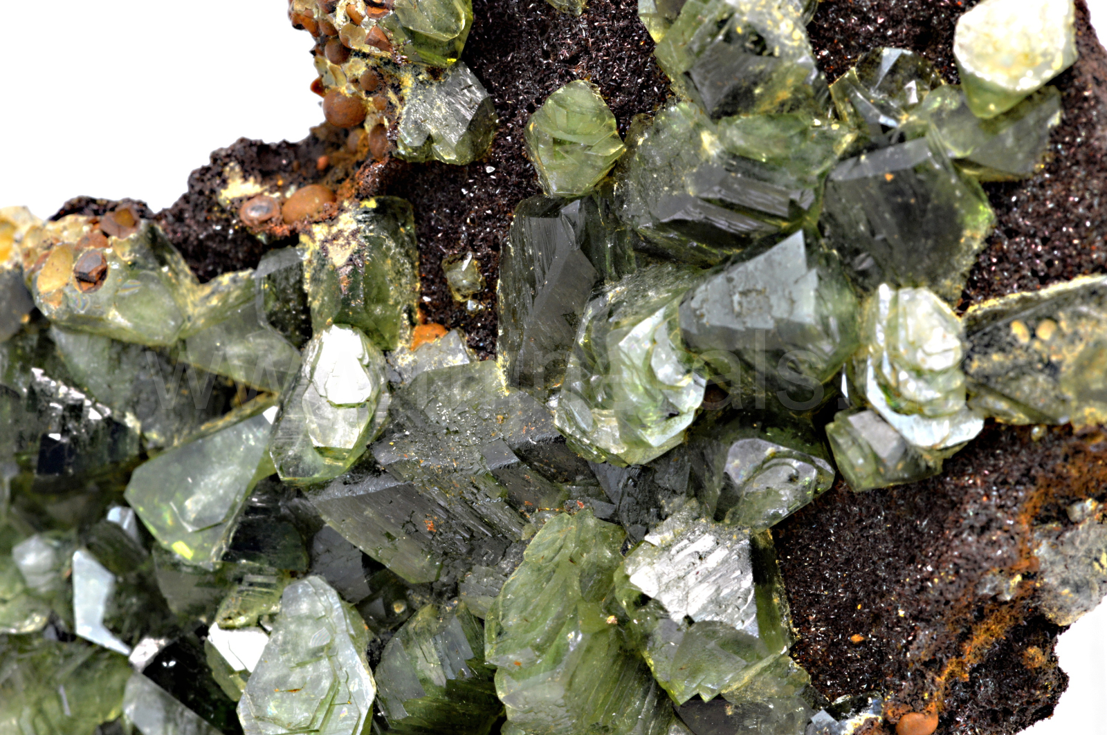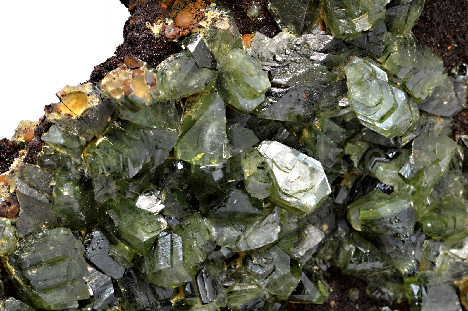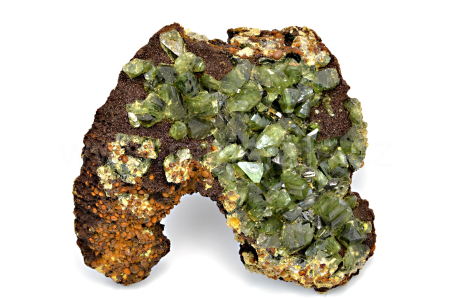 Ludlamit vytváří světle až tmavě zelené, průsvitné, skelně lesklé, pyramidální krystaly dosahující velikosti až 12 mm, které se navzájem prorůstají. Vzorek má vynikající lesk krystalů. V případě, že by se někomu nelíbil výčnělek s tzv. seménkovou rudou, lze ho lehce odstranit.