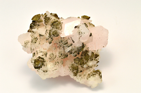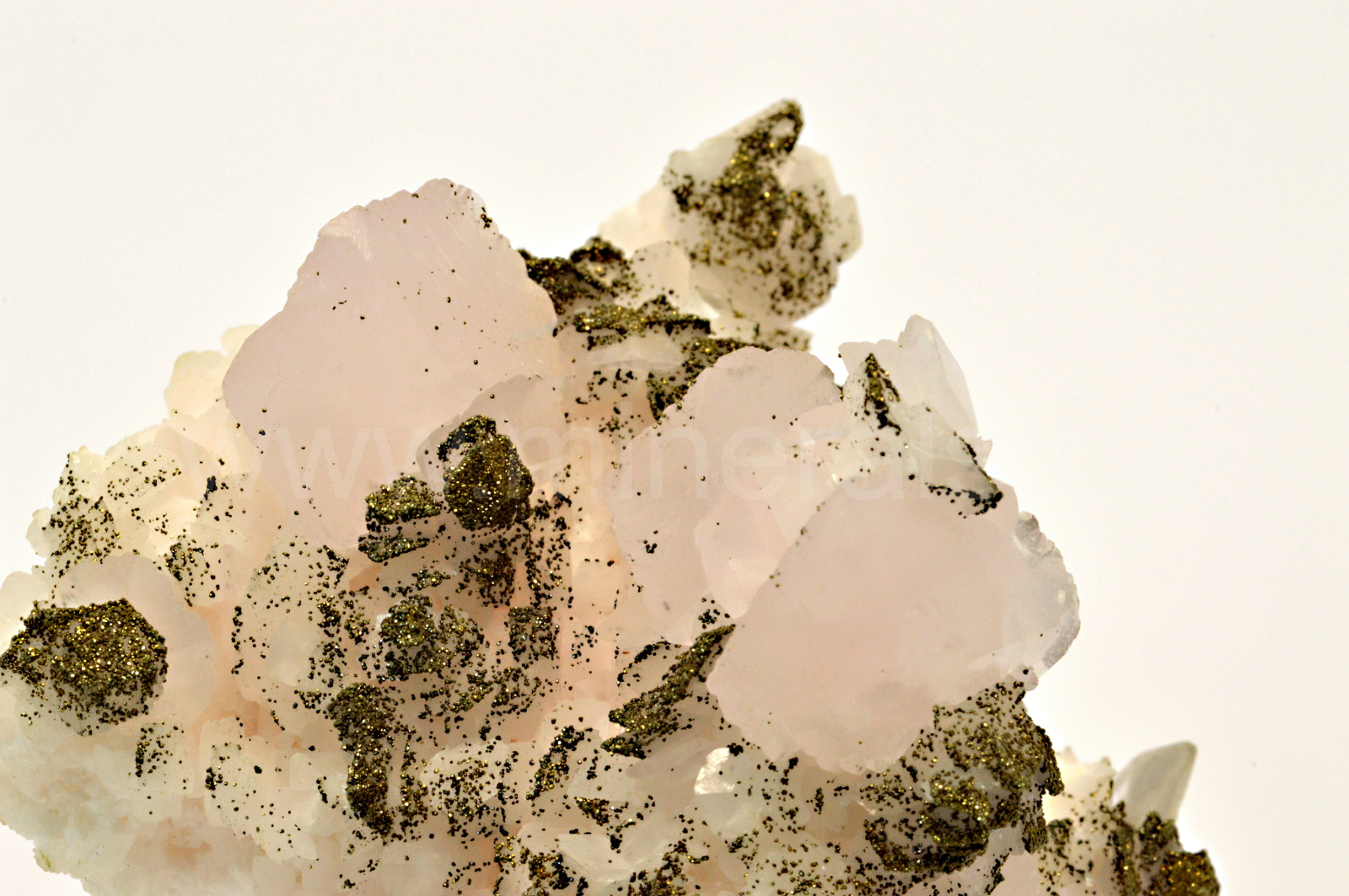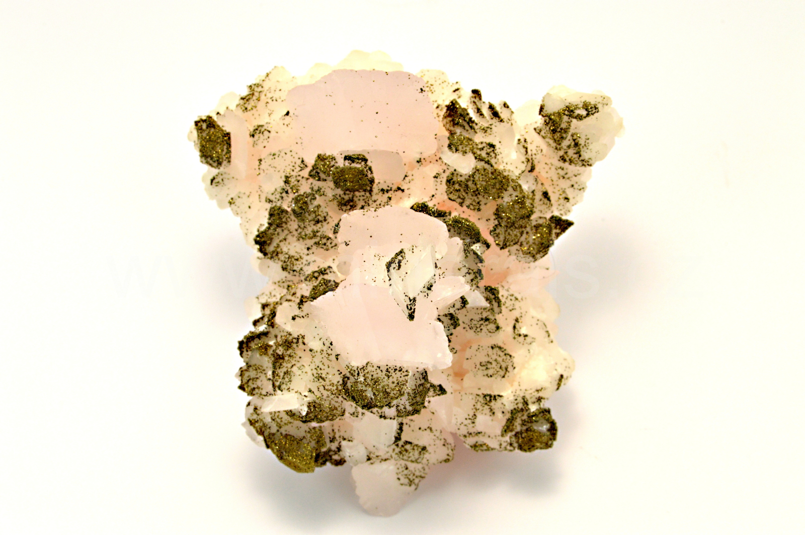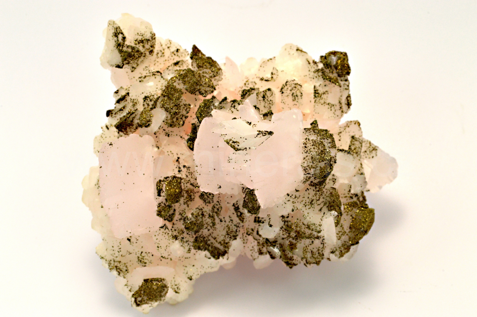 Manganokalcit vytváří narůžovělé, skelně lesklé, průsvitné, pěkně ohraničené krystaly dosahující velikosti až 17 mm, které se navzájem prorůstají a tvoří skoro celý vzorek. Na tyto krystaly nasedají drobné, zlatavé, kovově lesklé krystaly pyritu. manganokalcitu vypadají jako "pocukrované" pyritem. Velmi kvalitní a estetický vzorek.