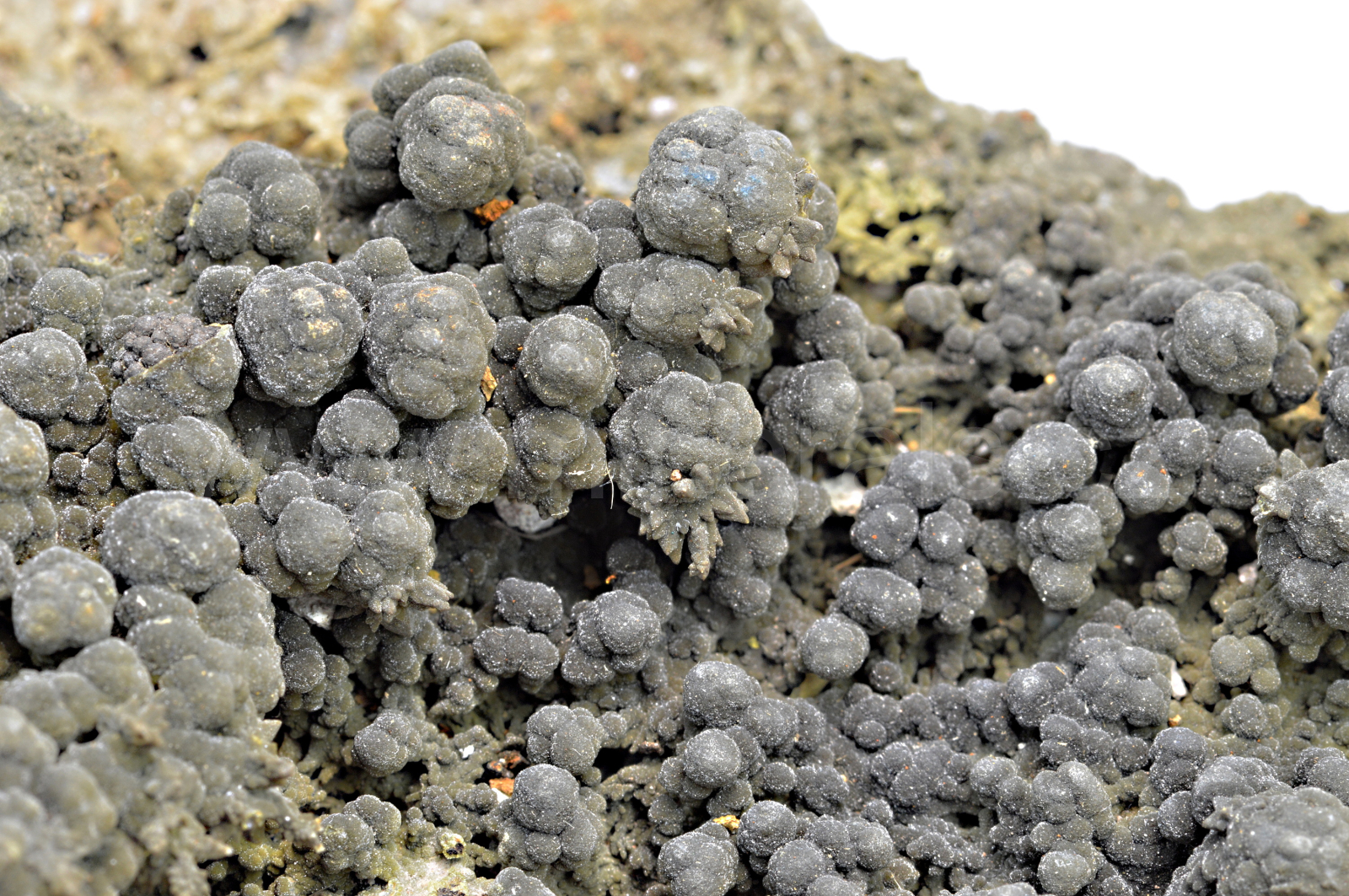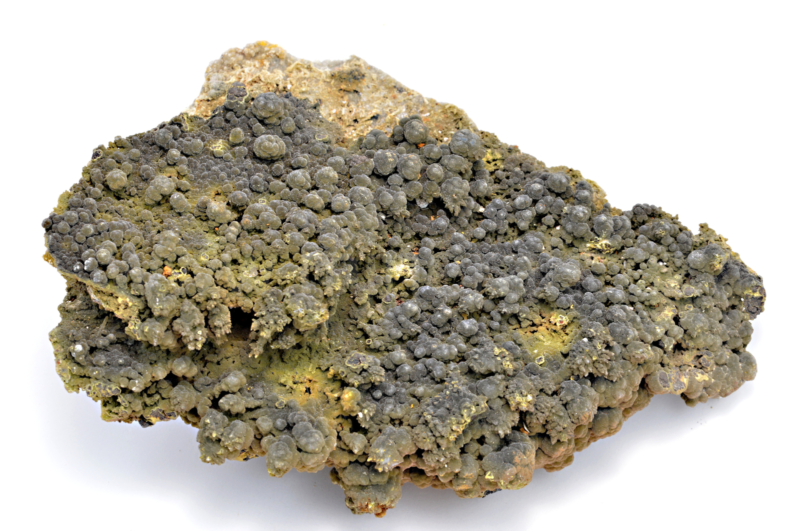 Mottramit vytváří olivově zelené, světle hnědé, hedvábně až sametově lesklé, neprůsvitné, drobné krystaly které srůstají do bradavičnatých, kulovitých a polokulovitých agregátů, které se navzájem prorůstají a pokrývají skoro celou horní plochu vzorku.