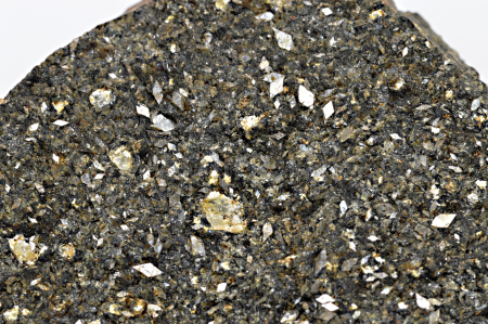 Naujakasit vytváří krémové, bělavé, šedavé, stříbřitě hedvábně lesklé, částečně průsvitné, lupenité krystaly dosahující velikosti až 3 mm, které prorůstají celým vzorkem a zarůstají do temně zelenočerného egirinu a arfvedsonitu. Oboustranný vzorek. Velmi vzácný minerál z typové a velmi těžko dostupné lokality.