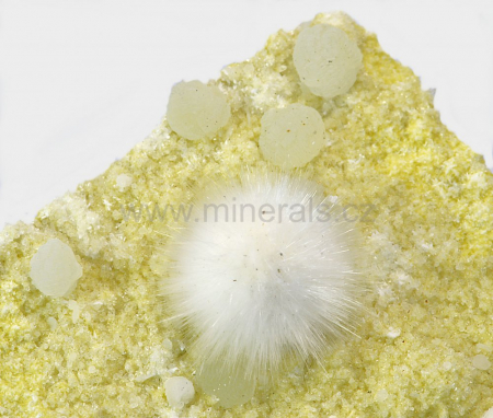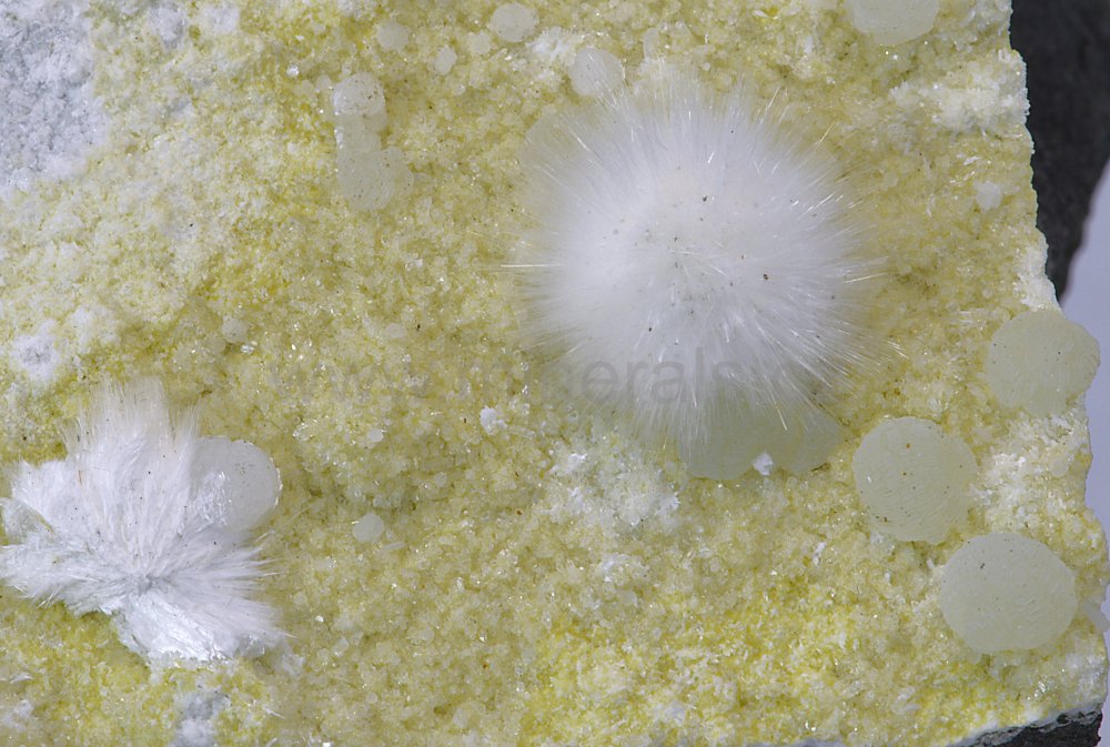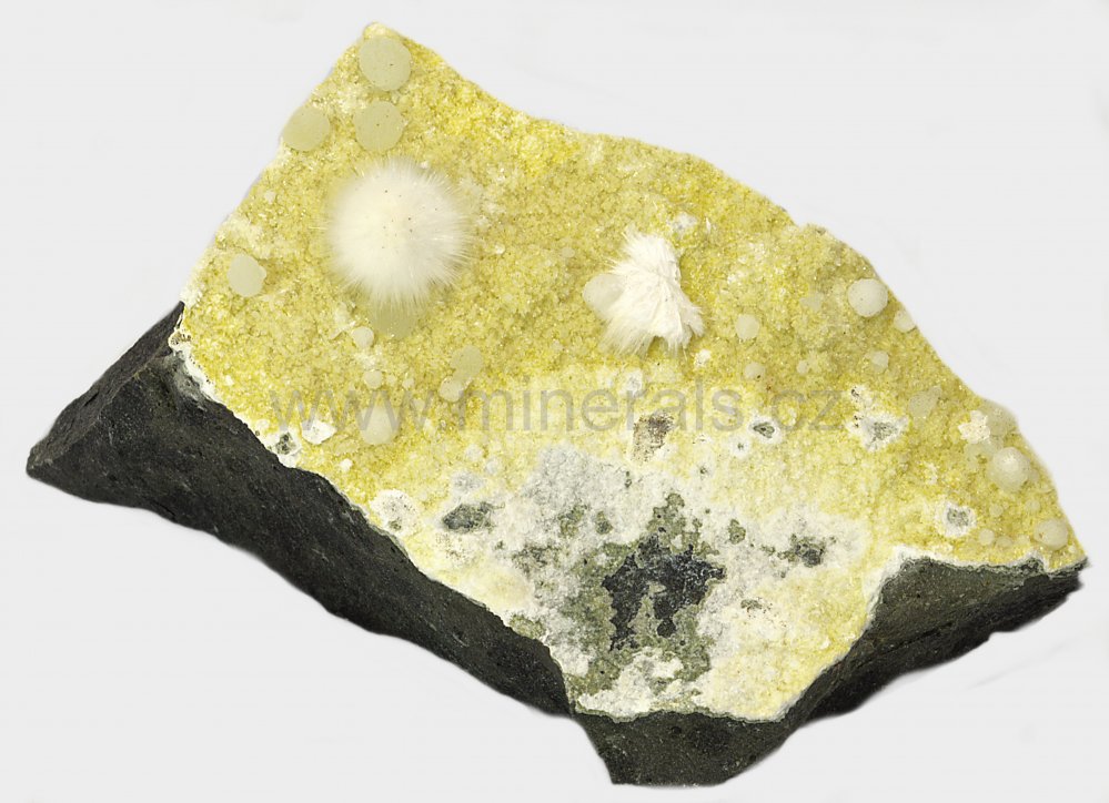 Okenit tvoří sněhově bílý, hedvábně lesklý, jehličkovitý, kulovitý agregát, který dosahuje velikosti cca 15 mm a narůstá na krustu tvořenou křemenem a prehnitem.Okenit doprovází nazelenalé polokulovité agregáty prehnitu.POZOR! Minerál nelze čistit pod vodou.