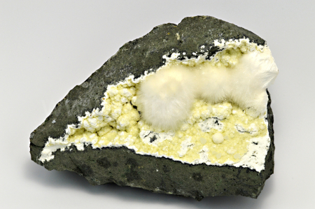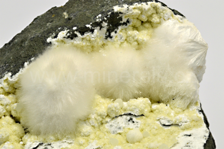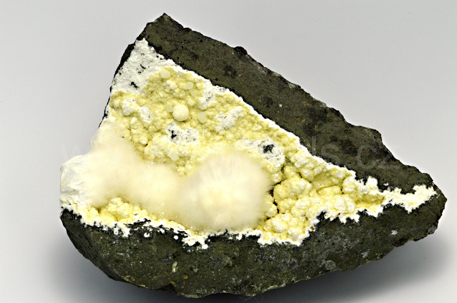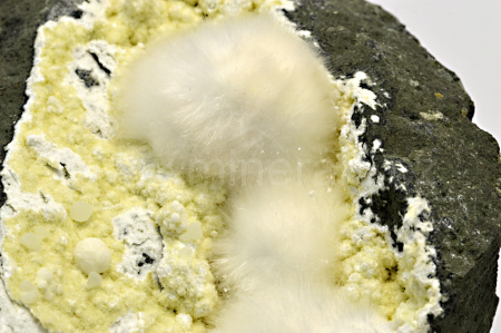 Okenit vytváří bezbarvé až mléčně bílé, hedvábně a perleťově lesklé, průsvitné, jehličkovité a vlasovité krystaly srůstající do kulovitých agregátů o velikosti až 25 mm, které se navzájem prorůstají. Okenit doprovází drobné, kulovité agregáty nazelenalého prehnitu a bílého gyrolitu. POZOR! Okenit se nesmí umývat pod vodou, protože by "zplihnul". Nemusíte se obávat, vzorek okenitu dokážeme odeslat v naprosto neporušeném stavu......