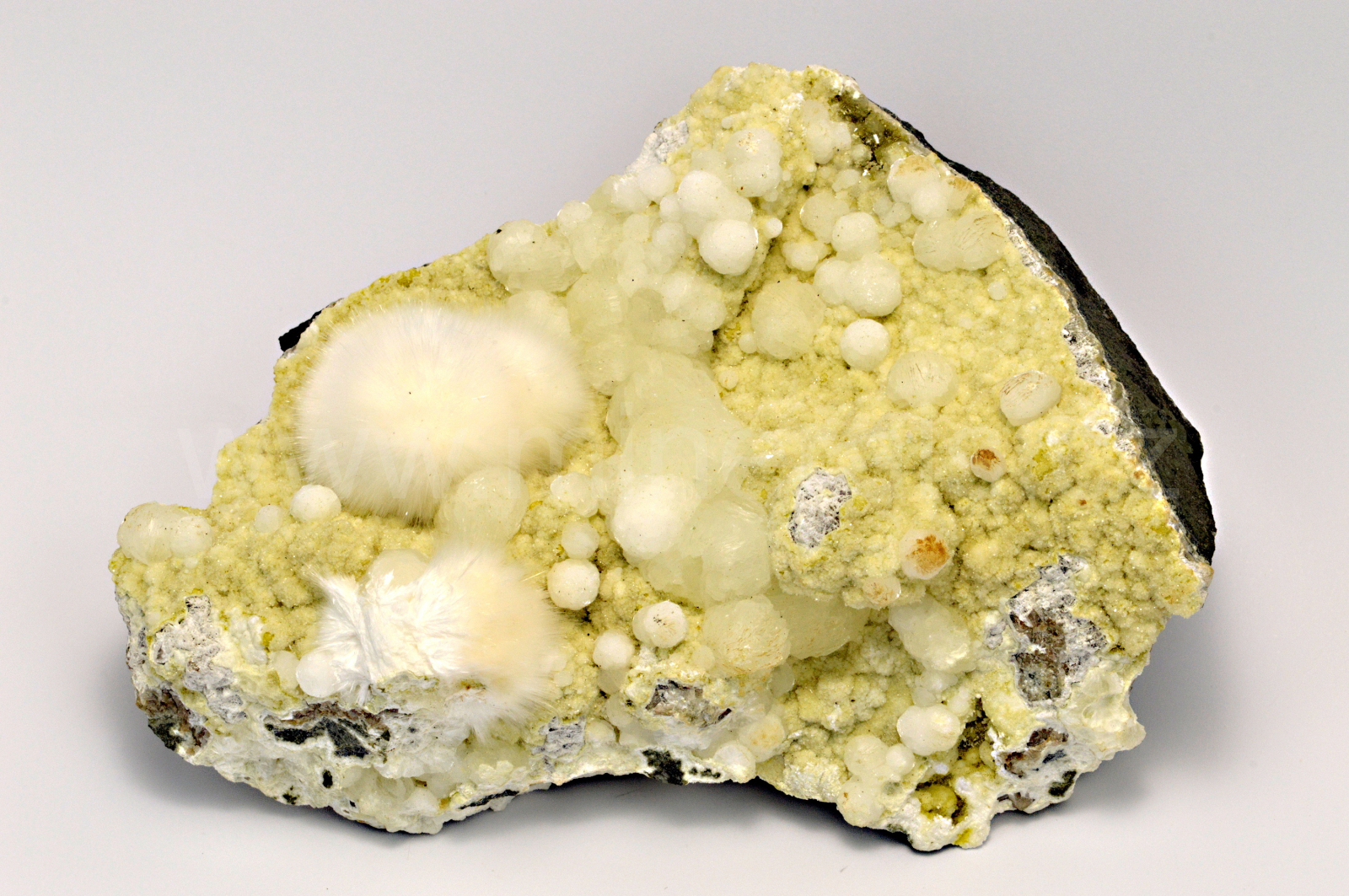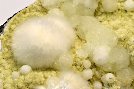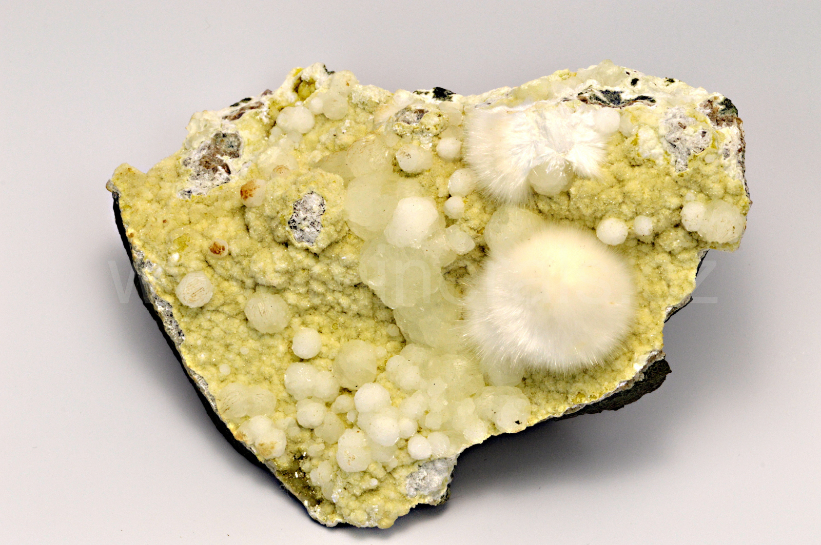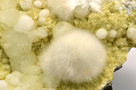 Okenit vytváří bezbarvé až mléčně bílé, hedvábně a perleťově lesklé, průsvitné, jehličkovité a vlasovité krystaly srůstající do kulovitých agregátů o velikosti až 27 mm, které se navzájem prorůstají. Okenit doprovází drobné, kulovité agregáty nazelenalého prehnitu a bílého gyrolitu. Velmi estetický vzorek! POZOR! Okenit se nesmí umývat pod vodou, protože by "zplihnul". Nemusíte se obávat, vzorek okenitu dokážeme odeslat v naprosto neporušeném stavu......